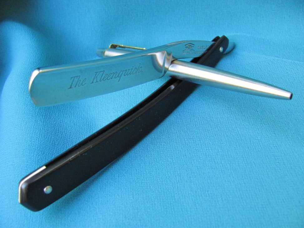 На полотне надпись "The Kleenquick" Бритва после реставрации, остались незначительные следы времени, что для её возраста простительно. Ручка рог, на не осевом пине была трещинка на ручке, она успешно заклеена, рог спасен. Ширина полотна 16 мм, обух 5 мм. Бритва заточена и готова к бритью. Цена : продана Taylor Show