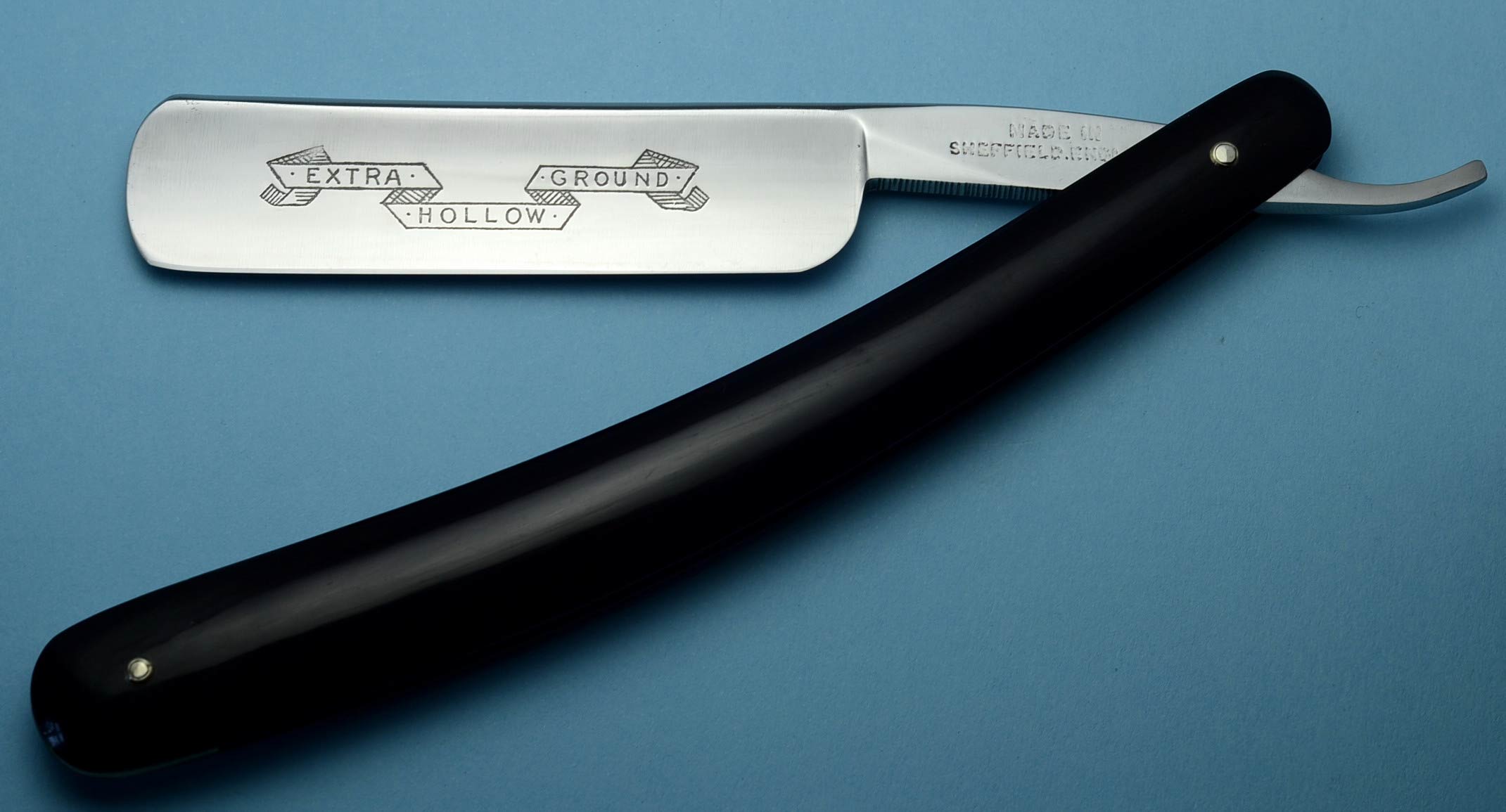 Уверен, что изготовлена в Шеффилде, на эрле проставлено название магазина в Лондоне на Пэлл Мэлл. Ручка из эбонита, в отличном состоянии, по-видимому, родная. Заточена и полностью готова к бритью. Ширина полотна 16 мм, толщина в обушке чуть меньше 4.5 мм. Цена 50 евро, доставка включена.