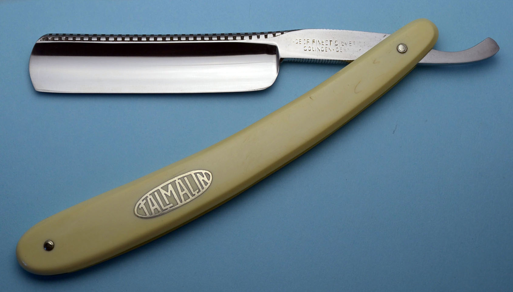 Надпись на ручке: TALMALIN Ручка из целлулоида, в хорошем состоянии. Обушок с узором - видно на фото. Особо хочу отметить SILVER STEEL - очень уважаю широких немцев из этой стали. Заточена и полностью готова к бритью. Ширина полотна 19 мм, толщина в обушке 5 мм. Spoiler Show