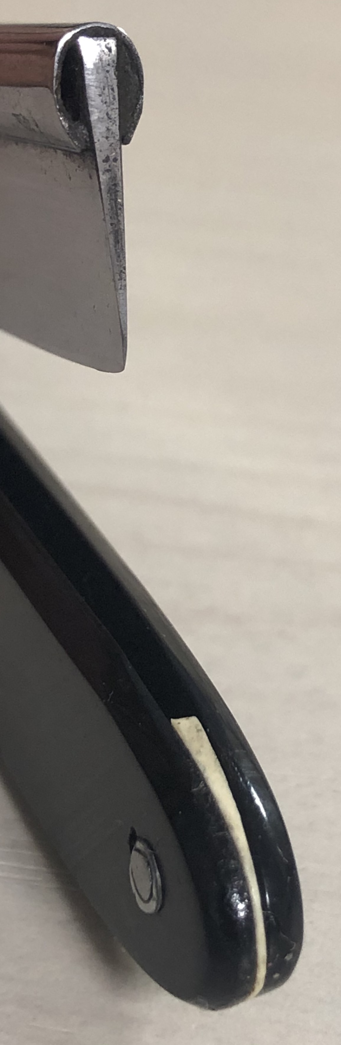 Бритва в очень хорошем состоянии для своих лет. Разобрал, немного освежил металл и снова собрал.Следов активного пользования и уточки клинка не замечено. Родную оправу не стал менять из за небольшой трещинки, которую намертво проклеил и зашлифовал.Кромочка равномерна по всей длине. Сталь чистая от разного рода видимых дефектов. Очень удобная и приятная бритва, во всех отношениях. Будет идеальным вариантом для новичка и просто в коллекцию, так как думаю что бритва достаточно редкая. Никогда ничего подобного не видел.Заточена и готова к бритью.