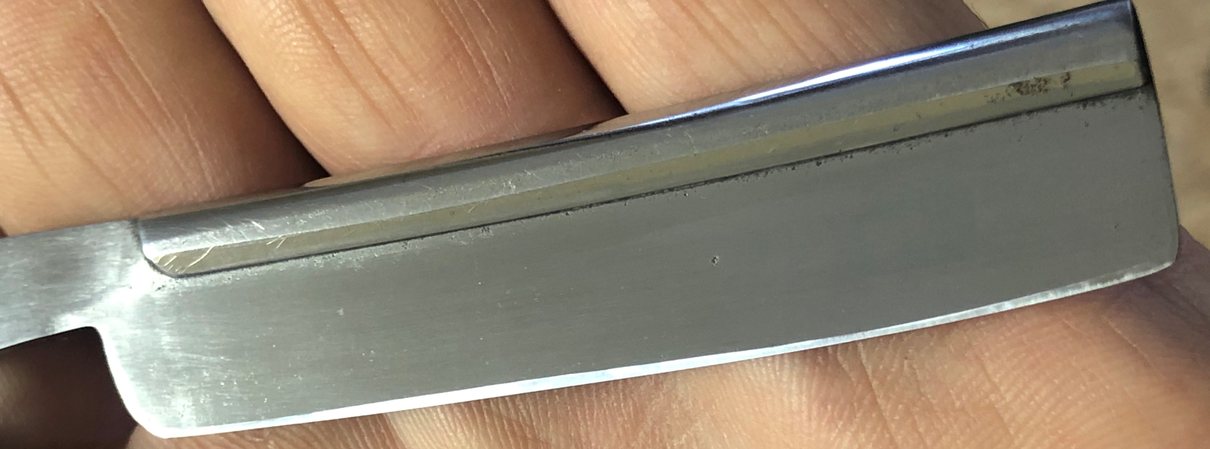 Бритва в состоянии близком к идеальному. Следов пользования не обнаружил.Разобрал, немного освежил металл на тонких абразивах, отполировал и снова собрал, сохранив родной пин.Кромочка равномерна по всей длине и практически незаметна.Сталь чистая,без видимых дефектов.Тяжёлая бритва,с элегантной формой клинка,с прекрасной"звонкой" сталью и мягким бритьём, будет очень неплохим вариантом для большинства заинтересованных товарищей.Заточена и готова к бритью.