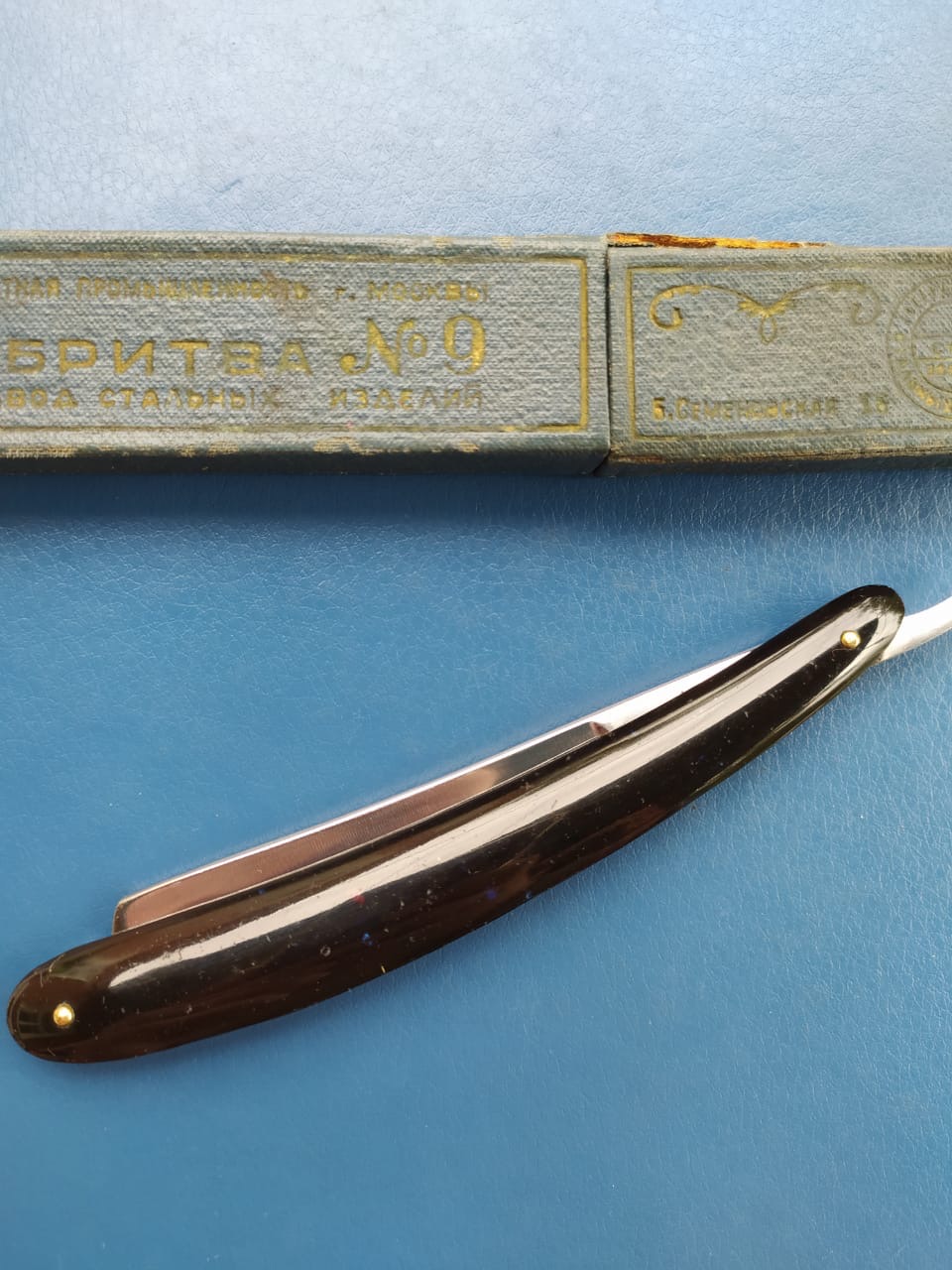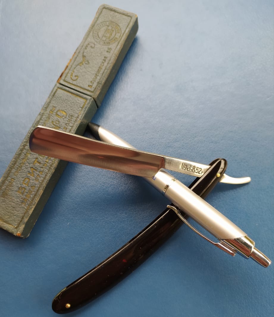 Бритву разобрал, почистил и снова собрал, добавив внутренние шайбы и сохранив оригинальные пины.Идеальная геометрия клинка:кромочка равномерна по всей длине.Очень неплохая сталь с точки зрения заточки.Думаю, что и бритье не разочарует. Родная оправа также в очень хорошем состоянии. Бритва среднего размера,без признаков активного пользования, главное, недорогая, будет отличным вариантом для новичка и просто в коллекцию.Заточена и готова к бою.