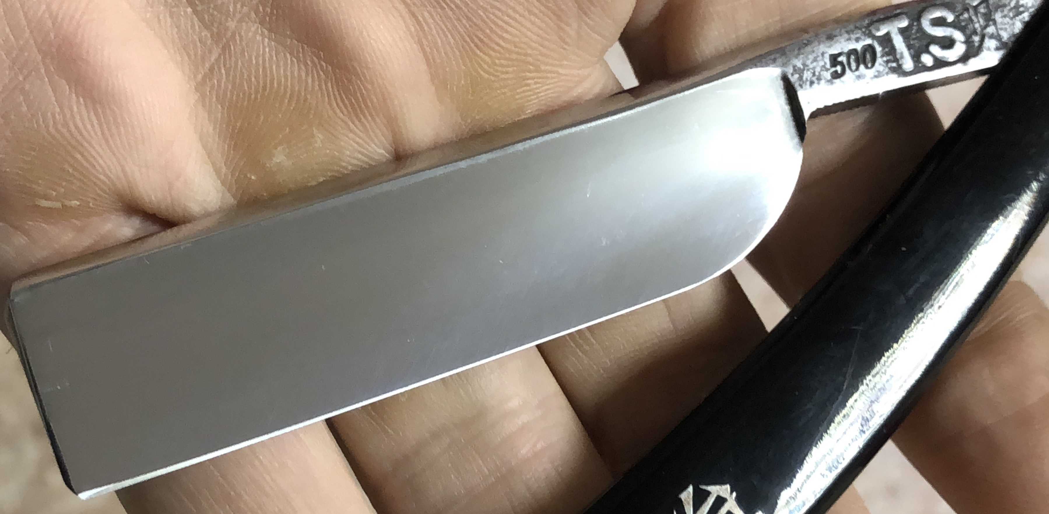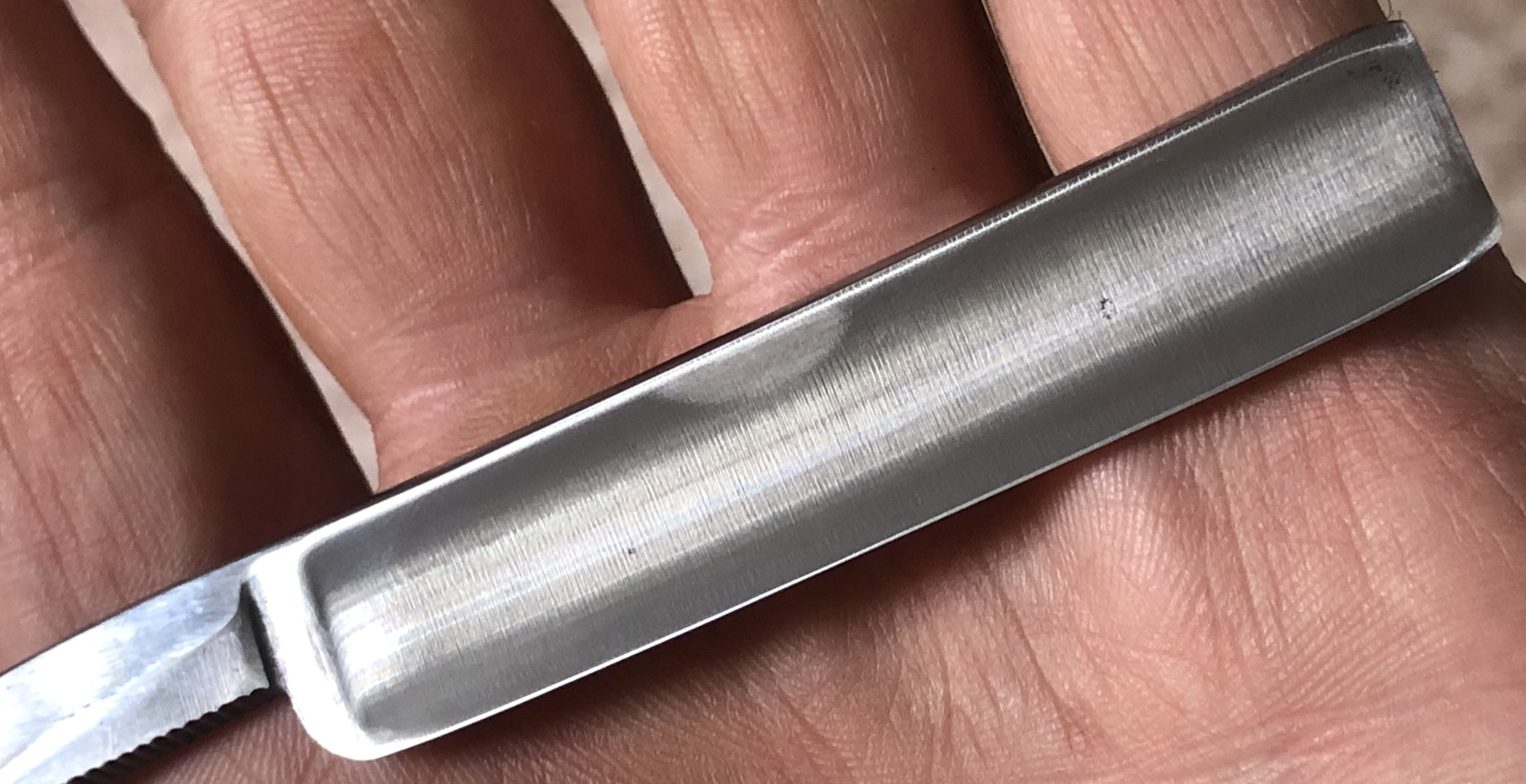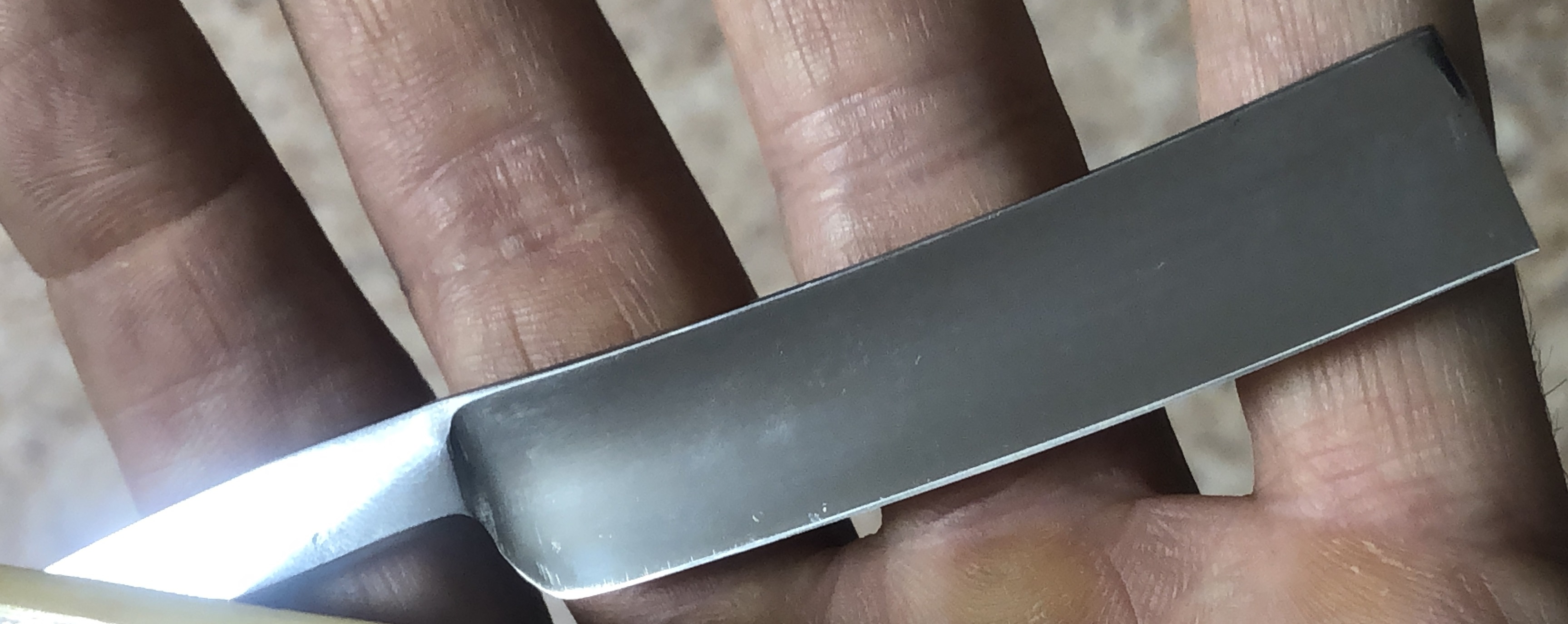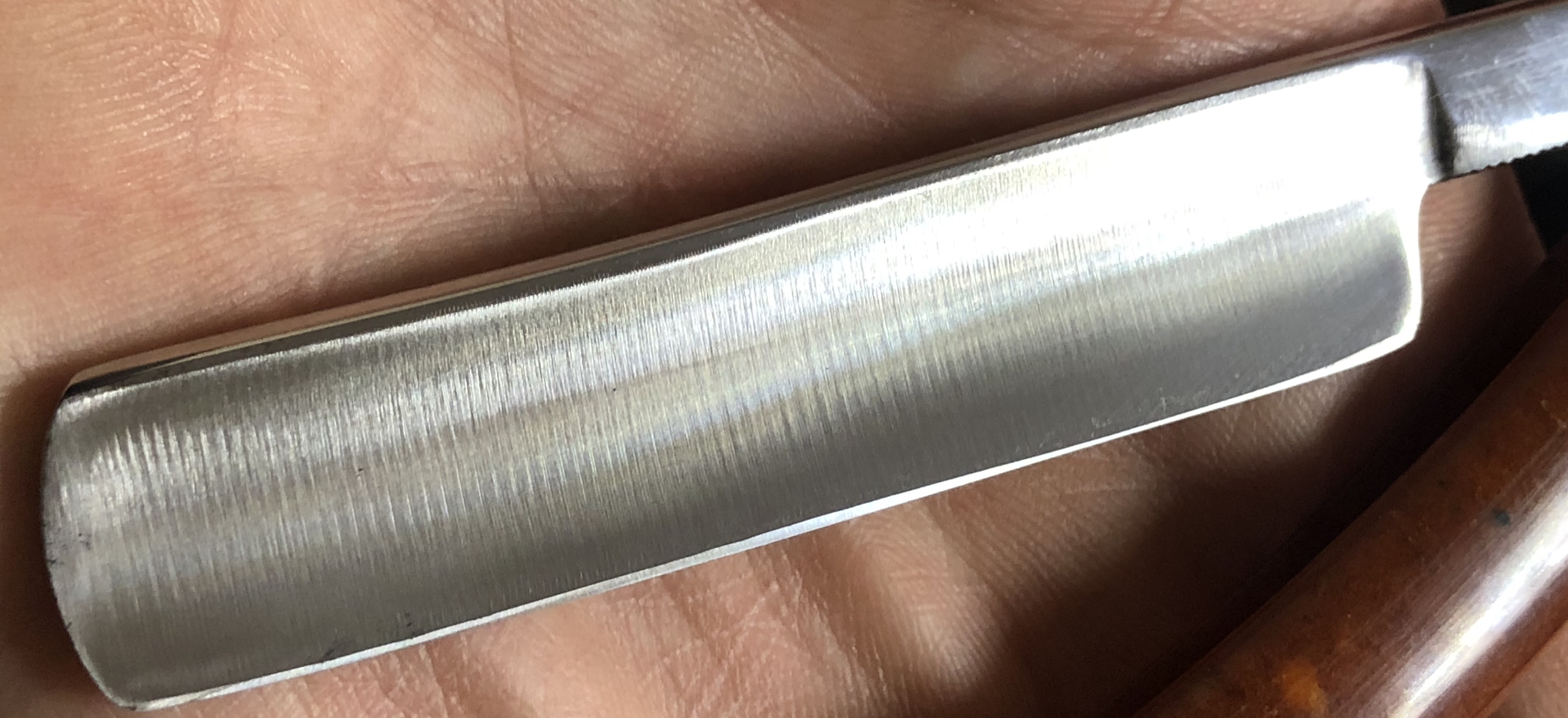 Бритва хоть и пользованная, но находится в прекрасном состоянии. Видно по равномерному износу обушка, что точили её со знанием дела и пользовались также профессионально.В этот раз мной было принято решение не делать гринд клинка, а шлифовать и полировать вручную камнями разной зернистости.Типа, по принципу обработки клинка катаны.Получился такой приятный "зеркальный сатин", с голубым оттенком металла.Никакого механического вмешательства с моей стороны!