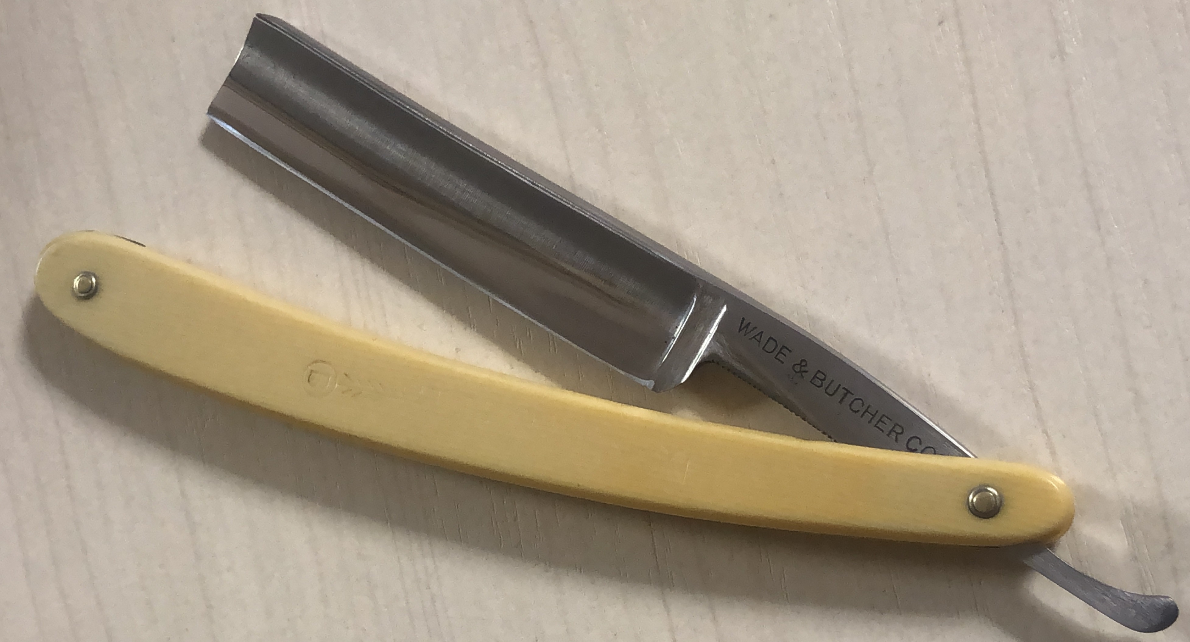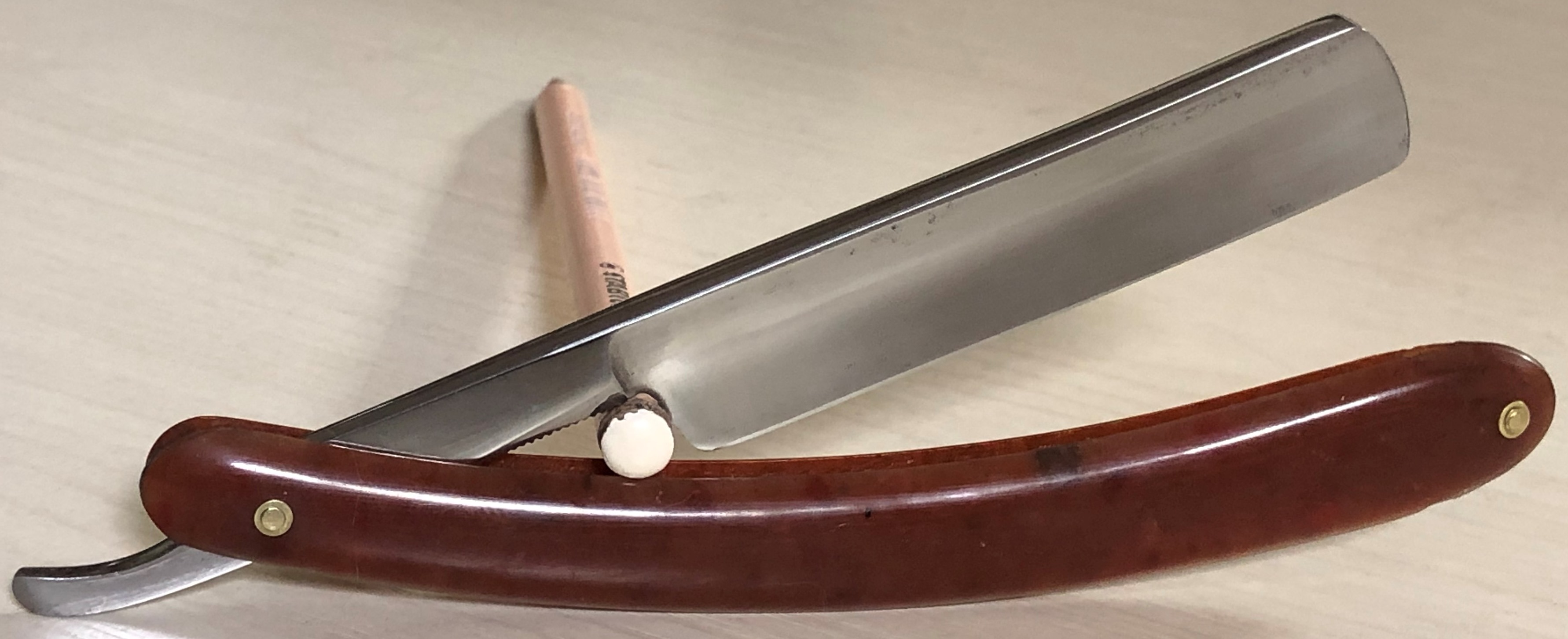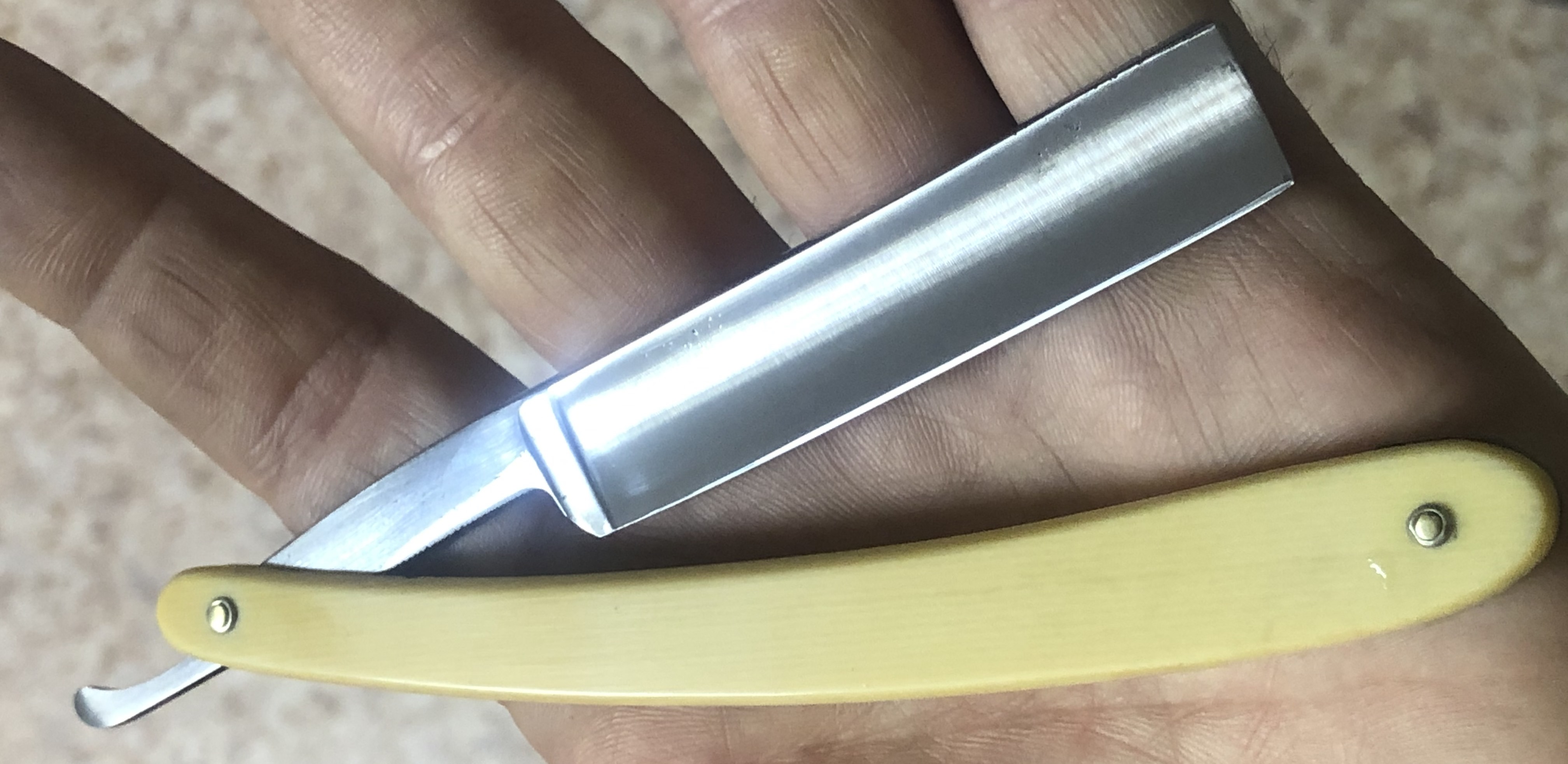 Изюминкой в компоновке данного раритета стал сюртук , пошива конца 19-го,начала 20-го веков.Имеется ввиду ручка из натуральной кости, от старинного донора. Оправа мощная, крепкая, тяжёлая, в идеальном состоянии.Пины удалось заново поставить оригинальные, от Ивасаки.Клинок в прекрасном состоянии,без видимых дефектов. Идеальная геометрия полотна:кромочка равномерна по всей длине.Сталь звонкая, отличного качества. По всем параметрам твердая, больше подошла бы для жёсткой щетины, но и для опытного пользователя будет очень неплоха. В общем и целом я доволен своей работой. На мой взгляд, отличная вещь для повседневного бритья.Заточена и готова к бритью.