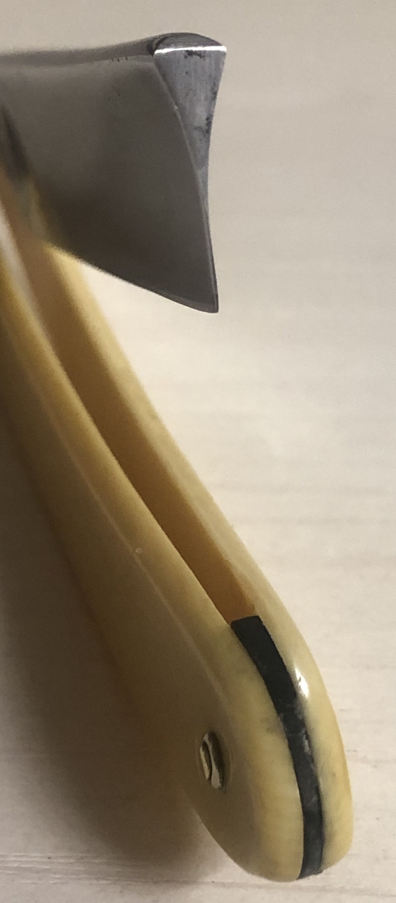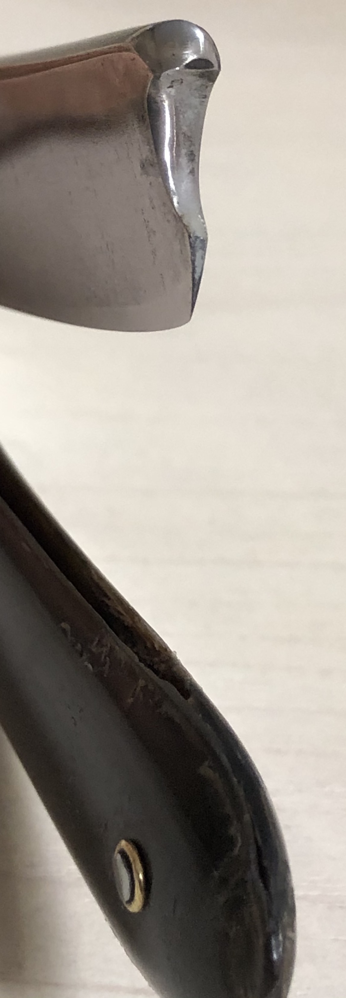 Не стал стачивать много "мяса", чтобы убрать все изъяны и рытвинки металла, а просто почистил и заточил.В целом клиночек чистый, за исключением небольшого количества у обушка.Кромочка равномерна по всей длине.Сталь очень неплохая в плане заточки, впрочем как и большинство французских бритв этого периода.Роговая оправа в очень хорошем состоянии, практически без отгрызанных мест. Массивная , тяжёлая бритва. Заточена и готова к бритью.