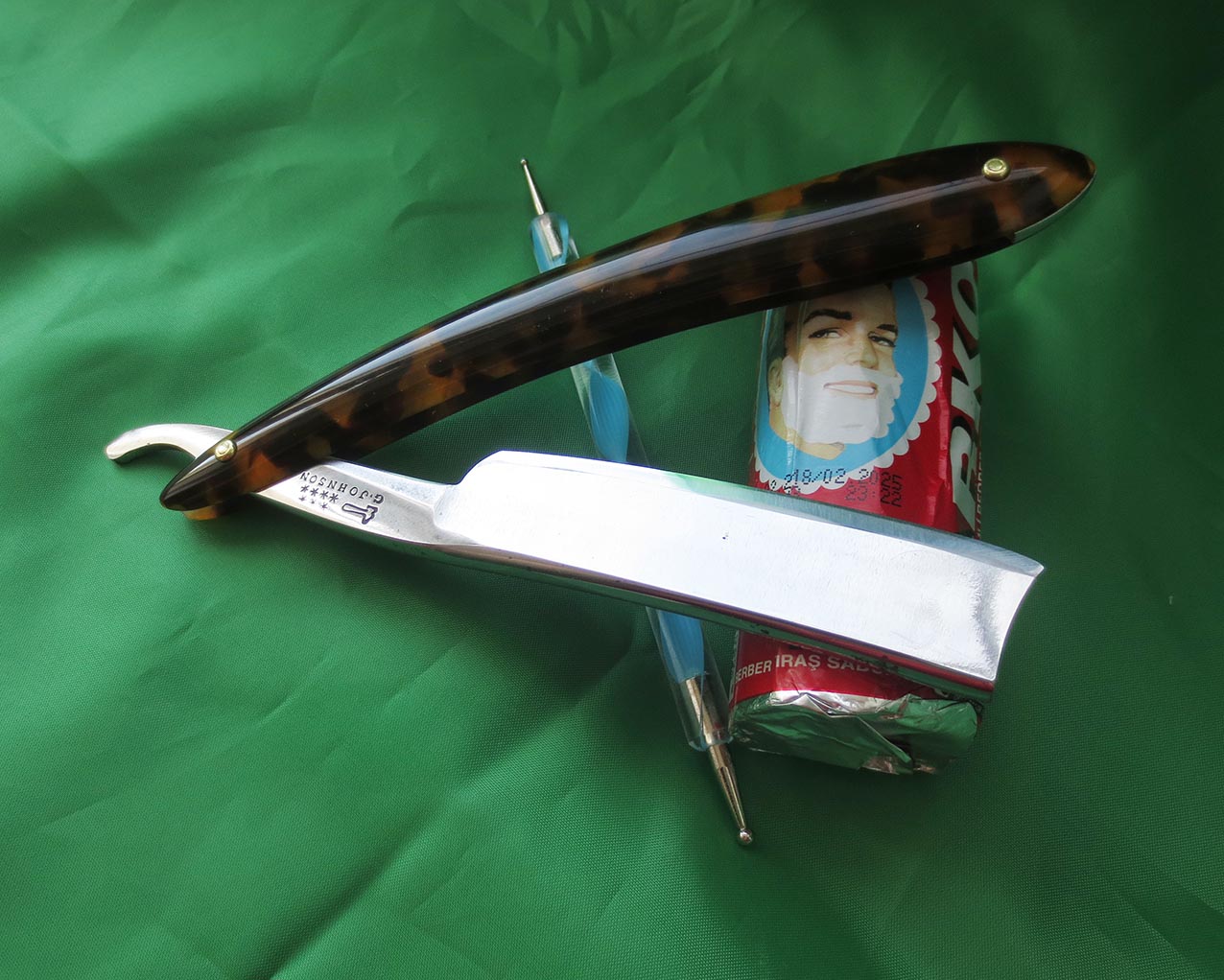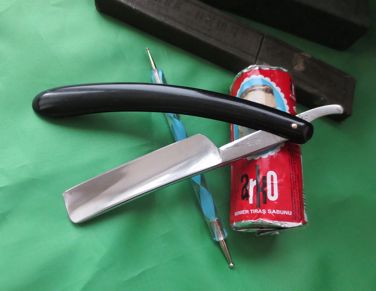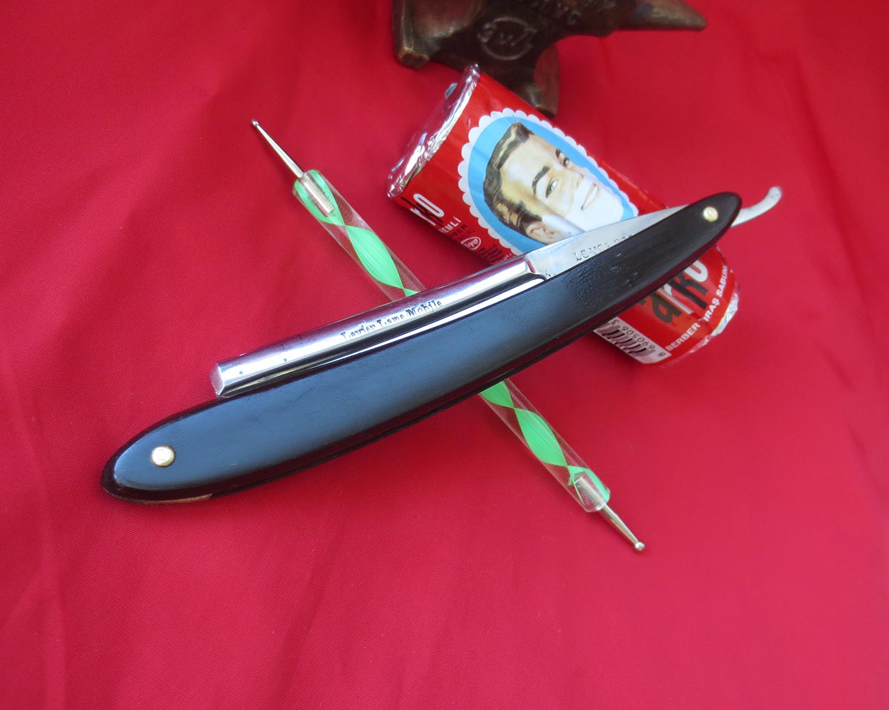 Опасная бритва "Top Flight" (Высший пилотаж). Производитель BURRELL CUTLERY C0.INC.ELLICOTTVILLE,N.Y. Годы ориентировочно - 40-е военные , поставки немецких опасных бритв в США сошли на нет и компания BURRELL организовала производство, в котором судя по отзывам пользователей превзошла немецкие изделия. Инструмент для своих лет находится в отличном состоянии, довольно мало был в использовании и прослужит ещё много и много лет. Ширина клинка - 5/8 дюйма, углеродистая сталь, ручка - пластик. Заточена на японских водных камнях, финиширование на натуральном сланце от компании Эшер, направлена, продезинфицирована и в работе после заточки не была. Очень достойный вариант для начинающего не только для обучения, но и для дальнейшего постоянного использования. Также в наличии ремни для правки опасных бритв, при покупке комплекта пересылка по РФ осуществляется за счёт продавца. Цена "Вышки" - 3500 рублей.