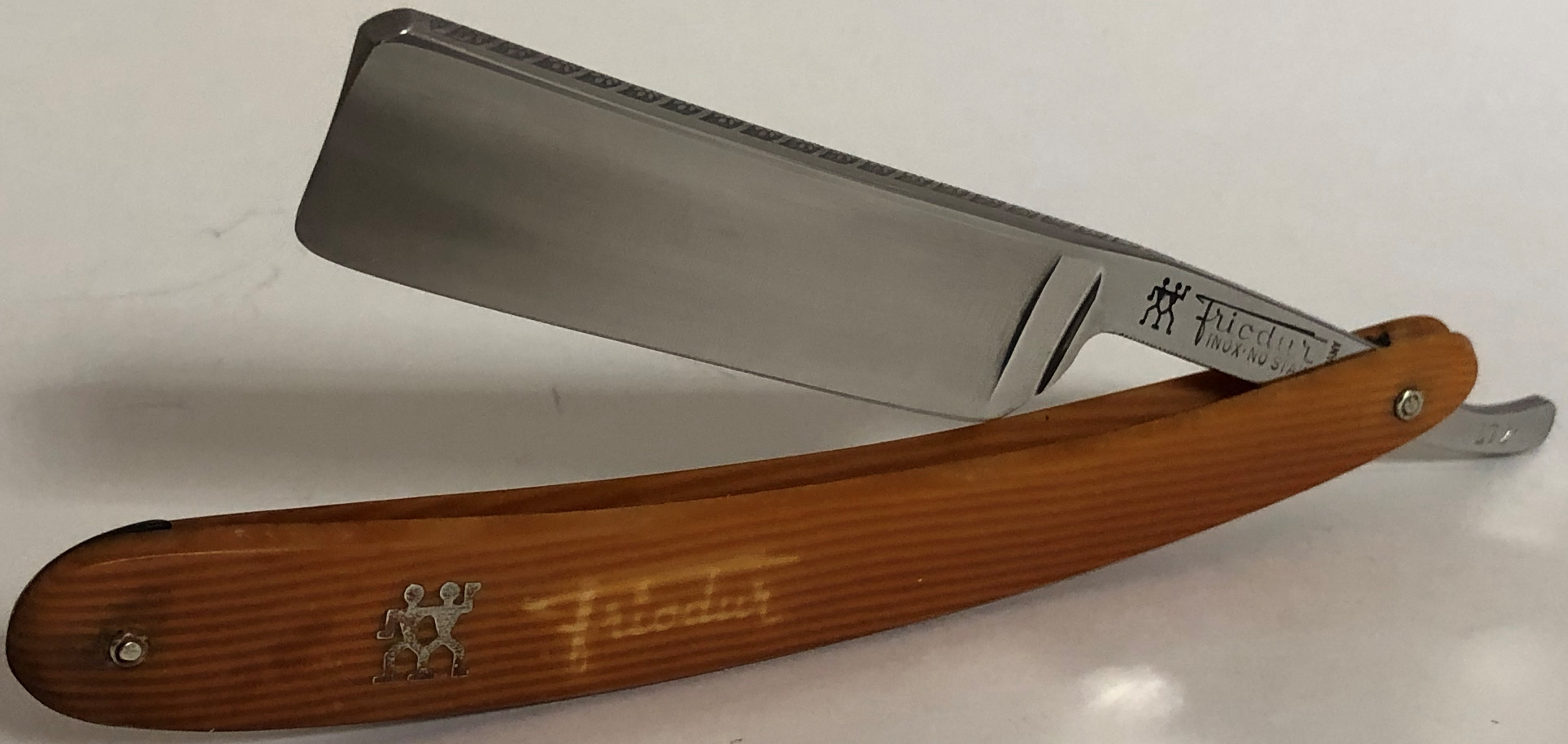 Бритва в прекрасном состоянии для своих лет, без видимых следов пользования. Разобрал, немного освежил клинок и снова собрал, заменив пины на немецкие втулки.Идеальная геометрия полотна:кромочка равномерна по всей длине и еле заметна.Сталь чистая от разного рода дефектов.Красивая и удобная форма бритвы будет отличным вариантом для новичка, а"серебряная" сталь(как одна из самых удачных на бритвах) способна выдавать очень качественное и мягкое бритьё. Заточена и готова к бритью.