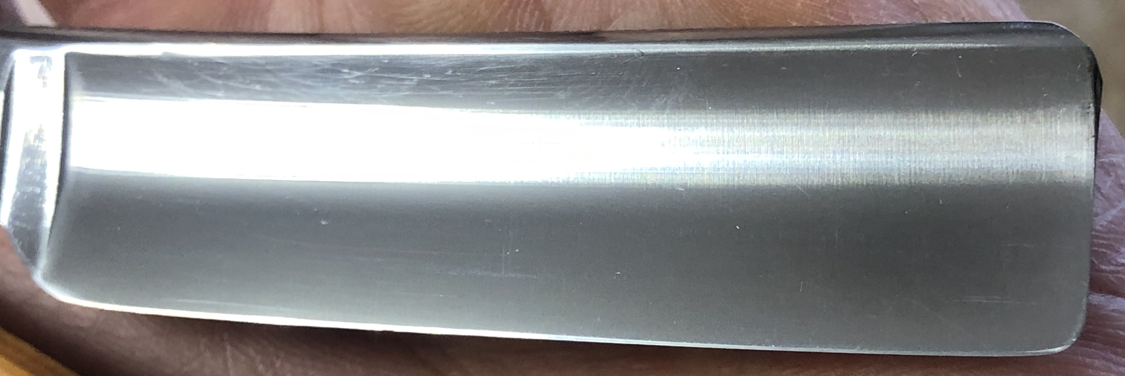 Бритва по состоянию приближена к идеальному. Не разбиралась. На самых тонких абразивах совсем немного освежил полотно от патины и небольших царапин и все.Внешний вид новой.Идеальная геометрия клинка:кромочка равномерна по всей длине и практически незаметна.Так как родной "лебединой"коробочки не было, то нашел коробку от другого животного.
