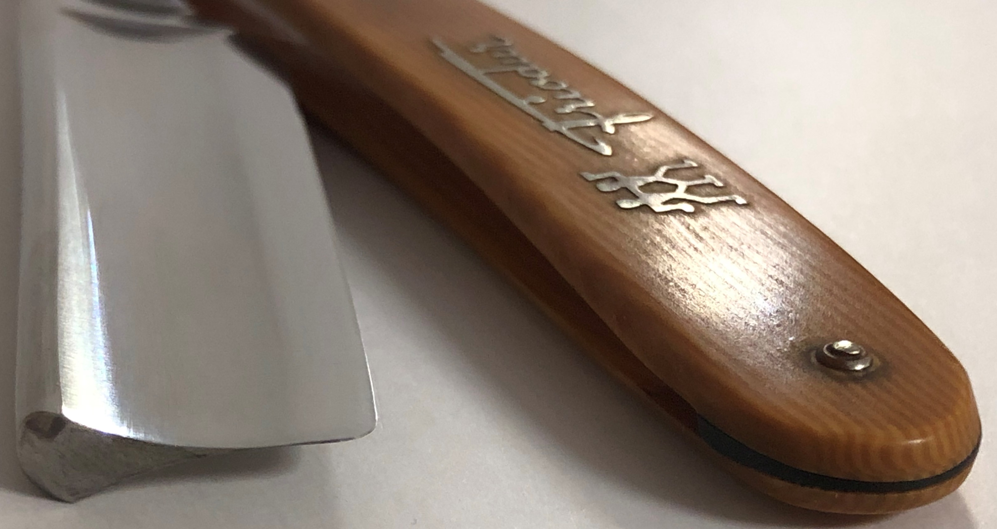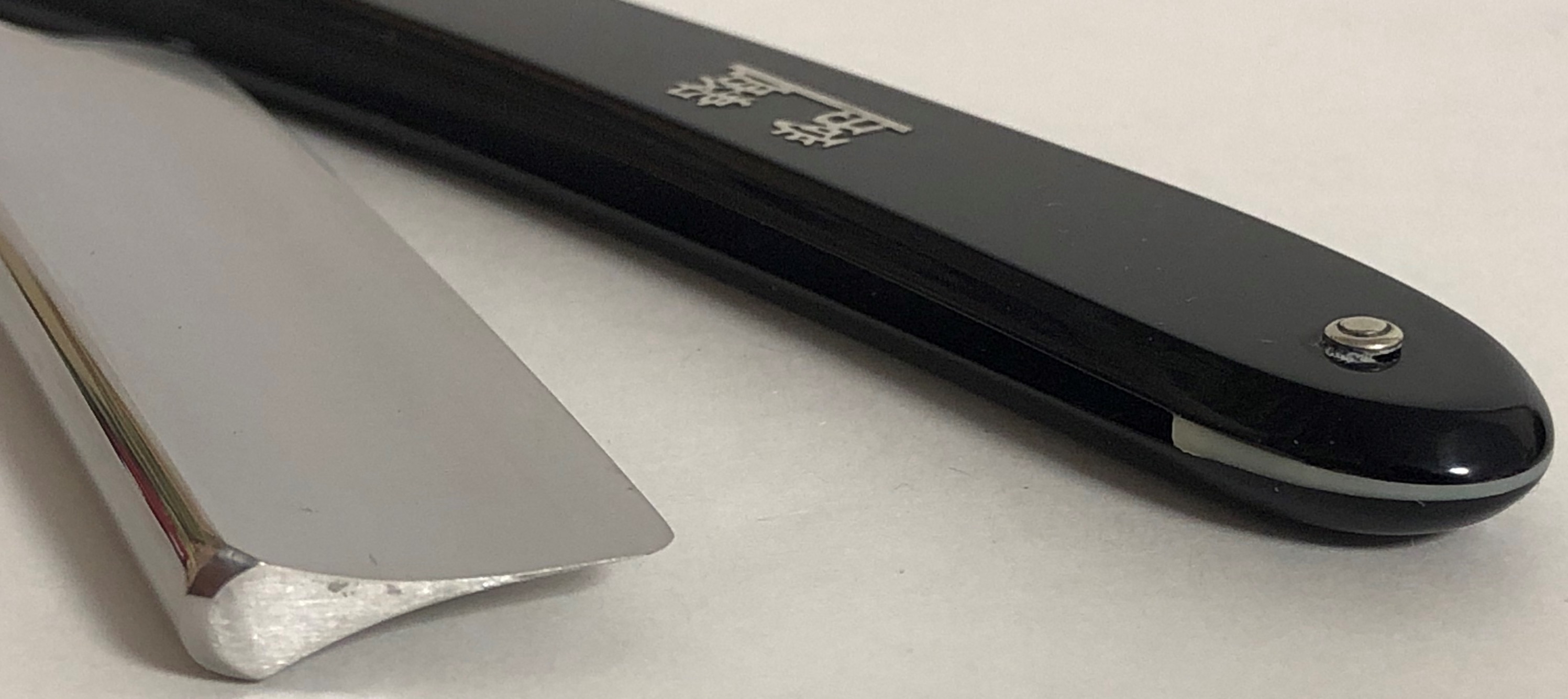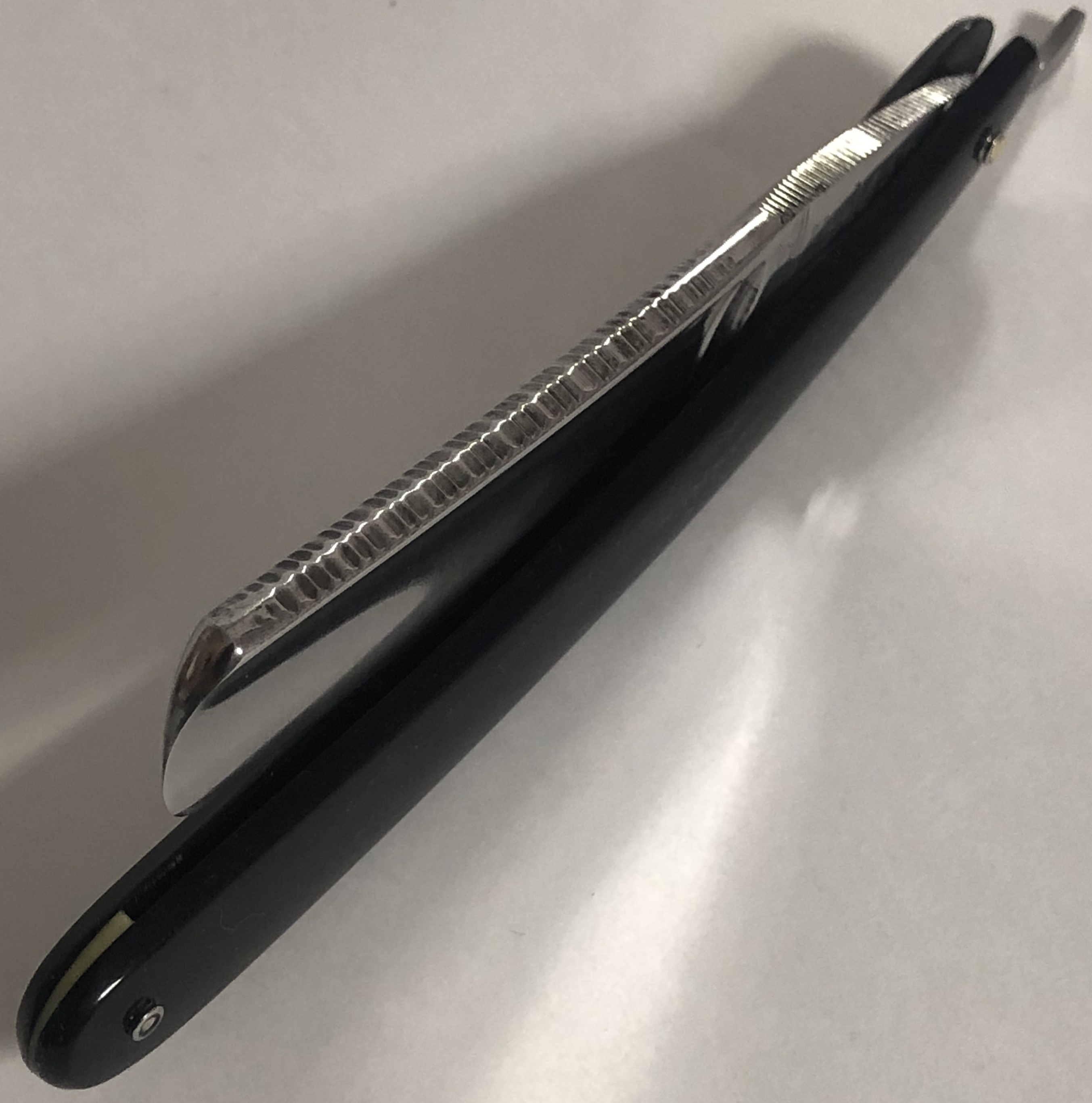 Клинок в очень хорошем состоянии, без следов активного пользования.Родную оправу оставил до лучших времен и установил вот такую, эффектную ручку(от другого старинного донора), тем более что она вошла в аккурат по размеру клинка.Красивая, трёх-пиновая оправа.Два крайних пина заменил на двух-цветные немецкие втулки, с добавлением внутренних шайб. Само лезвие немного освежил , но оставил немного следов патины в районе эрля, для придания более естественного вида.Идеальная геометрия полотна:кромочка равномерна пов сей длине. Сталь и кромка чистые от разного рода видимых дефектов. Заточена и готова к бритью.
