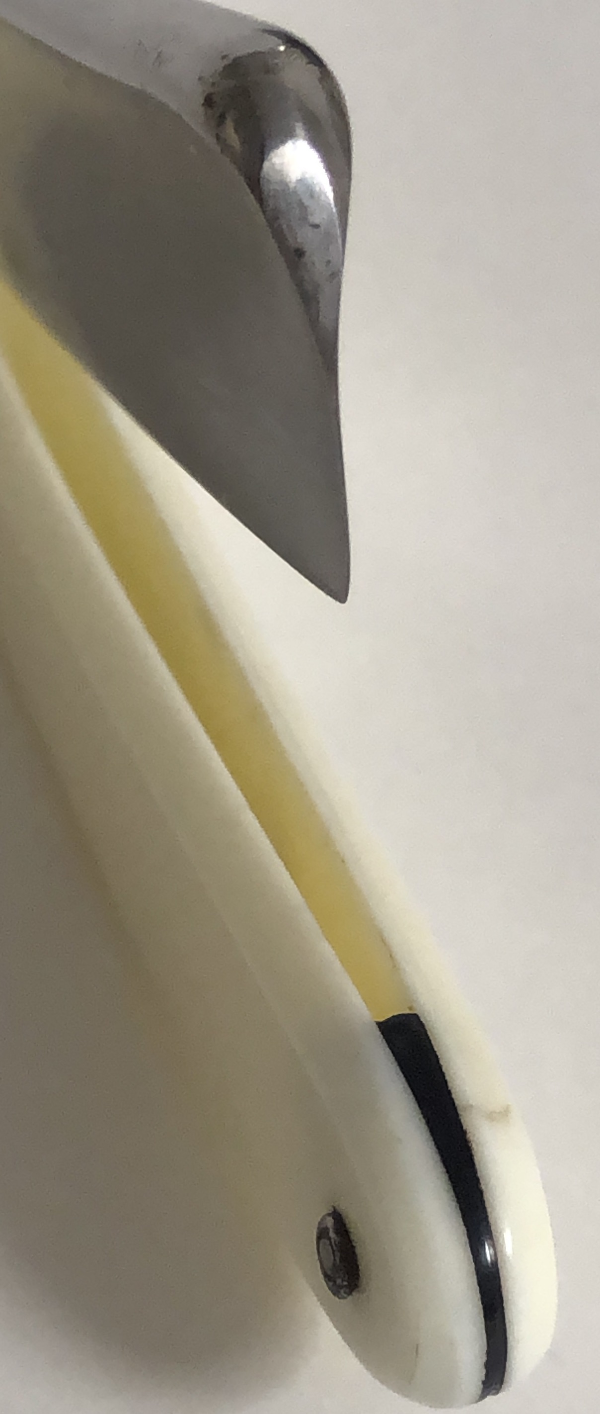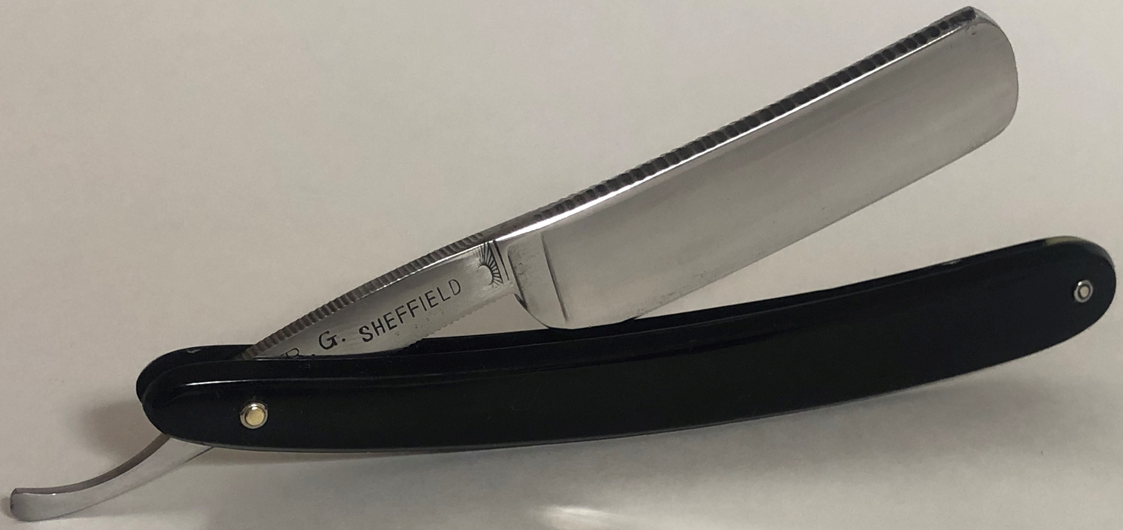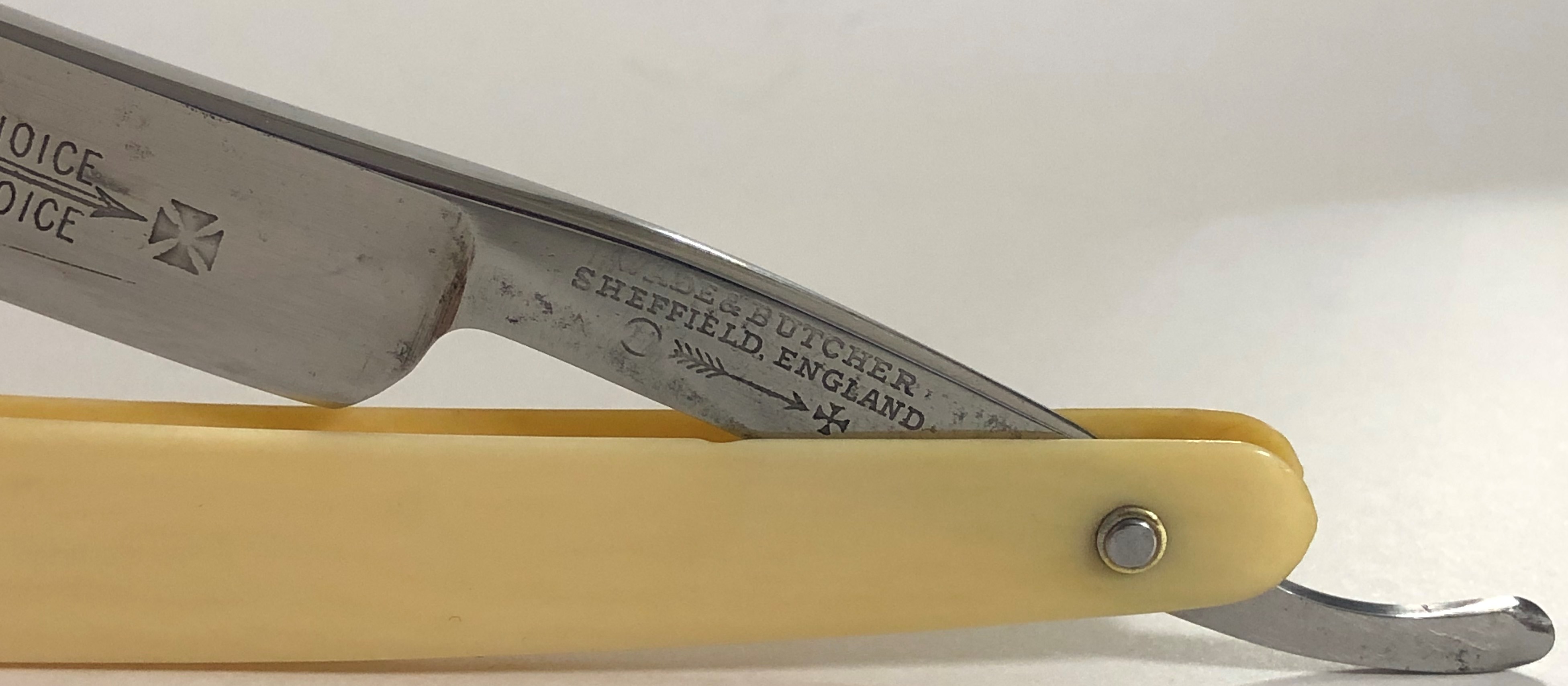 Клинок в очень хорошем состоянии, без следов от заточных камней на обушке.По всей видимости в пользовании не была.Немного следов патины на полотне убирать не стал, чтобы не трогать заводскую шлифовку и полировку.(На фото следы видны, а вот наяву практически незаметны). Кромочка равномерна по всей длине.(Небольшую горбинку в районе носика тоже трогать не стал, чтобы не стачивать лишний металл. Возможно заводской нюанс).Шикарная оправа из натурального бивня слона, с красивой структурой материала, находится в идеальном состоянии, без трещин и сколов и как раз очень подходит для такого именитого клинка. Бритва среднего размера, элегантная и удобная. Опытный пользователь способен в полной мере оценить данную модель, заточенную и в максимально сохраненном оригинальном виде.