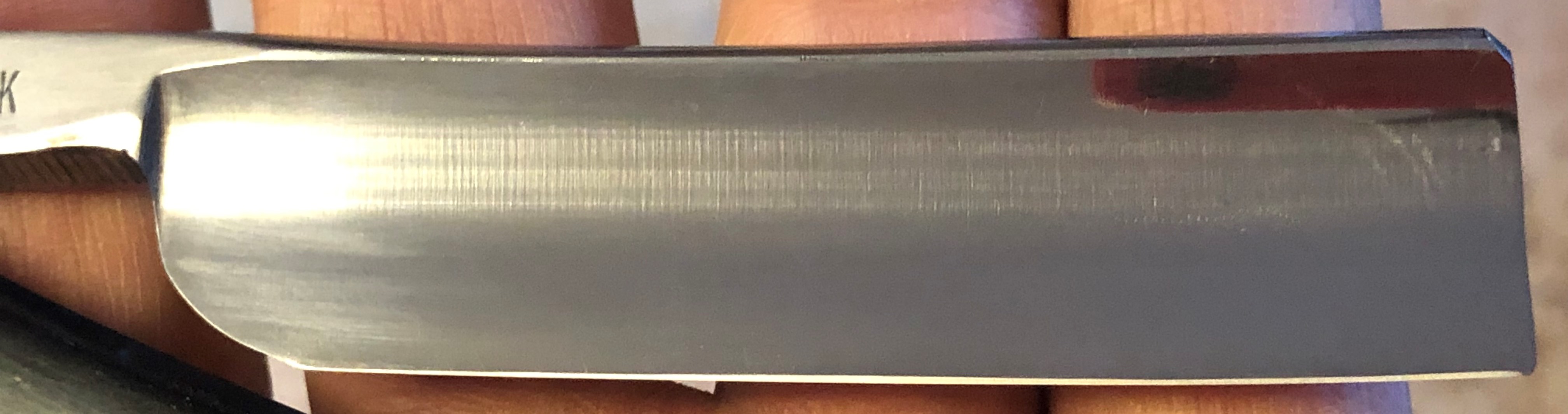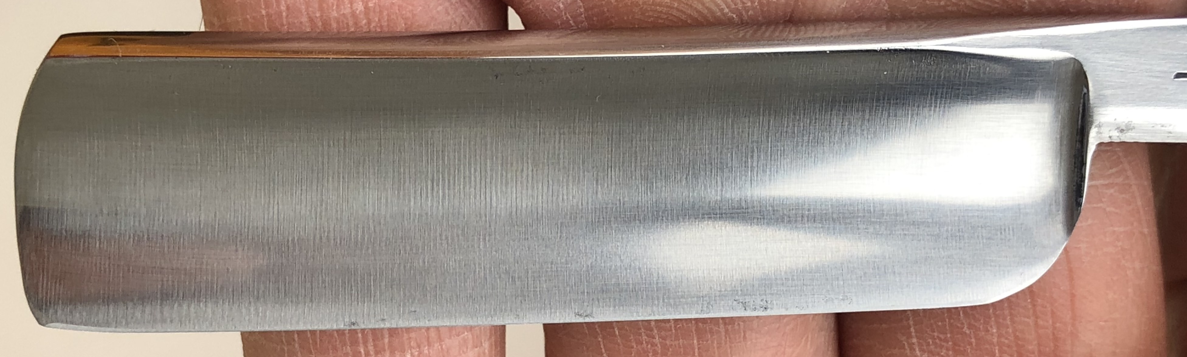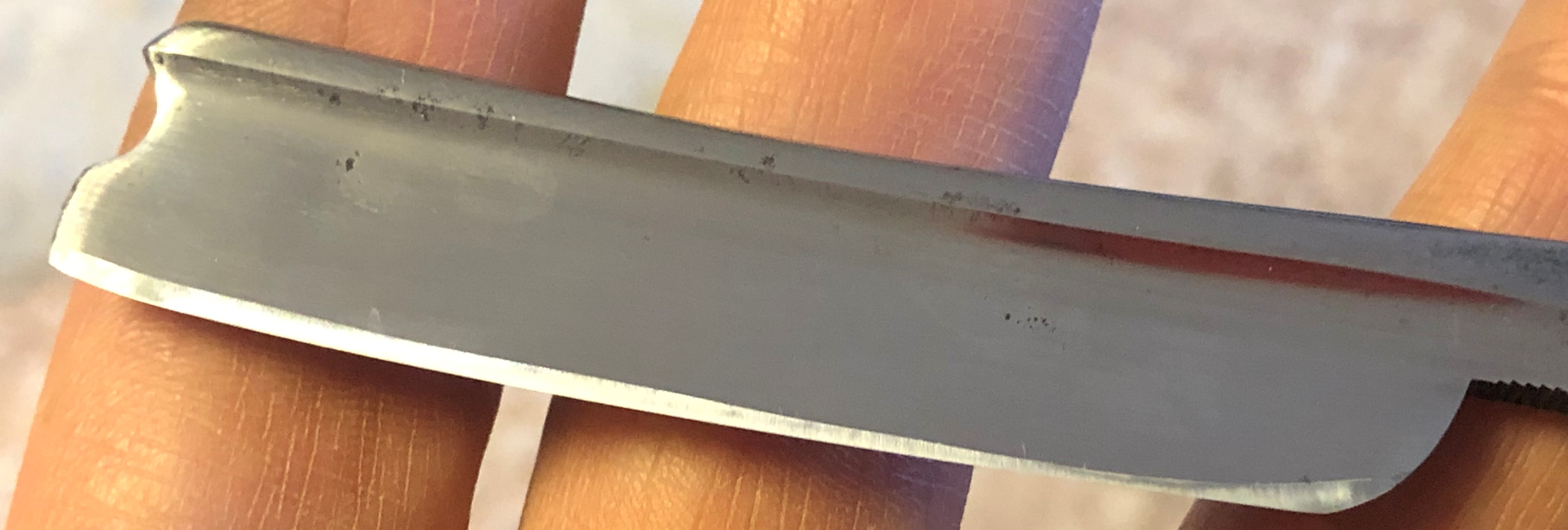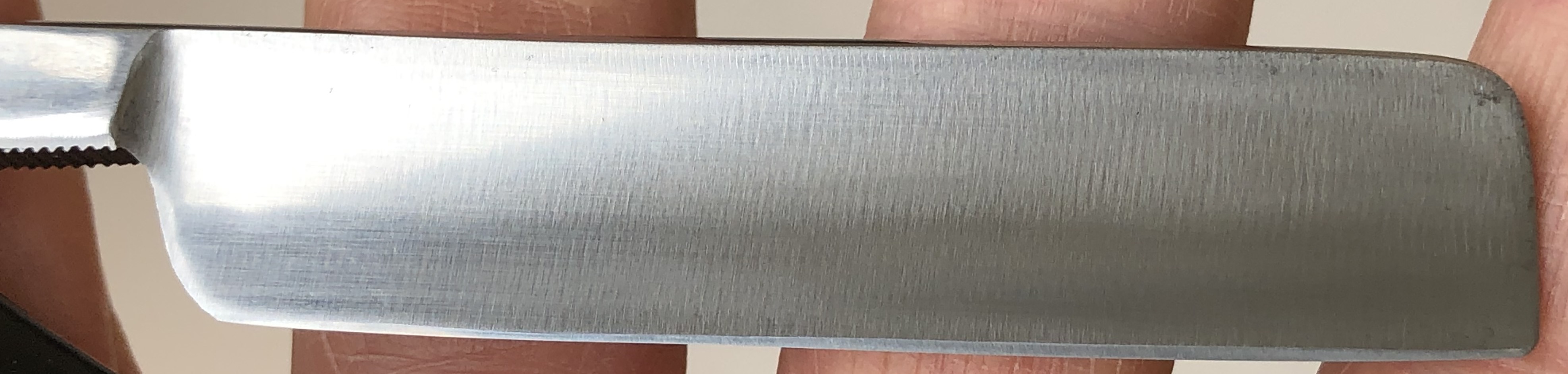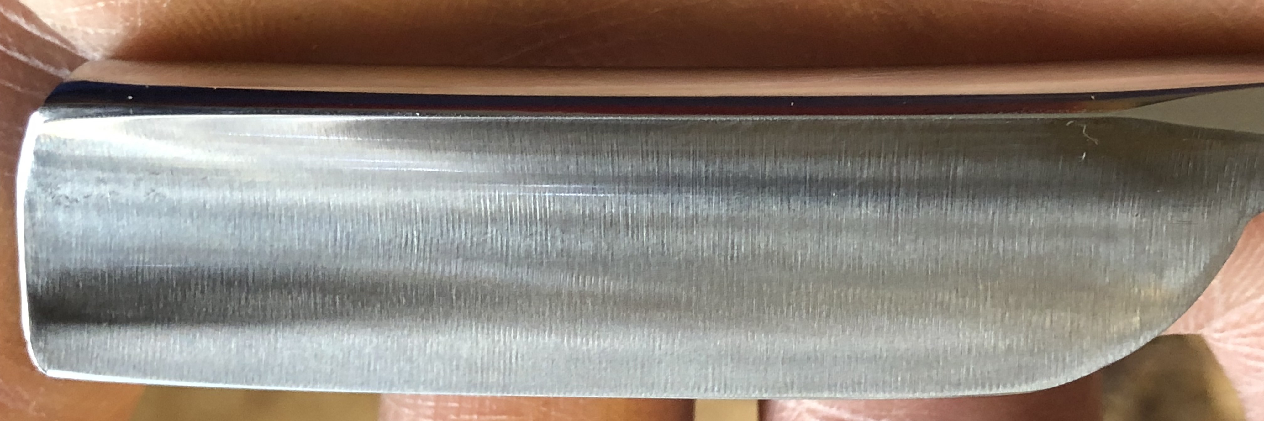 Бритва непользованная, но была разобрана,для удаления окисления в районе осевого пина.Также, прошелся самыми тонкими абразивами по полотну,что позволило восстановить былую свежесть и блеск.Идеальная геометрия клинка:кромочка равномерна по всей длине и практически незаметна.Состояние новой бритвы.Сталь и кромочка чистые от дефектов.Потихоньку тестируя такую же заточенную уже бритву прихожу к выводу, что сталь имеет среднюю твердость и в бритье чем то напоминает англичан начала прошлого века.Бритьё мягкое и чистое, без заметной агрессии. На мой взгляд, подобная форма лезвия и удачный выбор стали и закалки делает инструмент просто незаменимым на все случаи жизни и держа такую бритву, просто не хочется выпускать из рук. Все четко,идеально и без излишеств. Перед отправкой будет заточена и доведена до комфортного бритья.