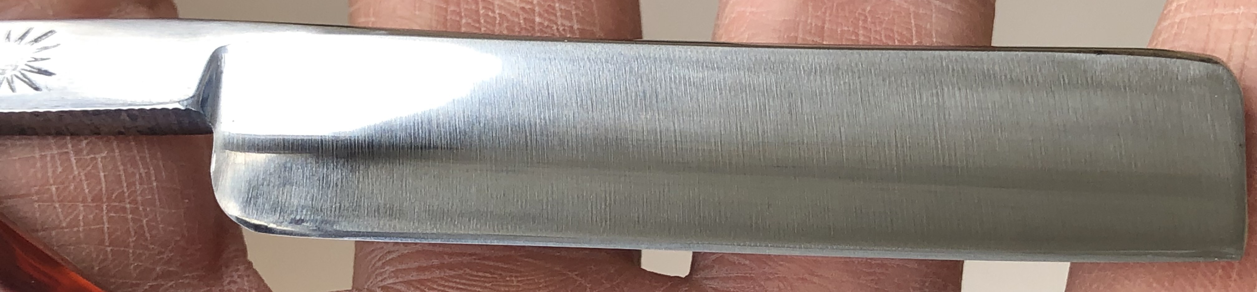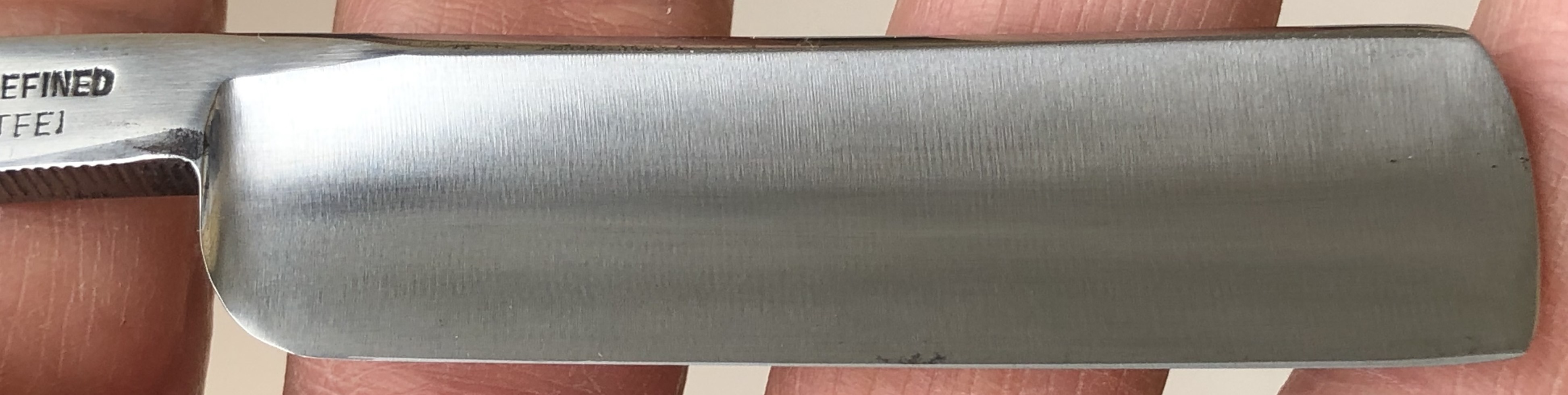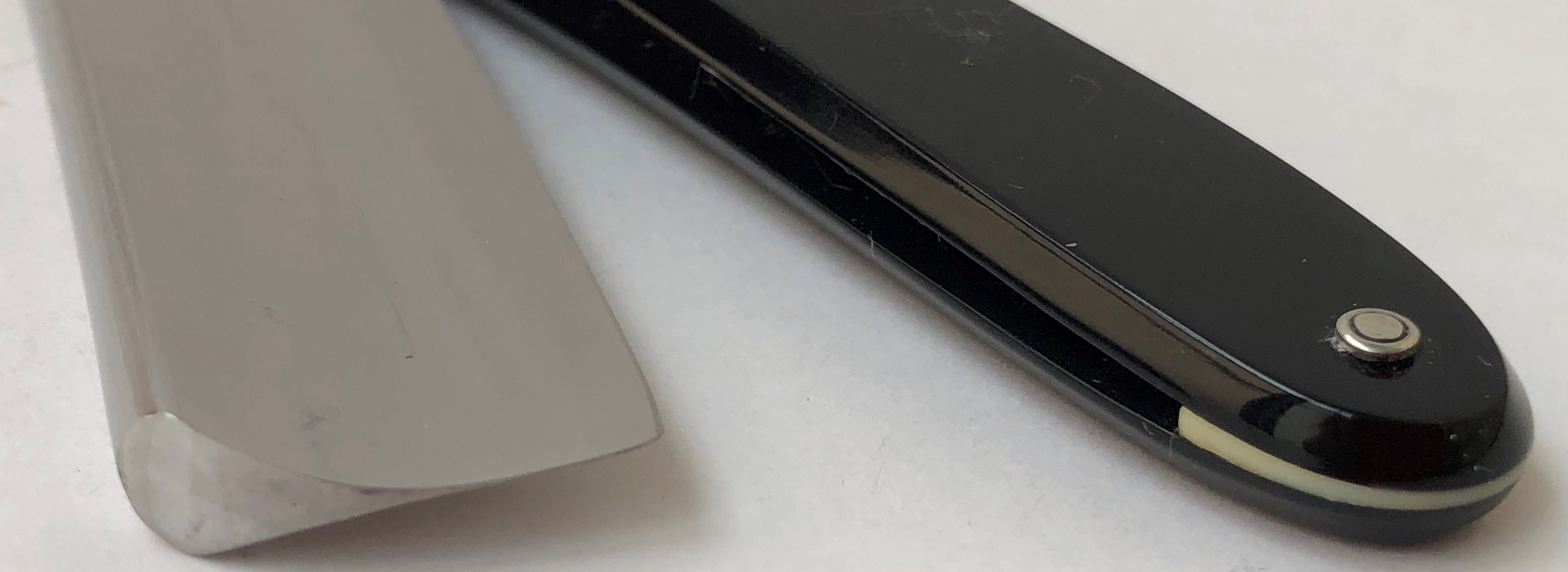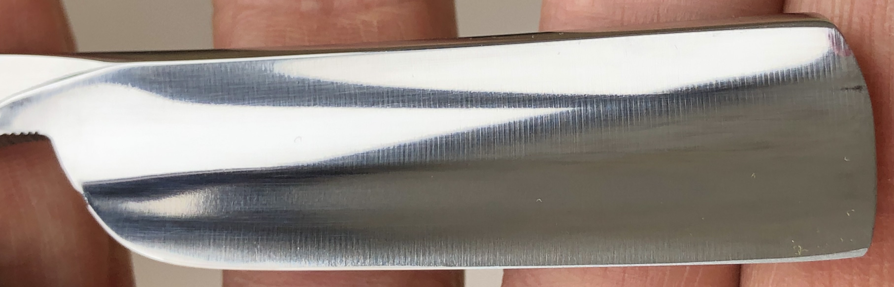 Бритва непользованная, но была разобрана,для удаления окисления в районе осевого пина.Также, прошелся самыми тонкими абразивами по полотну,что позволило восстановить былую свежесть и блеск.Идеальная геометрия клинка:кромочка равномерна по всей длине и практически незаметна.Состояние новой бритвы.Сталь и кромочка чистые от дефектов.Потихоньку тестируя такую же заточенную уже бритву прихожу к выводу, что сталь имеет среднюю твердость и в бритье чем то напоминает англичан начала прошлого века.Бритьё мягкое и чистое, без заметной агрессии. На мой взгляд, подобная форма лезвия и удачный выбор стали и закалки делает инструмент просто незаменимым на все случаи жизни и держа такую бритву, просто не хочется выпускать из рук. Все четко,идеально и без излишеств. Перед отправкой будет заточена и доведена до комфортного бритья.