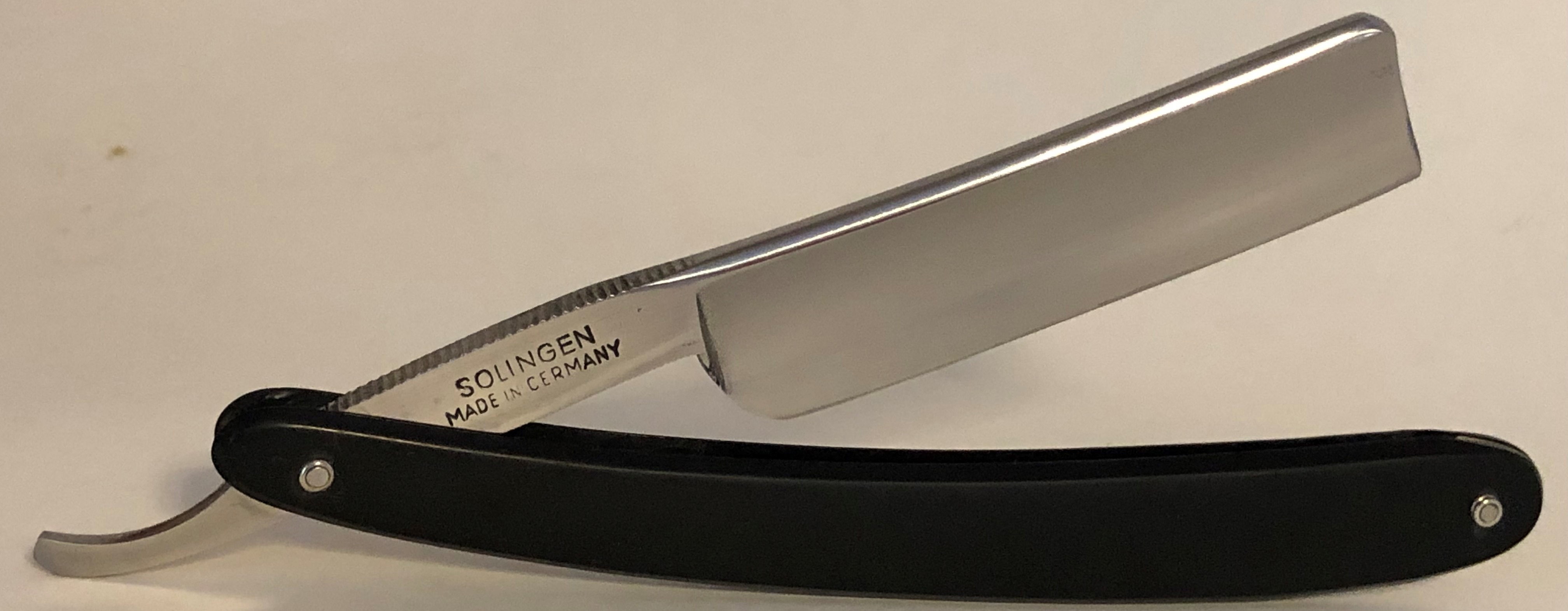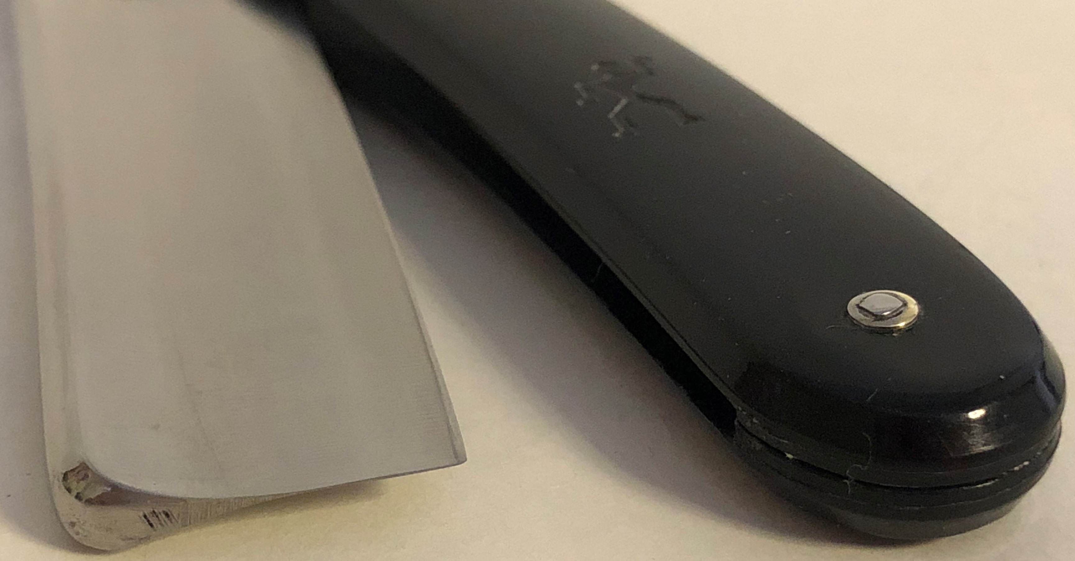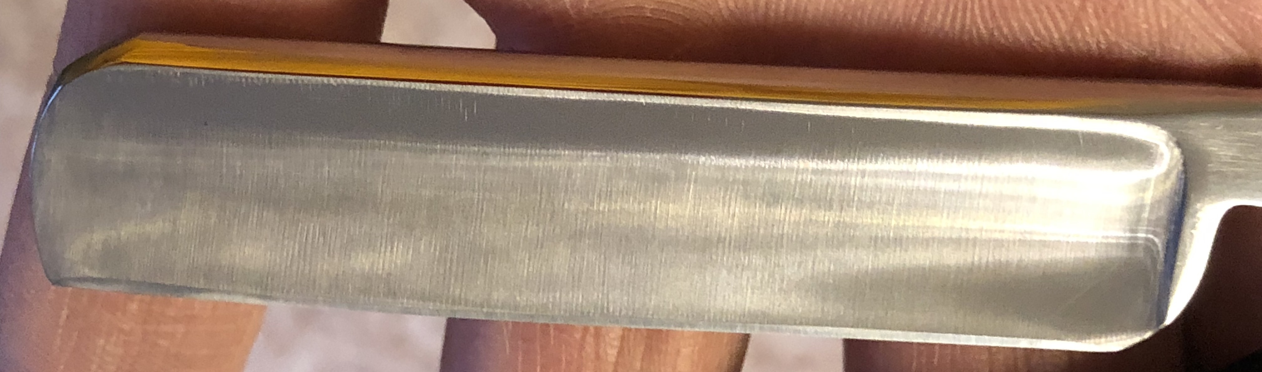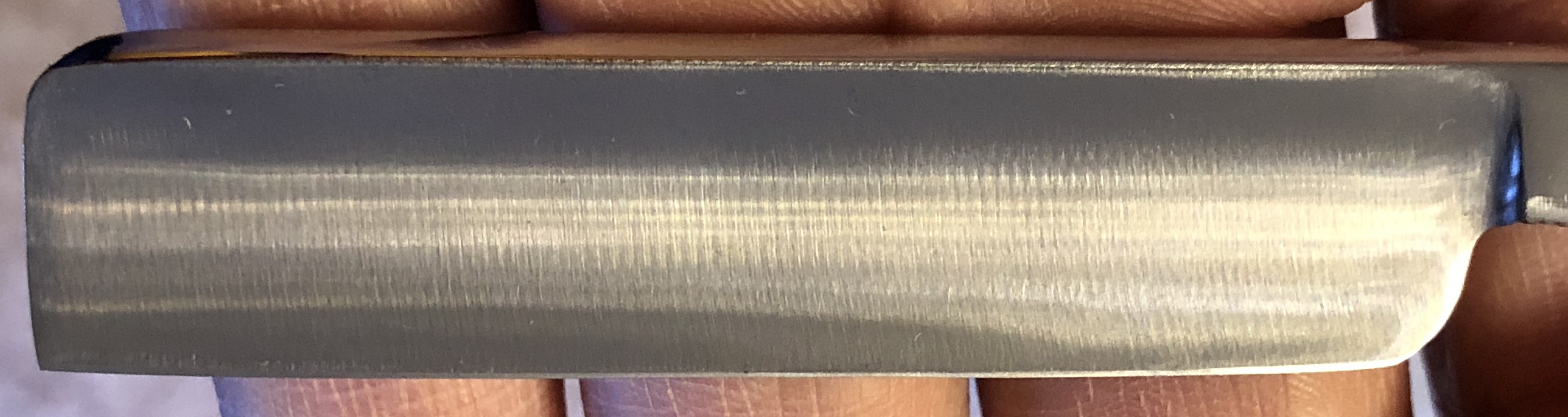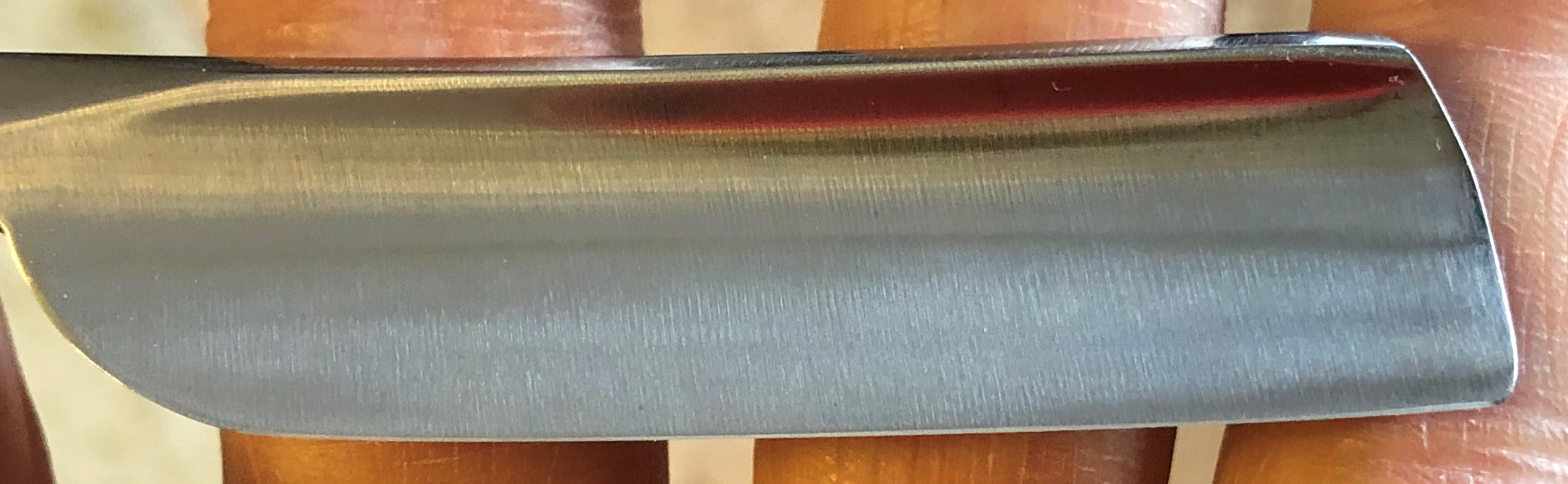 Бритва непользованная, но была разобрана,для удаления окисления в районе осевого пина.Также, прошелся самыми тонкими абразивами по полотну,что позволило восстановить былую свежесть и блеск.Идеальная геометрия клинка:кромочка равномерна по всей длине и практически незаметна.Состояние новой бритвы.Сталь и кромочка чистые от дефектов.Потихоньку тестируя такую же заточенную уже бритву прихожу к выводу, что сталь имеет среднюю твердость и в бритье чем то напоминает англичан начала прошлого века.Бритьё мягкое и чистое, без заметной агрессии. На мой взгляд, подобная форма лезвия и удачный выбор стали и закалки делает инструмент просто незаменимым на все случаи жизни и держа такую бритву, просто не хочется выпускать из рук. Все четко,идеально и без излишеств. Перед отправкой будет заточена и доведена до комфортного бритья.