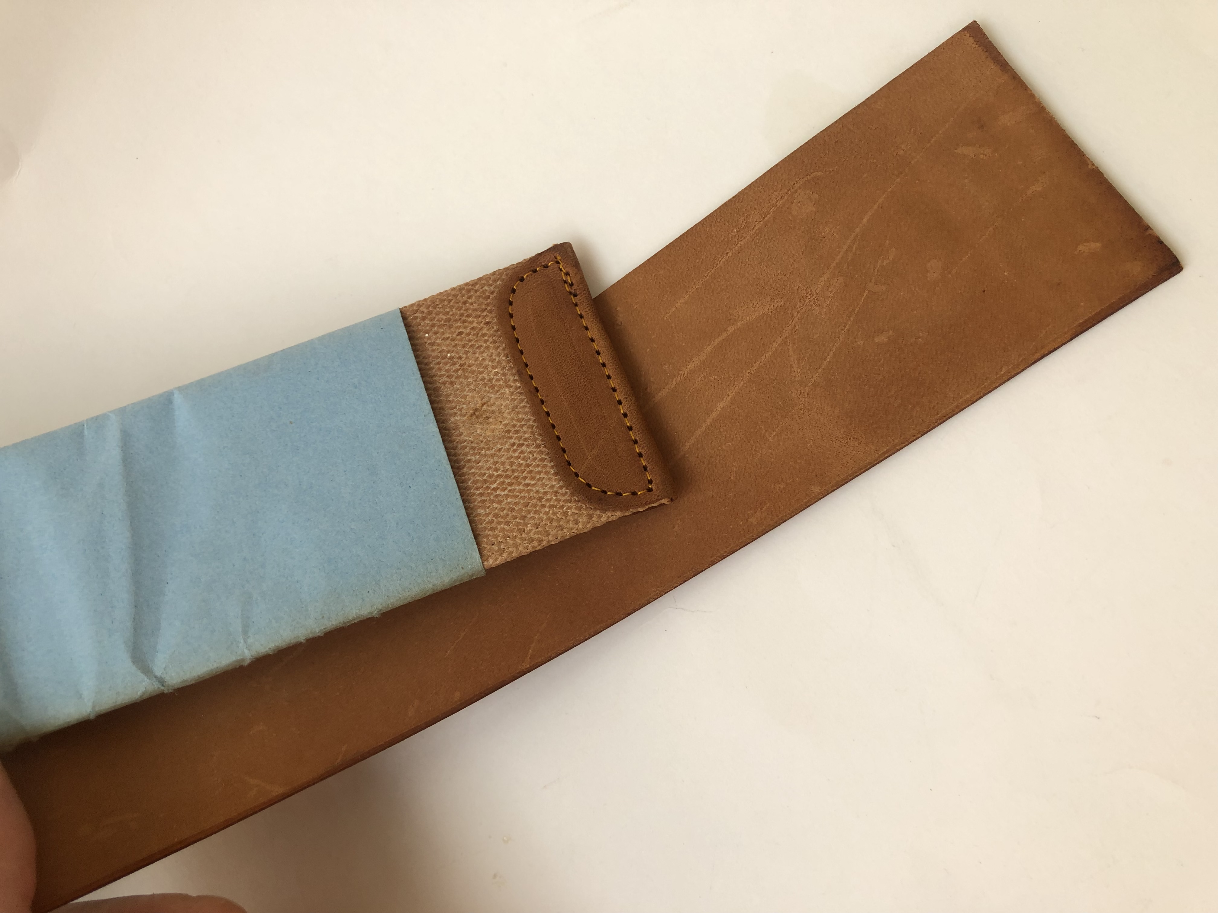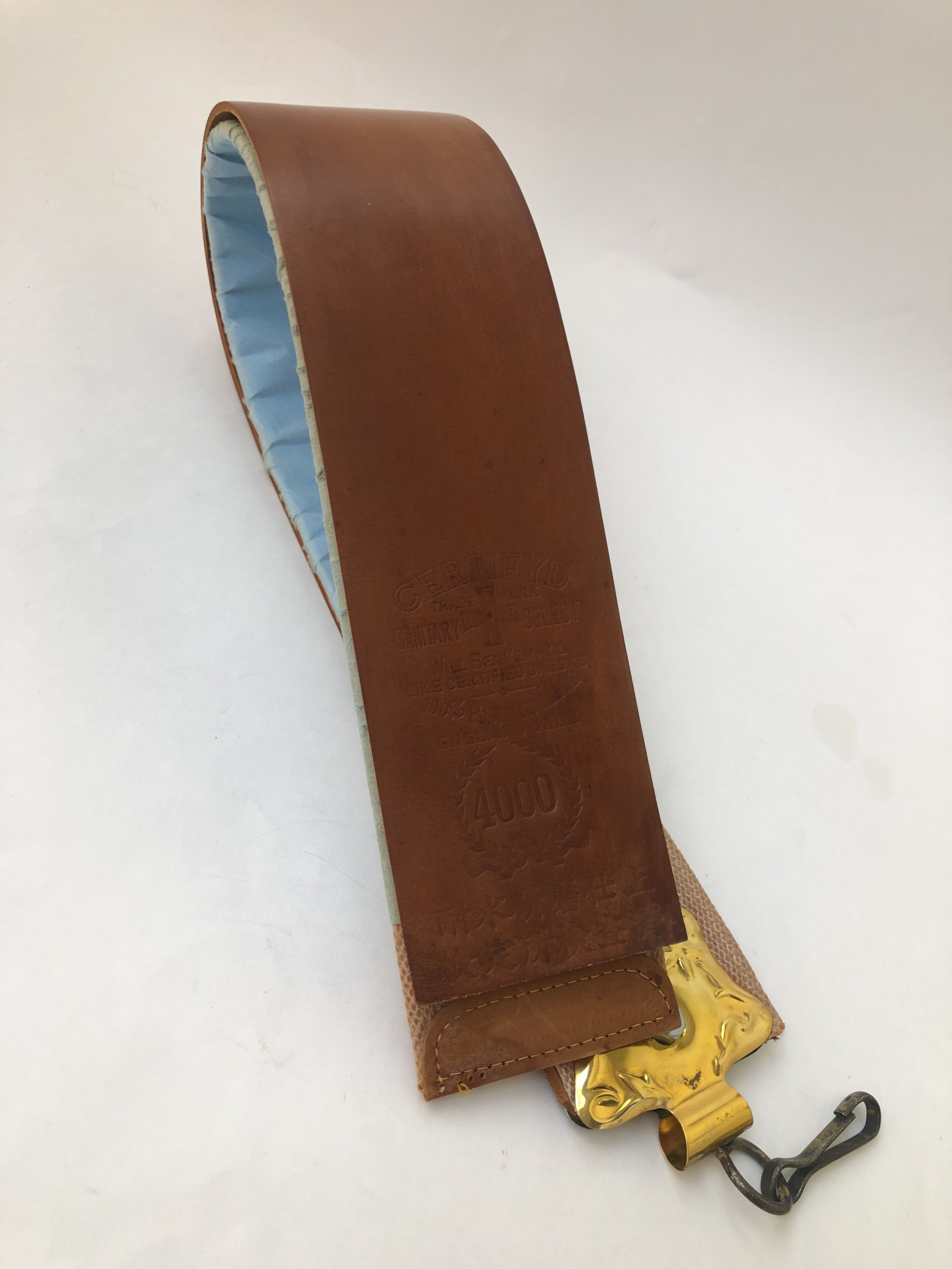 Ремень нетронутый временем и совершенно непользованный, с бумажкой.Кожа лошади не имеет трещин, прожилок, царапин, порезов и других дефектов.Заводская шлифовка.Плотная, эластичная и умеренно мягкая кожа, со временем размягчится еще больше, отполируется ,"зазеркалит" и станет работать тоньше.По сравнению с новодельными Канаямами тут кордован заметно более плотный, что очень хорошо для дальнейшей эксплуатации.Вторая стропа-льняной холст, довольно мягкий и не требует предварительной доработки и размягчения.