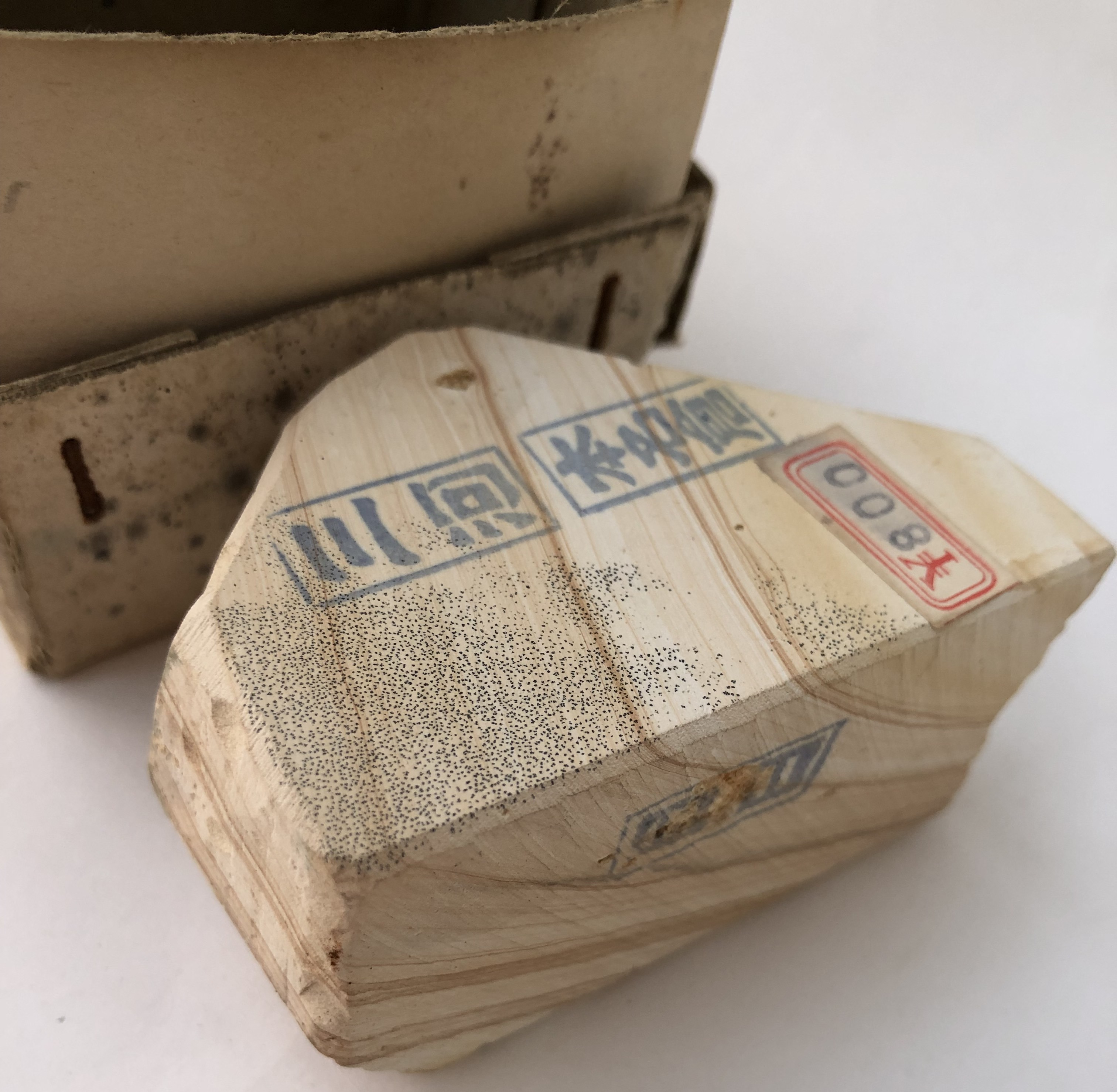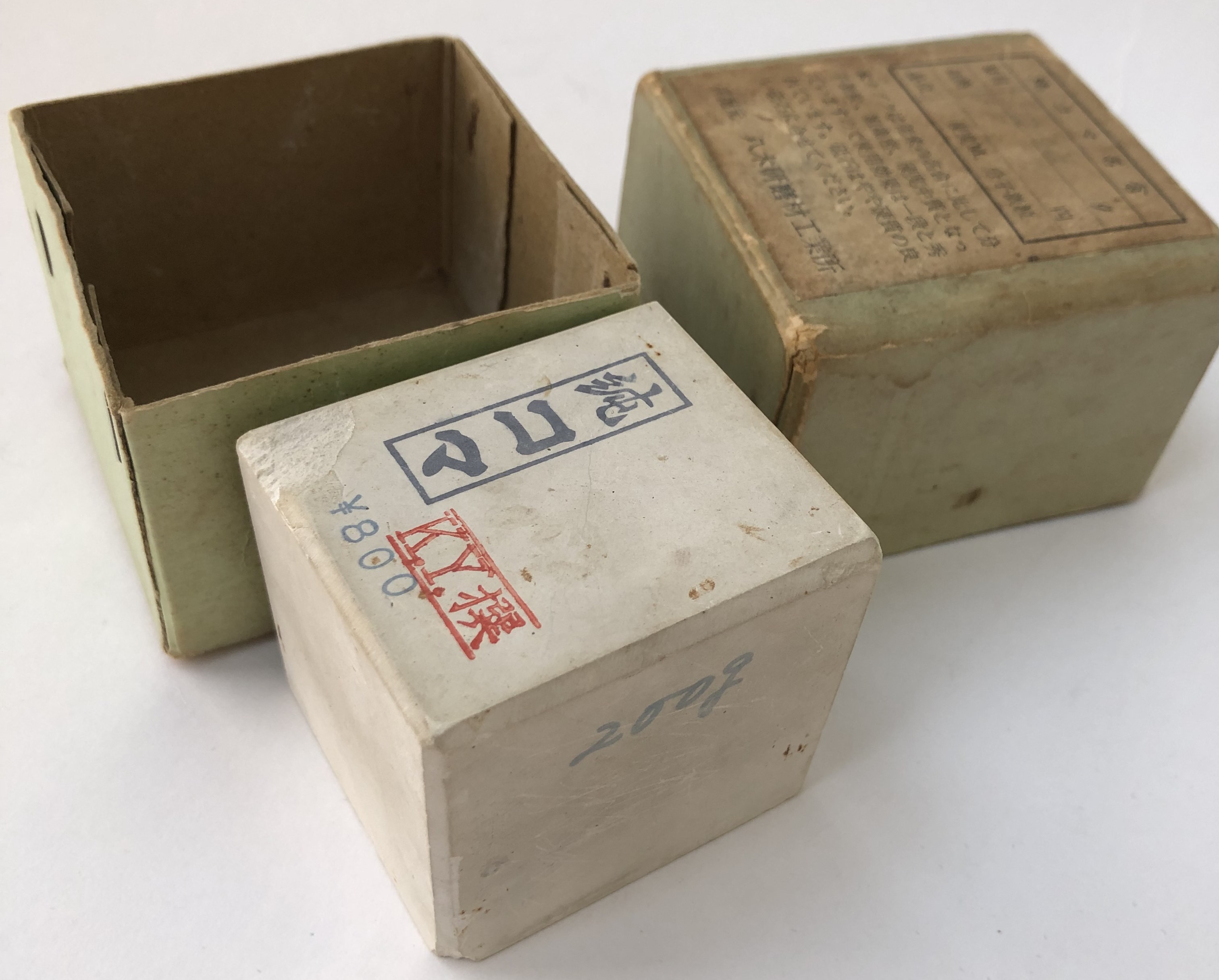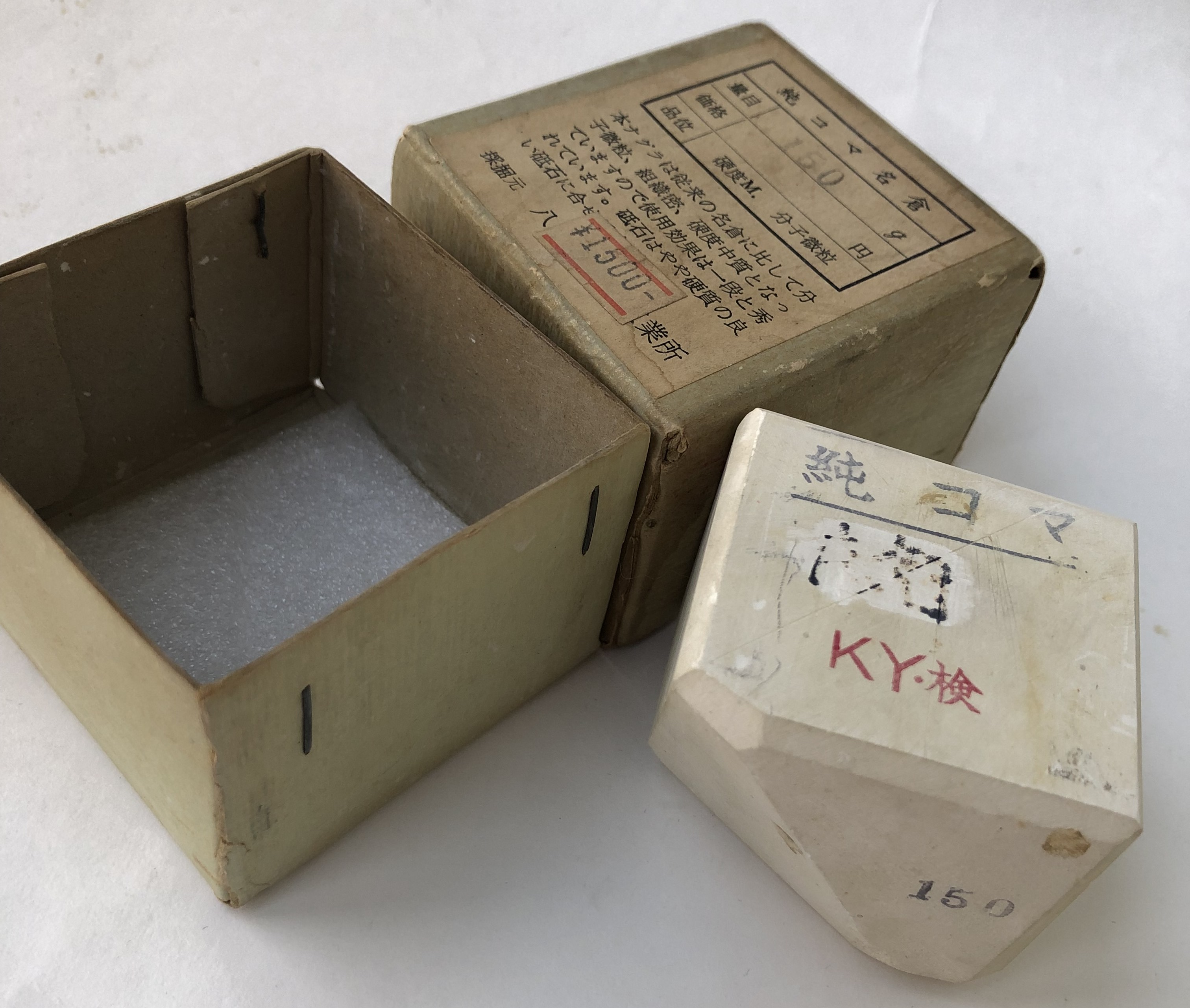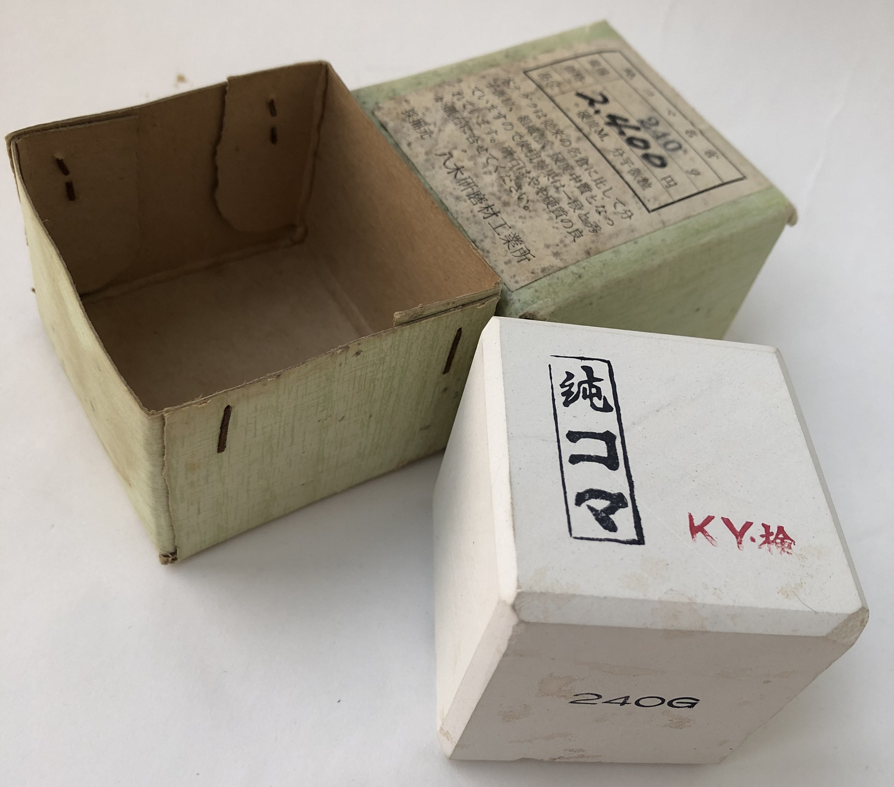 Предложу очень старенький японский бритвенный камушек, со парикмахерской. Хонияма киита. Что написано на обратной стороне коробки, не могу разобрать.
