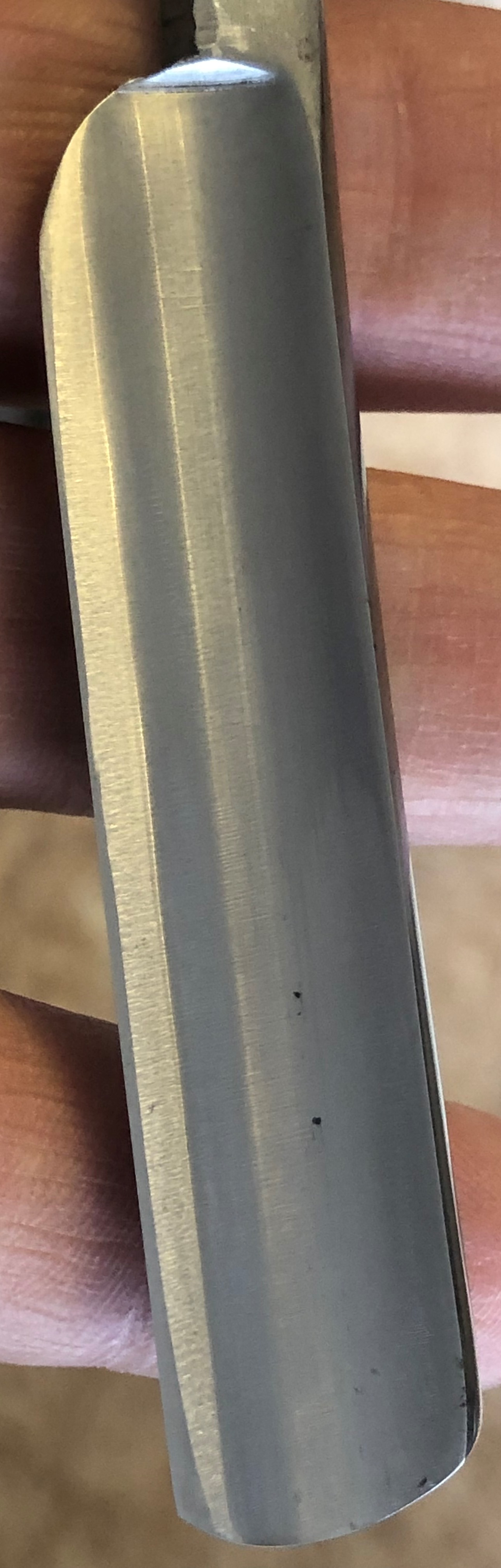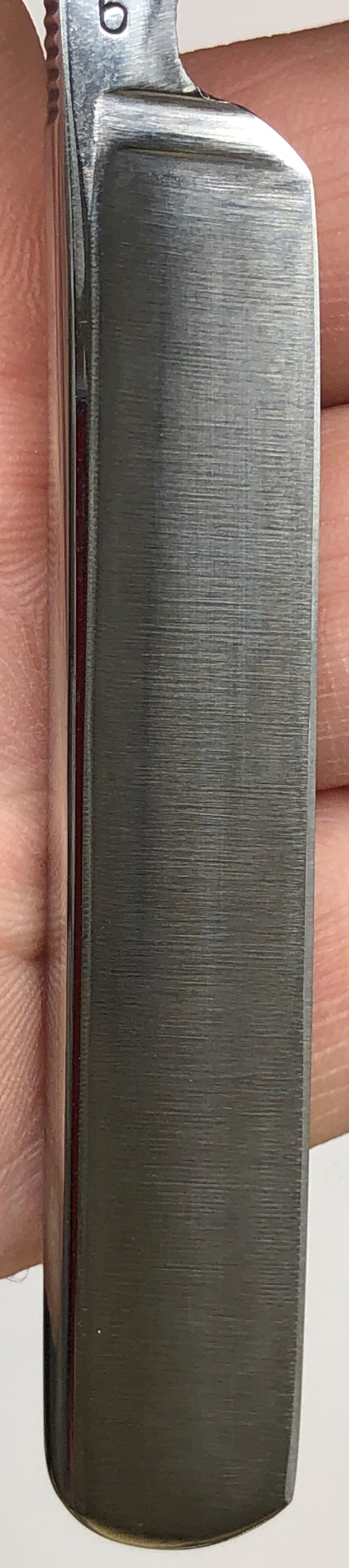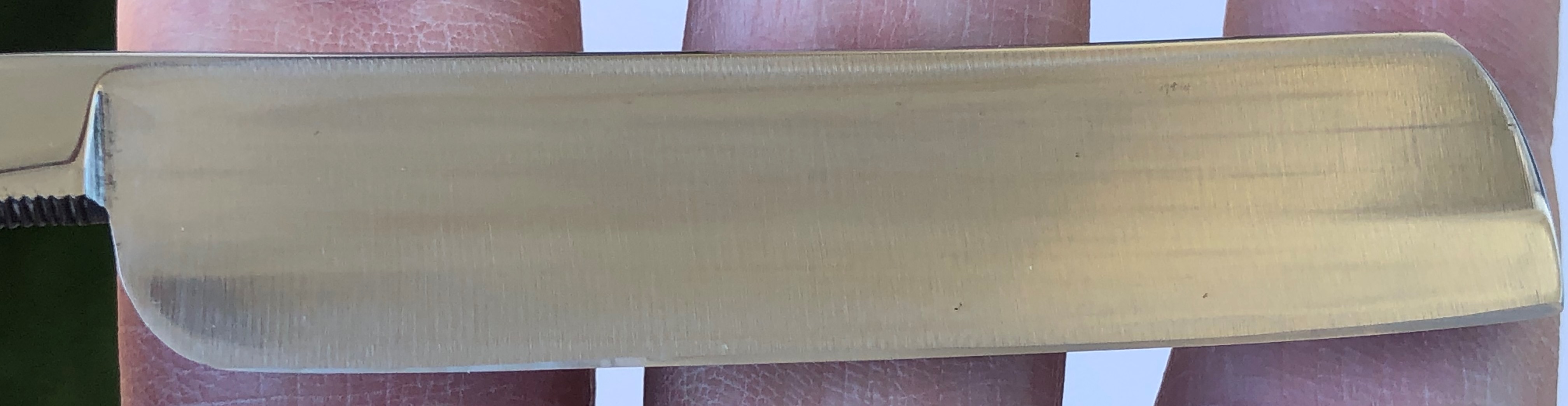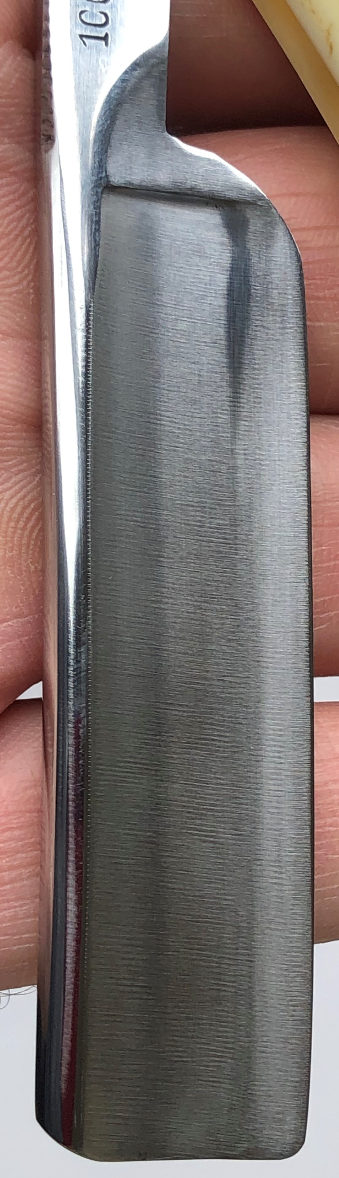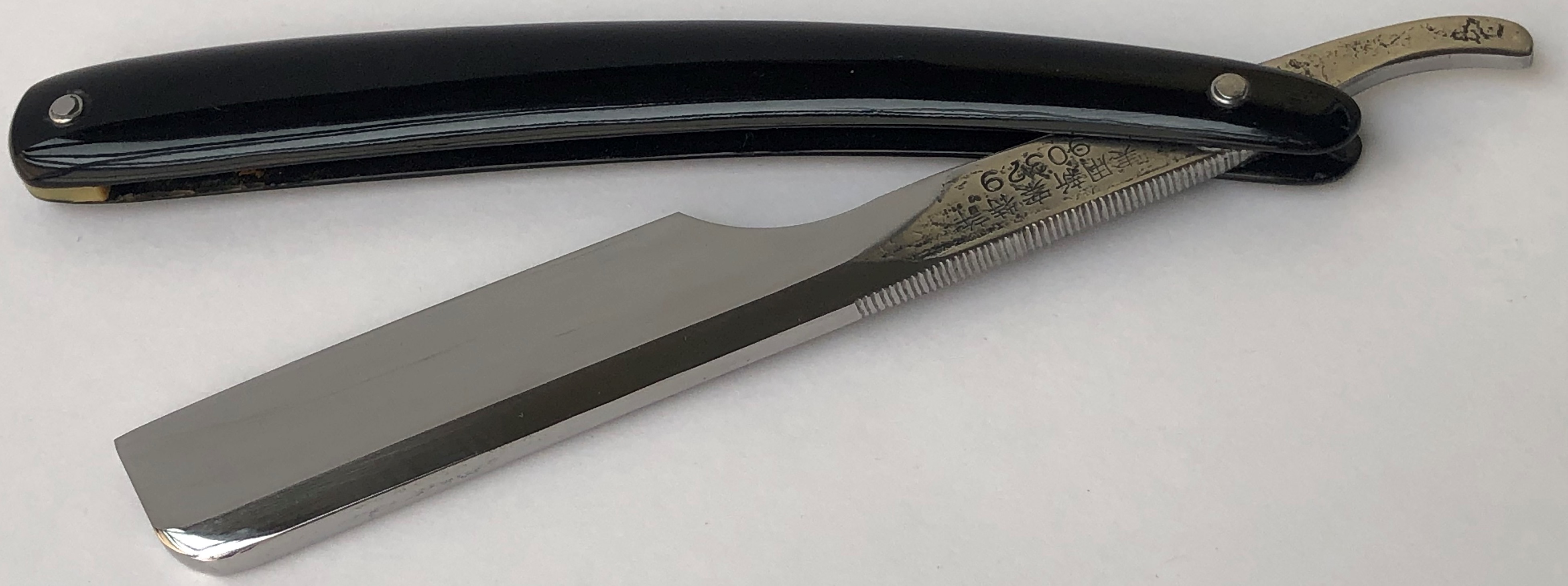 Бритва в пользовании не была.Клинок в идеальном состоянии.На самых тонких абразивах был освежен металл,с повторением "родного" гринда, а также умеренно отполирован.Оригинальную ручку заменил на эффектную оправу от японского послевоенного донора.В отличие от оригинала сейчас бритва смотрится намного интереснее.Само полотно чистое от разного рода видимых дефектов. Идеальная геометрия:кромочка равномерна по всей длине.Двух-цветные японские старинные пины, с добавлением внутренних шайб, для порядка.Отличный и недорогой вариант для новичка. Не пропустите.