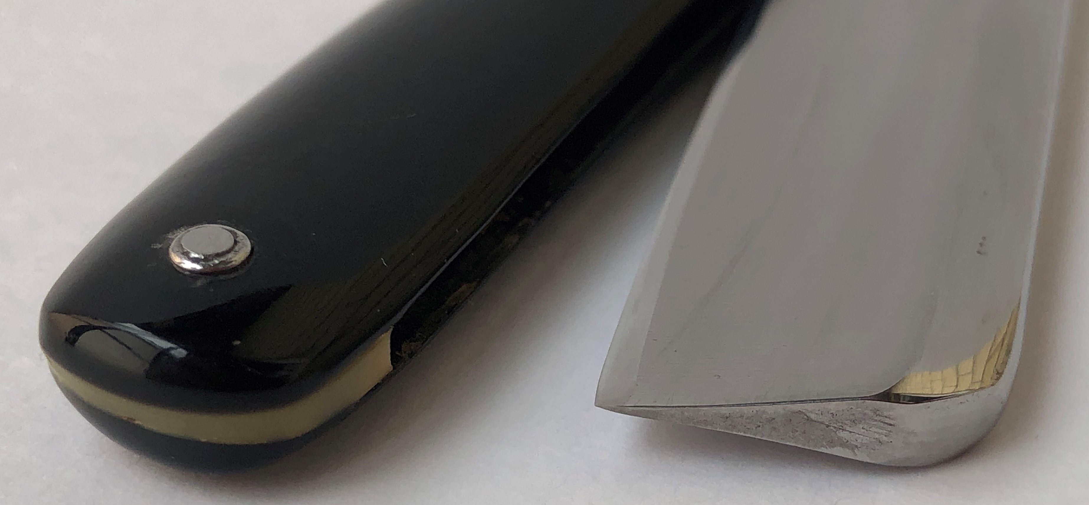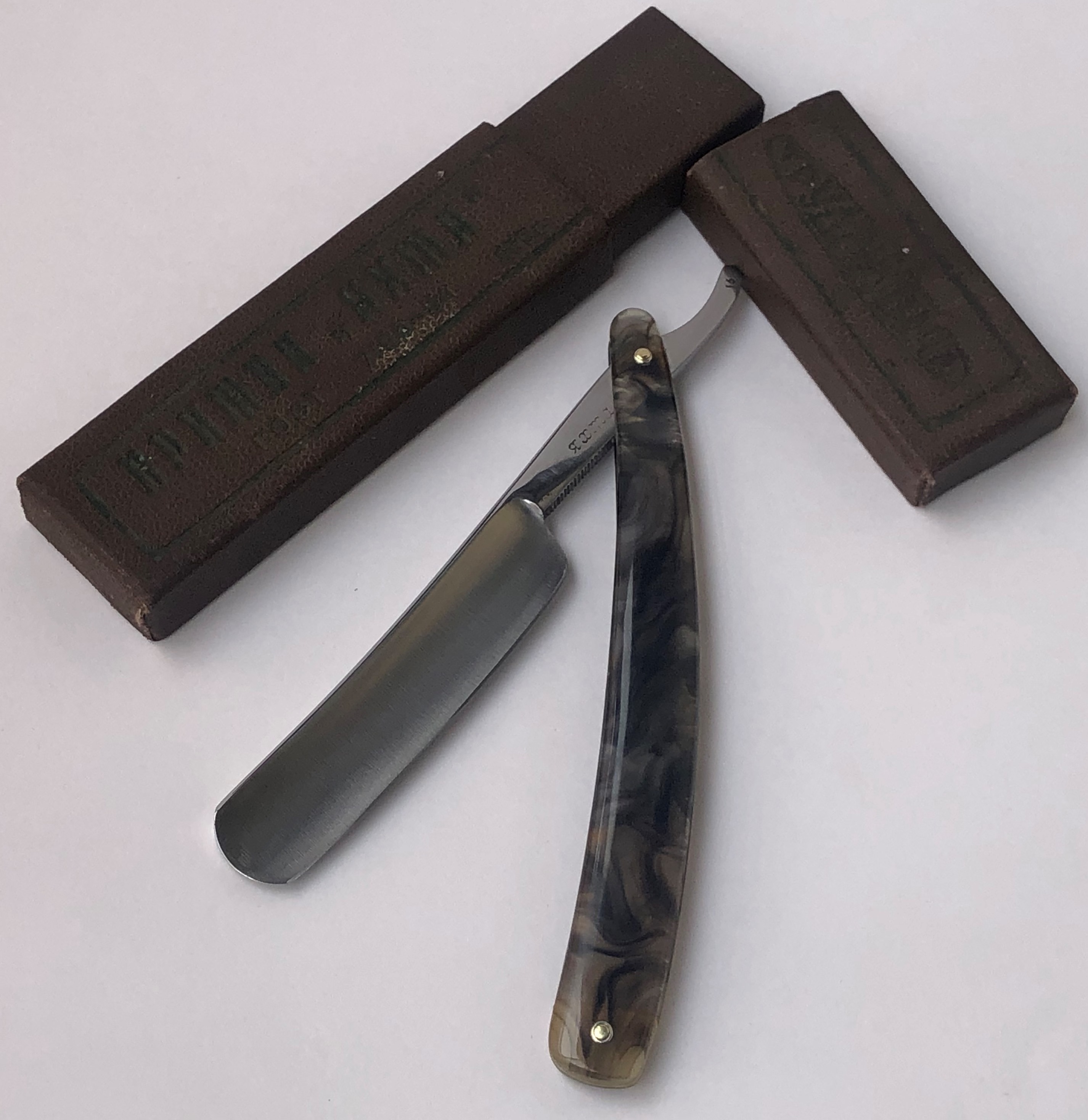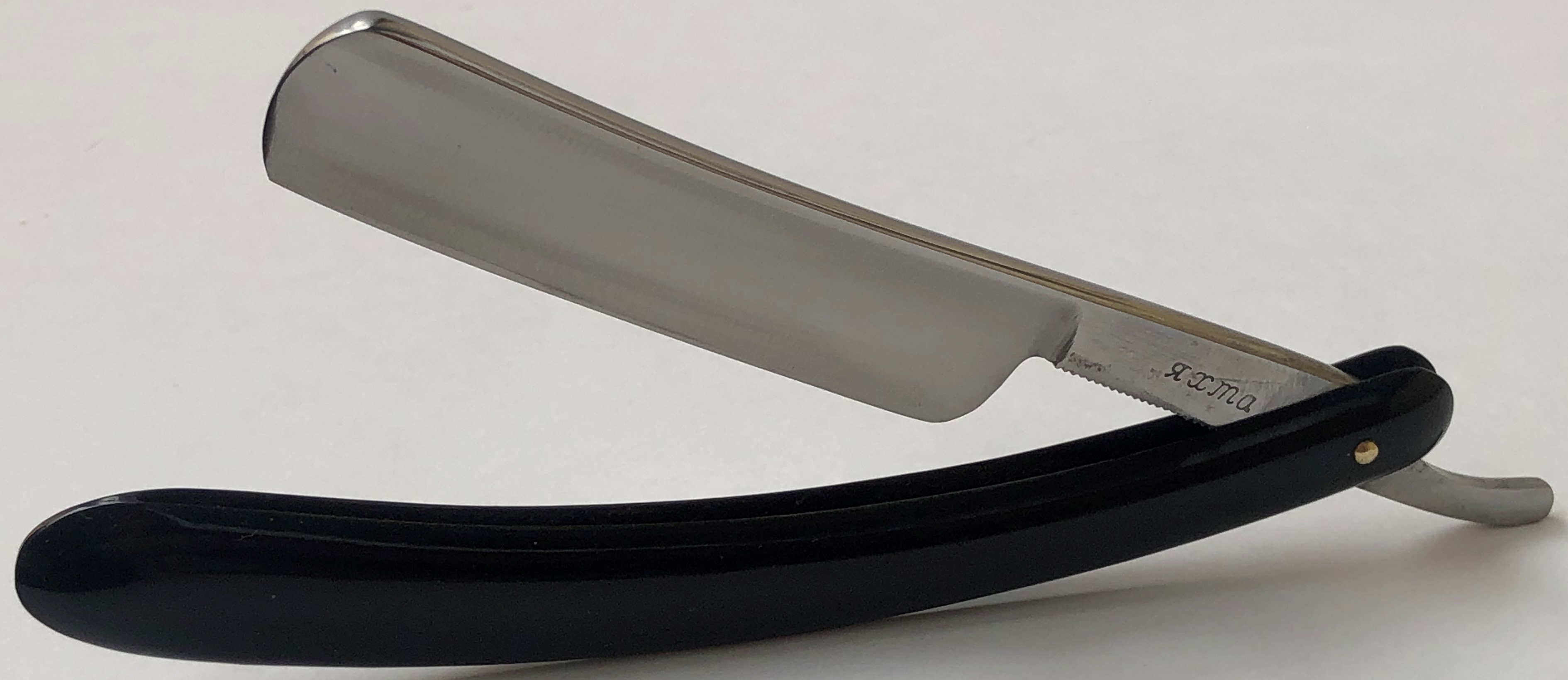 Бритва без следов пользования. Бритва была разобрана, немного освежено полотно от патины и снова собрано, с сохранением оригинальных пинов.Идеальная геометрия клинка:кромочка равномерна по всей длине.Сталь и кромка чистые от видимых дефектов.Бритва тяжёлая, мощная.Состояние новой.