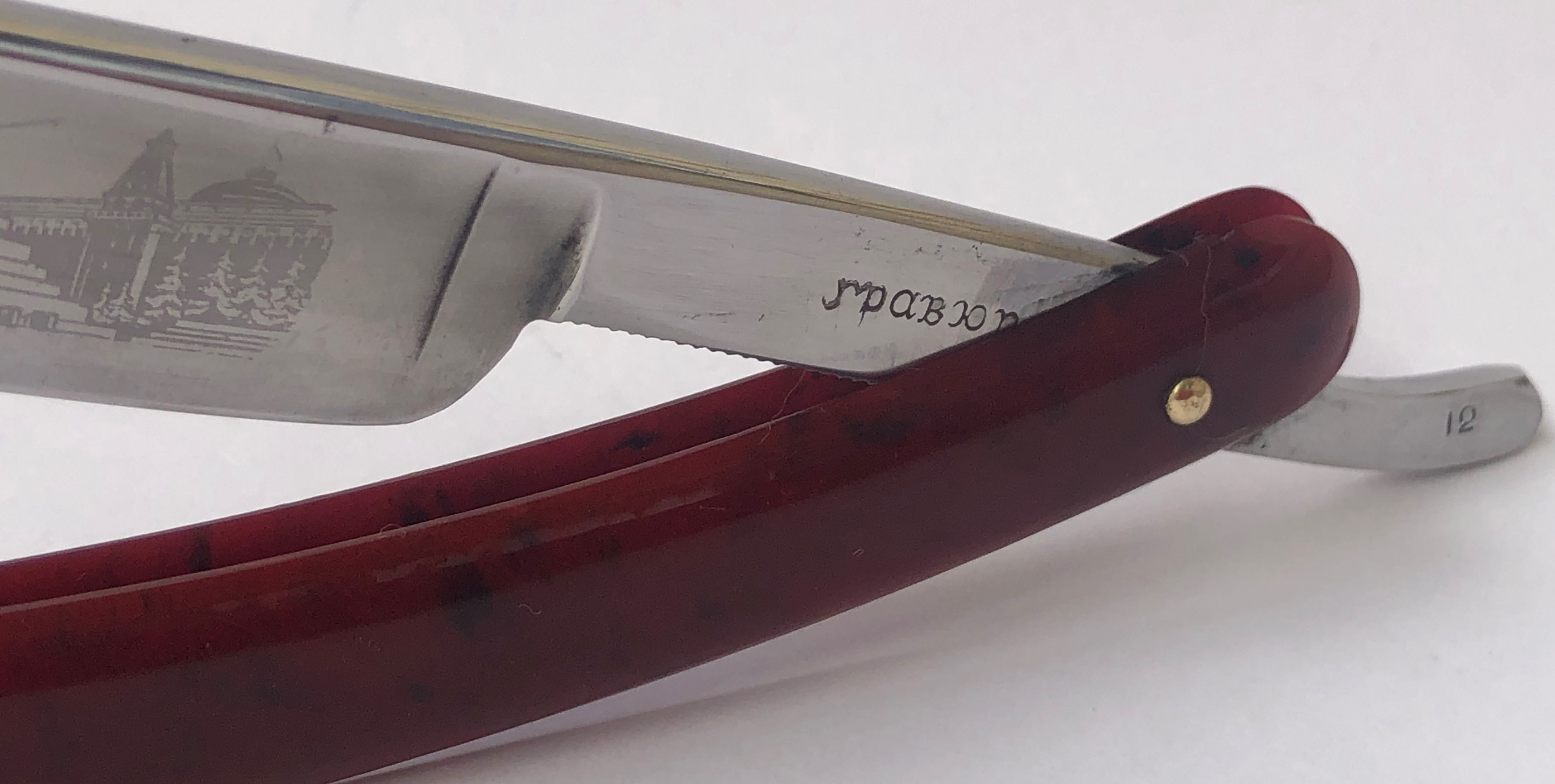 Непользованная бритва находится в прекрасном состоянии.Не разбиралась и не ремонтировалась.Для порядка вручную прошелся полиролью и все.Картинка четкая, без потертостей.Идеальная геометрия клинка:кромочка равномерна по всей длине.Полотно чистое от дефектов.Оригинальная коробочка!