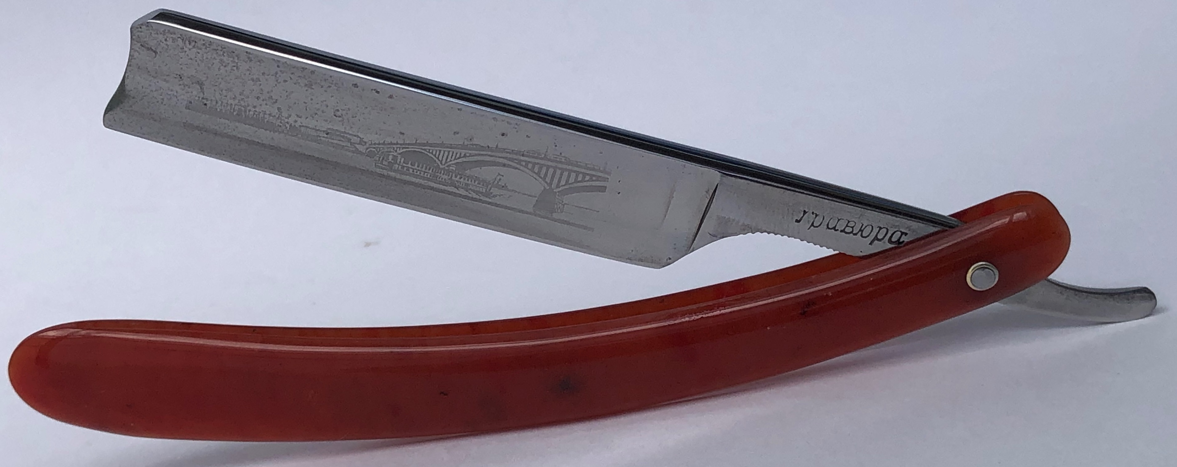 "ГРАВЮРА" 1955 года выпуска, от Труд Вача, в достаточно редком, таком "потовом" исполнении клинка, с парикмахерским вырезом.Изображение моста в Нижнем Новгороде.