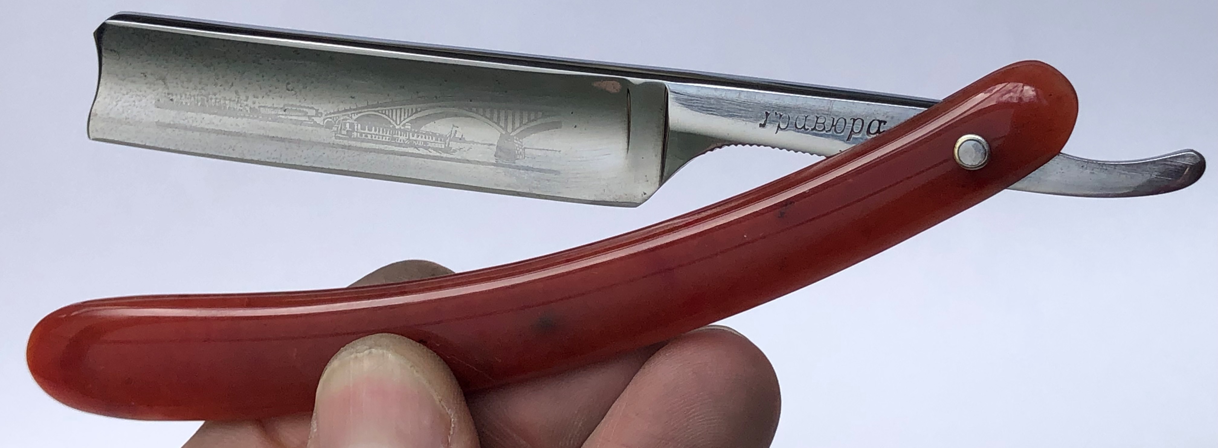 Кто бритву реставрировал и шлифовал полотно, мне не известно. По всей видимости бритва не разбиралась.Шлифовка аккуратная,кромочка ровненькая.Не стал ничего разбирать и чистить в районе осевого пина, но следы времени никоим образом не повлияют на процесс эксплуатации.