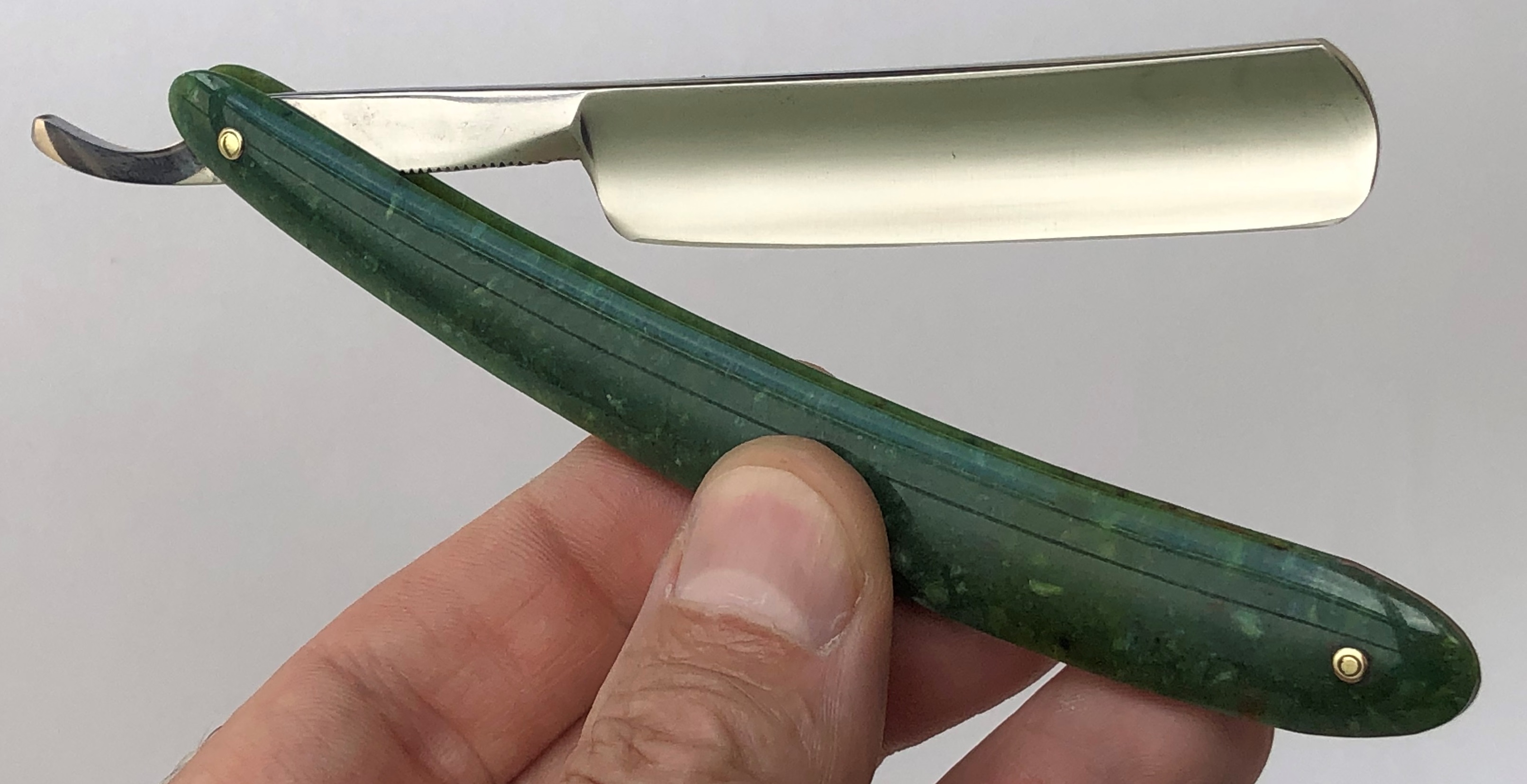 Бритва в хорошем , рабочем состоянии. Ничего не разбиралось и не ремонтировалось. Аккуратное использование , хранение и правильная заточка.Все в оригинале.Металл с элементами патины.Идеальная геометрия клинка:кромочка равномерна по всей длине.Красивая ручка "изумрудного" оттенка.Родная коробочка. Бритва заточена и готова к бритью.
