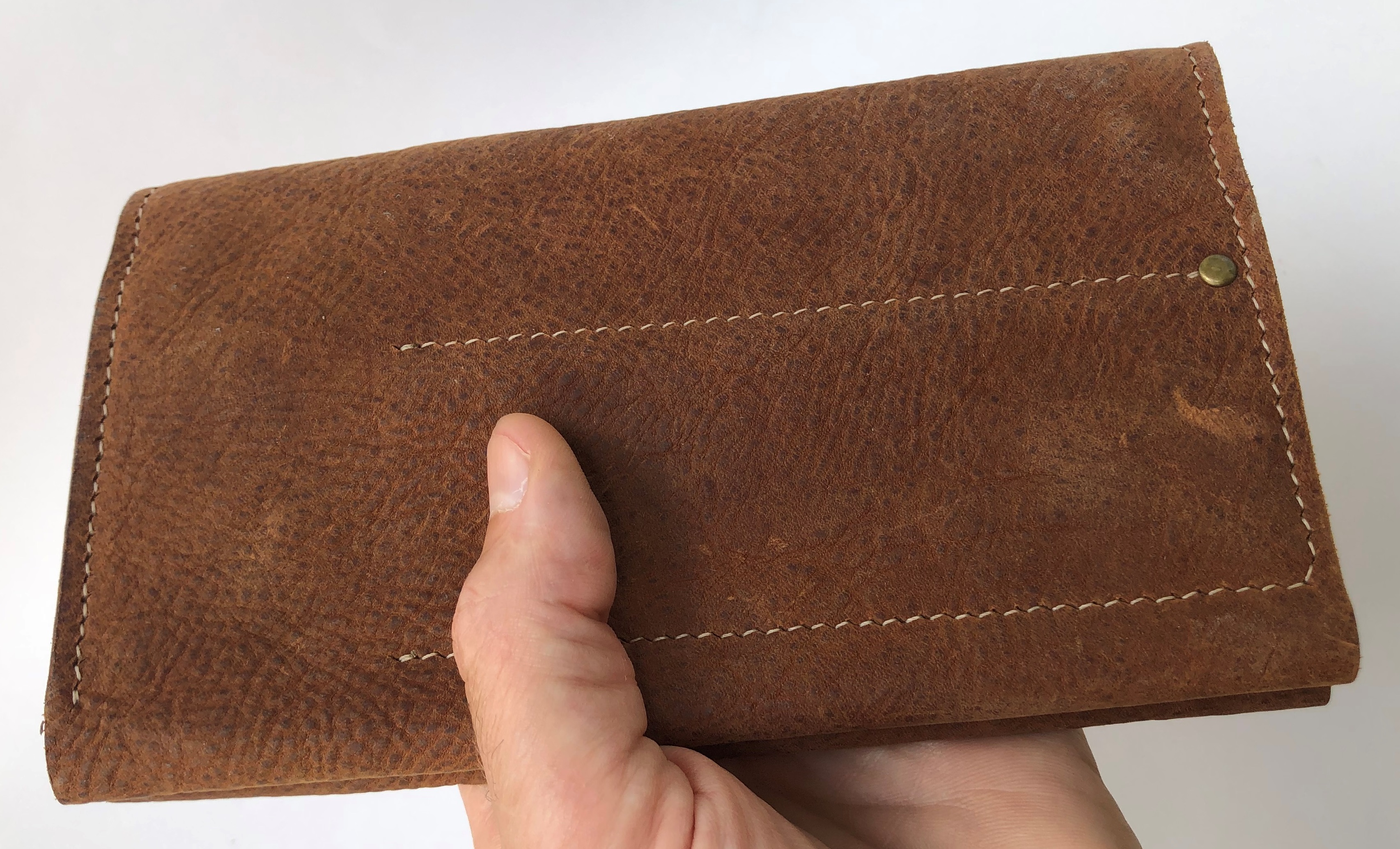 По всей видимости была изготовлена 7-8 лет назад. Идеальное состояние новой вещи. Двухсторонний. На одной стороне полотно кожи было поменяно (Александр,Винтаж студио).Кожа на обеих сторонах чистая, отполирована и пропитана костным маслом. Очень хорошо подойдет в качестве недорогого варианта для новичка, а также для походных условий.