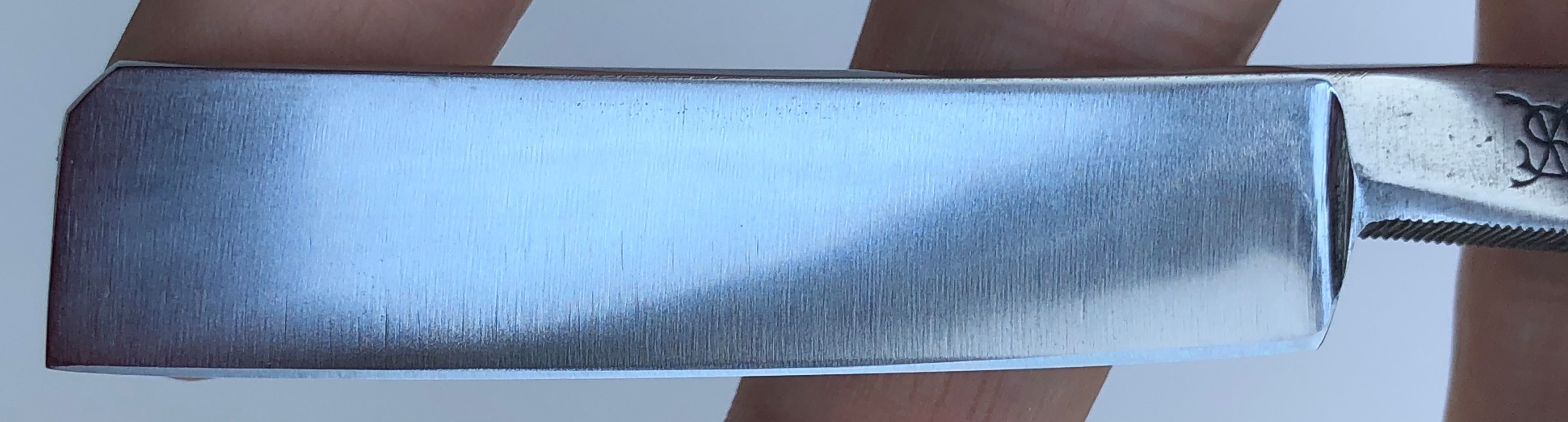 Само полотно на несколько мм укорочено.Было немного освежено от патины, с повторением "родного" характера шлифовки и умеренной полировки.Идеальная геометрия клинка. Сталь чистая, без видимых дефектов.Очень приятная во всех отношениях бритва, достаточно недорогая и если бы не укороченное полотно, то цены бы ей не было...