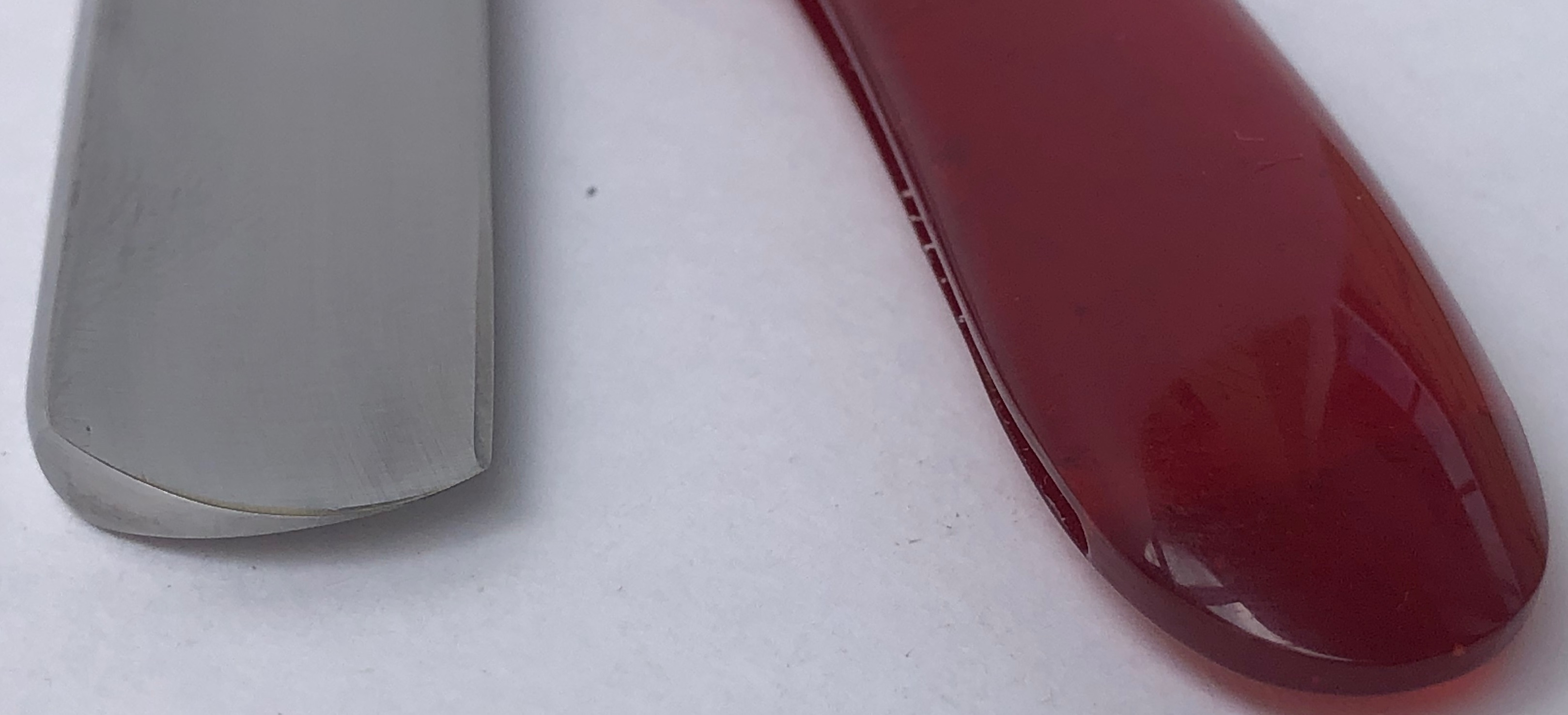 Бритва без следов пользования.Кривой осевой пин сохранил и переделал заново, с добавлением внутренних шайб, для надежности,ну и заодно почистил район осевого пина.Само полотно также немного освежил на тонких абразивах,с воссозданием типа "заводского" гринда.И умеренно отполировал.Идеальная геометрия клинка:кромочка равномерна по всей длине.Эффектная "спартаковская" оправа "изумрудного" цвета. Родная коробочка также 1956 года!