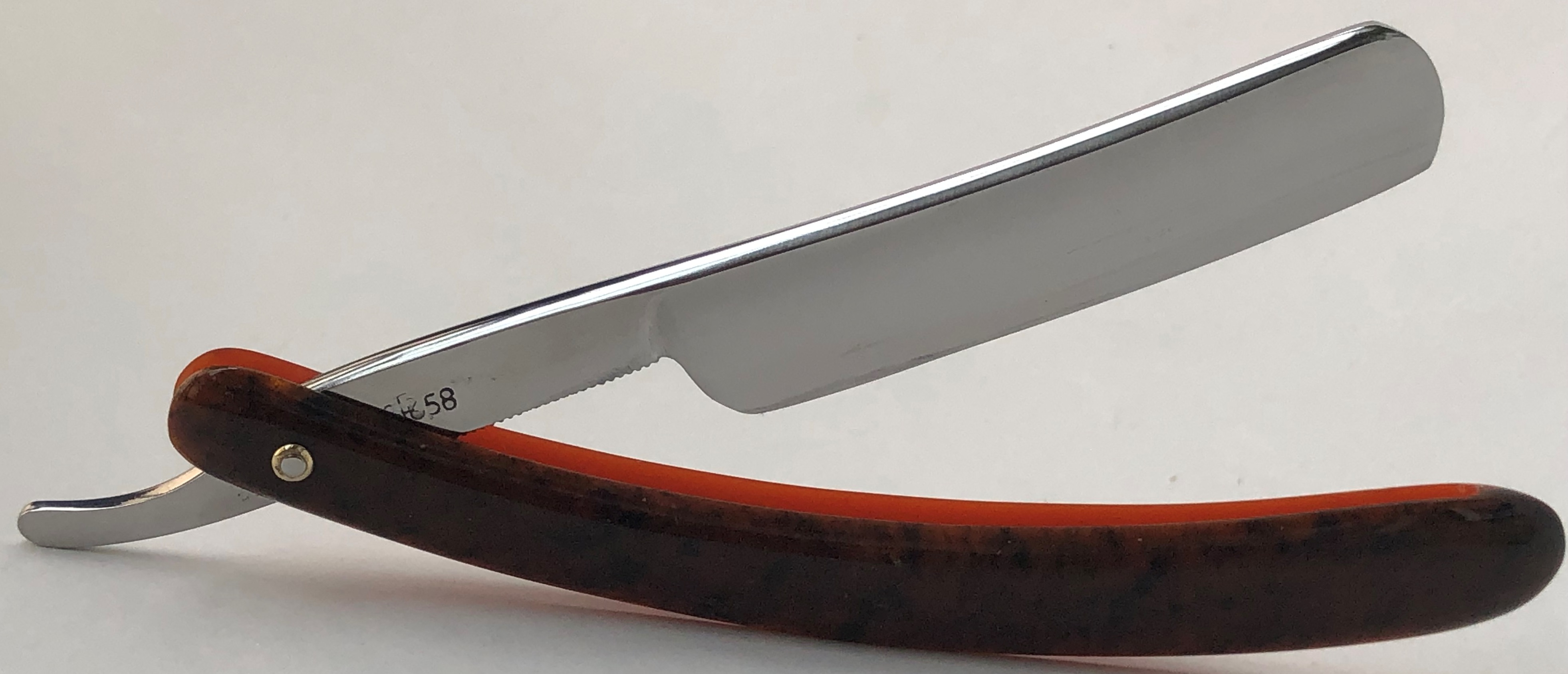 Бритва в очень хорошем состоянии.Аккуратное пользование и заточка, со знанием дела. Была разобрана, чтобы убрать небольшие очаги коррозии в районе осевого пина и обушка.Перешлифовка и переполировка клинка.Пластиковые накладки целые, без трещин и деформации.Очень удобная и эффектная вещь.Кромочка равномерна пов сей длине.Добавил внутренние шайбы, для порядка.Двух-цветные пины.Бритва заточена и готова к бритью.