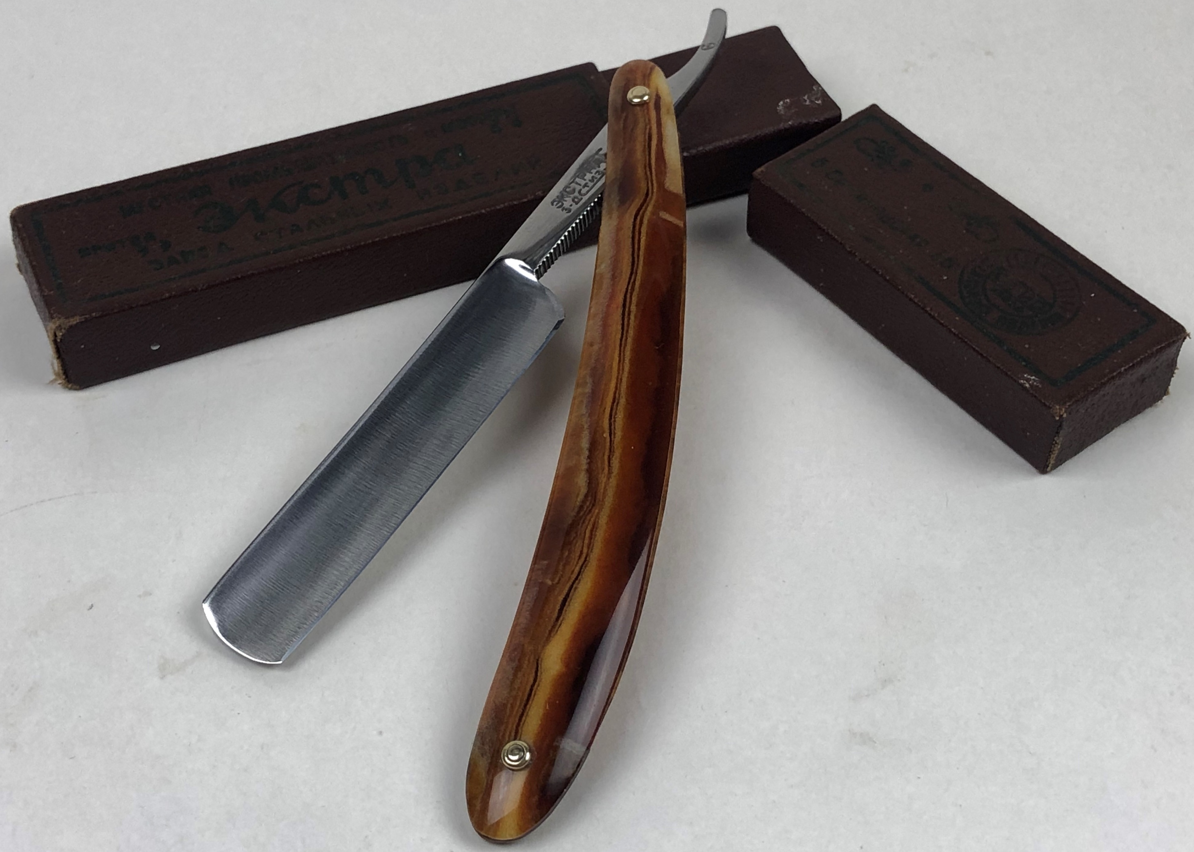 Бритва в прекрасном состоянии для своих лет.Ранее не была в пользовании.Разобрал бритву, чтобы поменять родные медные заклепки на эффектные двух-цветные пины, с добавлением внутренних шайб.Заодно немного полирнул сам клинок в районе эрля и немного освежил полотно на тонких абразивах и также умеренно отполировал.Впервые мне попадается Труд Вача с таким написанием на эрле.Похоже не на штамп, а на гравировку.Завораживающий цвет и рисунок оправы.Геометрия близка к идеальной. Сталь чистая, без дефектов.Родная коробочка целая, хоть и немного приплюснутая. Не пропустите красивую и редкую вещь в свою коллекцию.