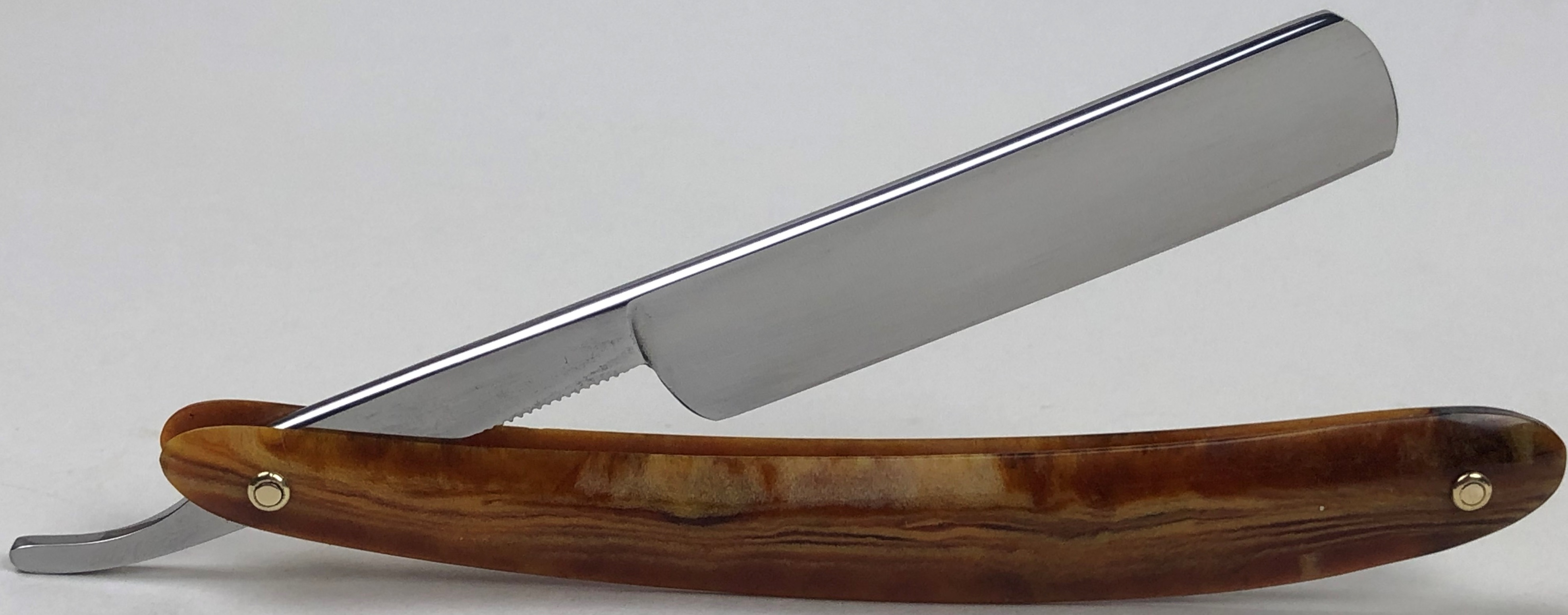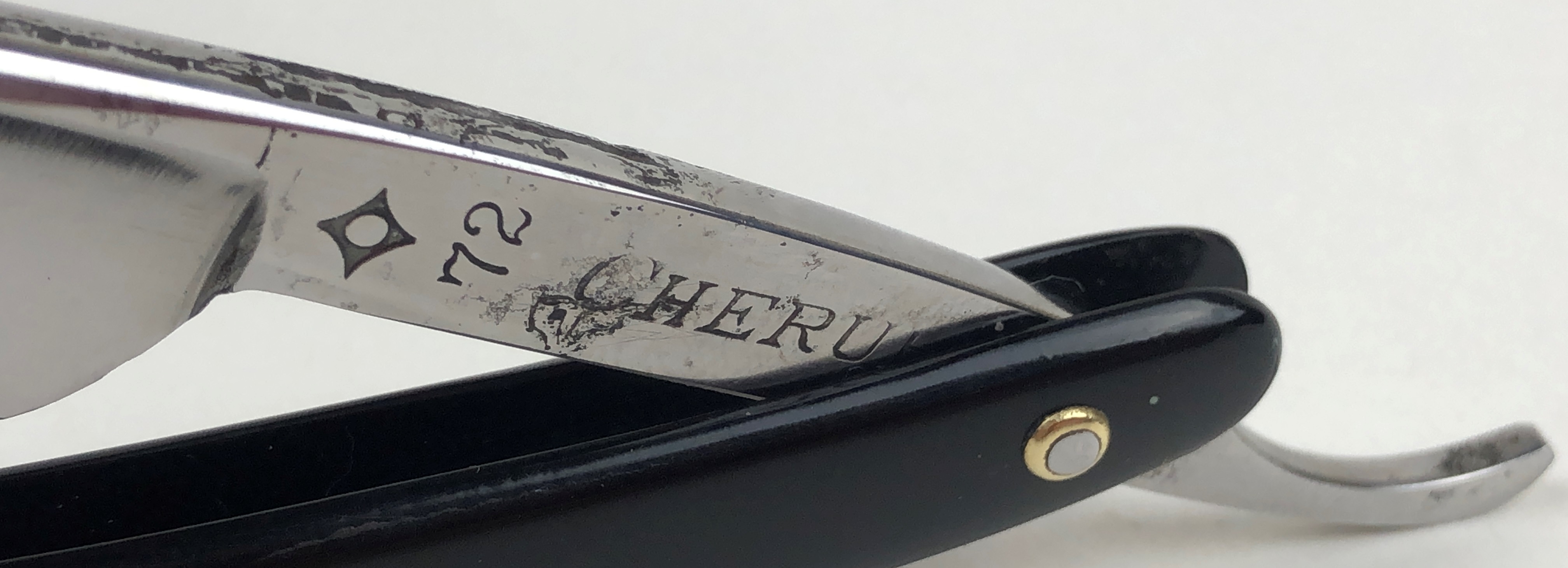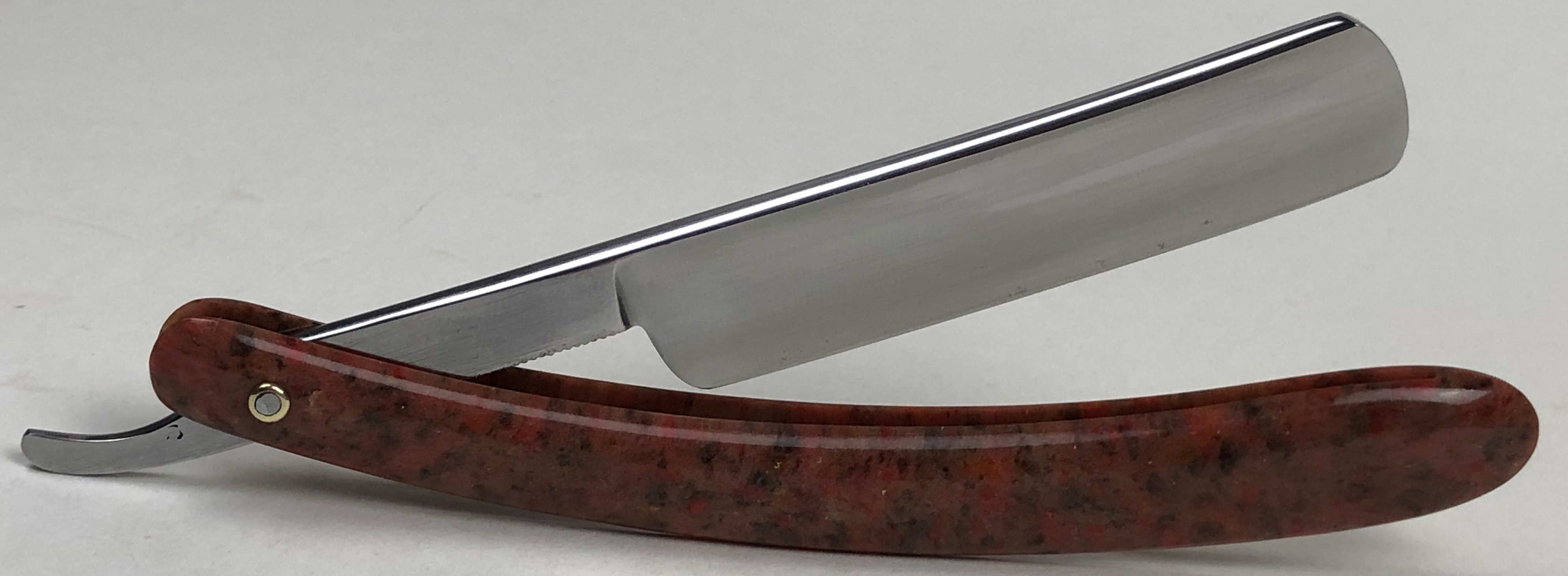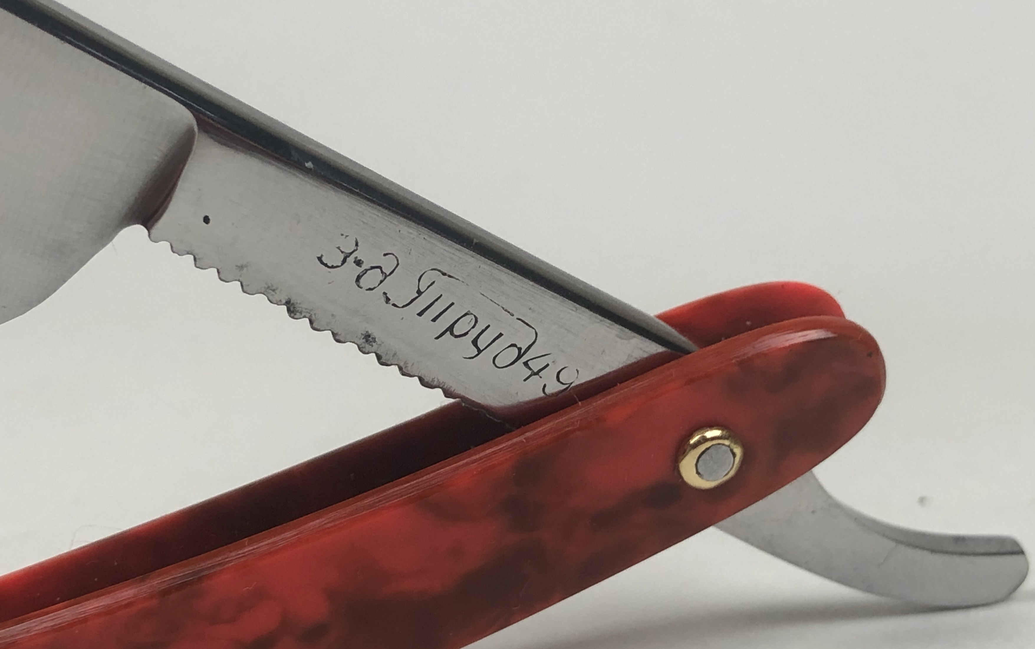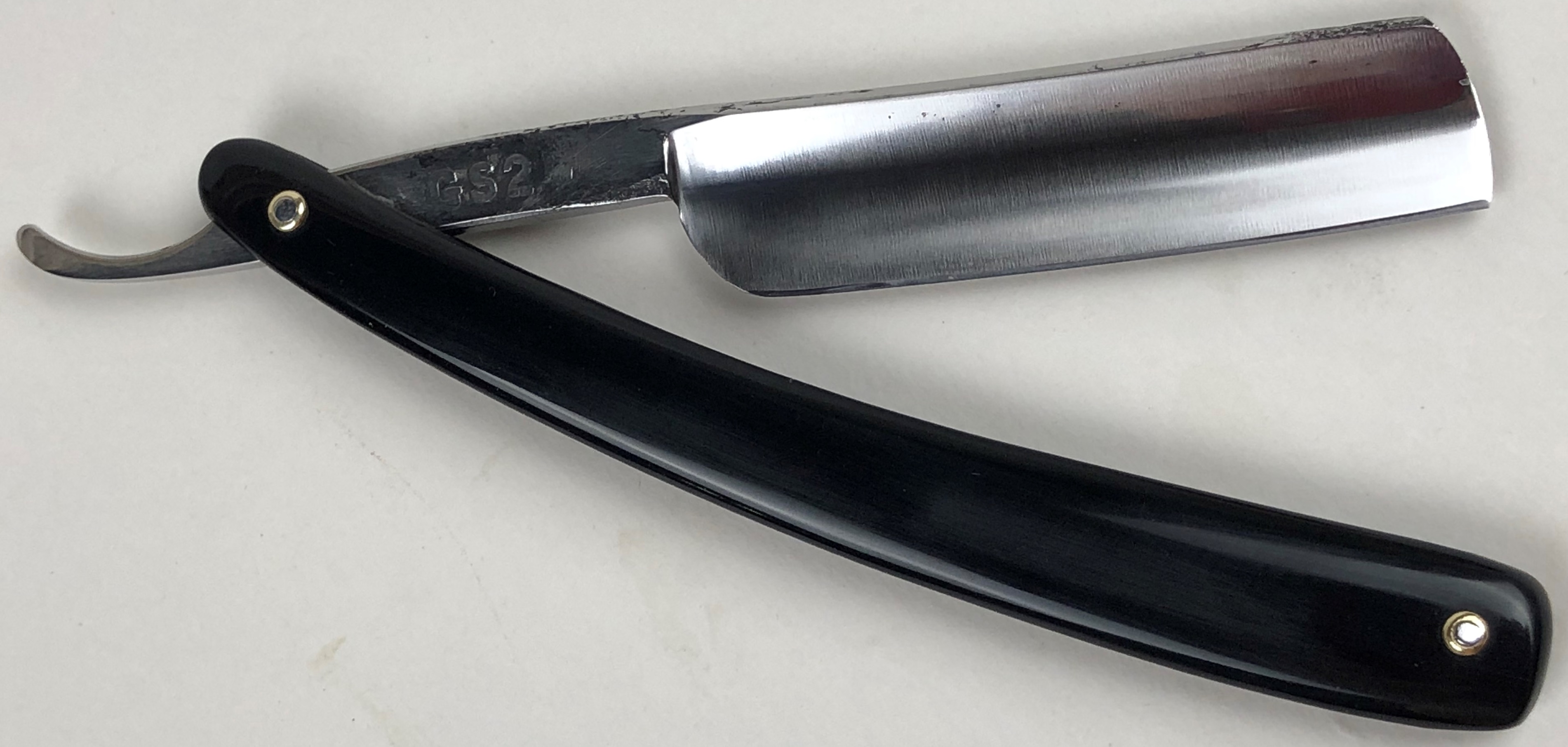 Бритва в очень хорошем состоянии. Немного откорректировал утОчку обушка и умеренно отполировал клинок.Поменял пины на двух-цветные втулки и добавил внутренние шайбы.Идеальная геометрия:кромка ровненькая по всей длине полотна.Тяжёлая.Заточена и готова к бритью.