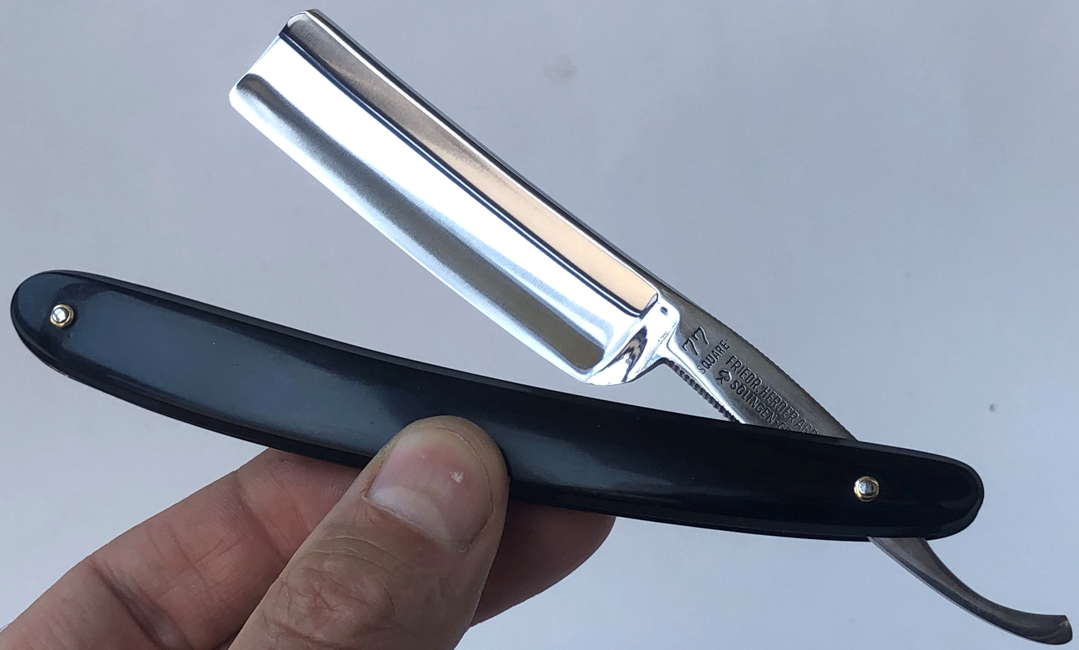 Довольно редко встречающаяся модель бритвы.Хочу обратить внимание, что форма лезвия является оригинальной, а не следствие каких то работ.(За 13 лет попадается третья и везде форма клинка была такая же).Если мне не изменяет память, то это единственная модель Хенка, с таким "гранёным" обушком.