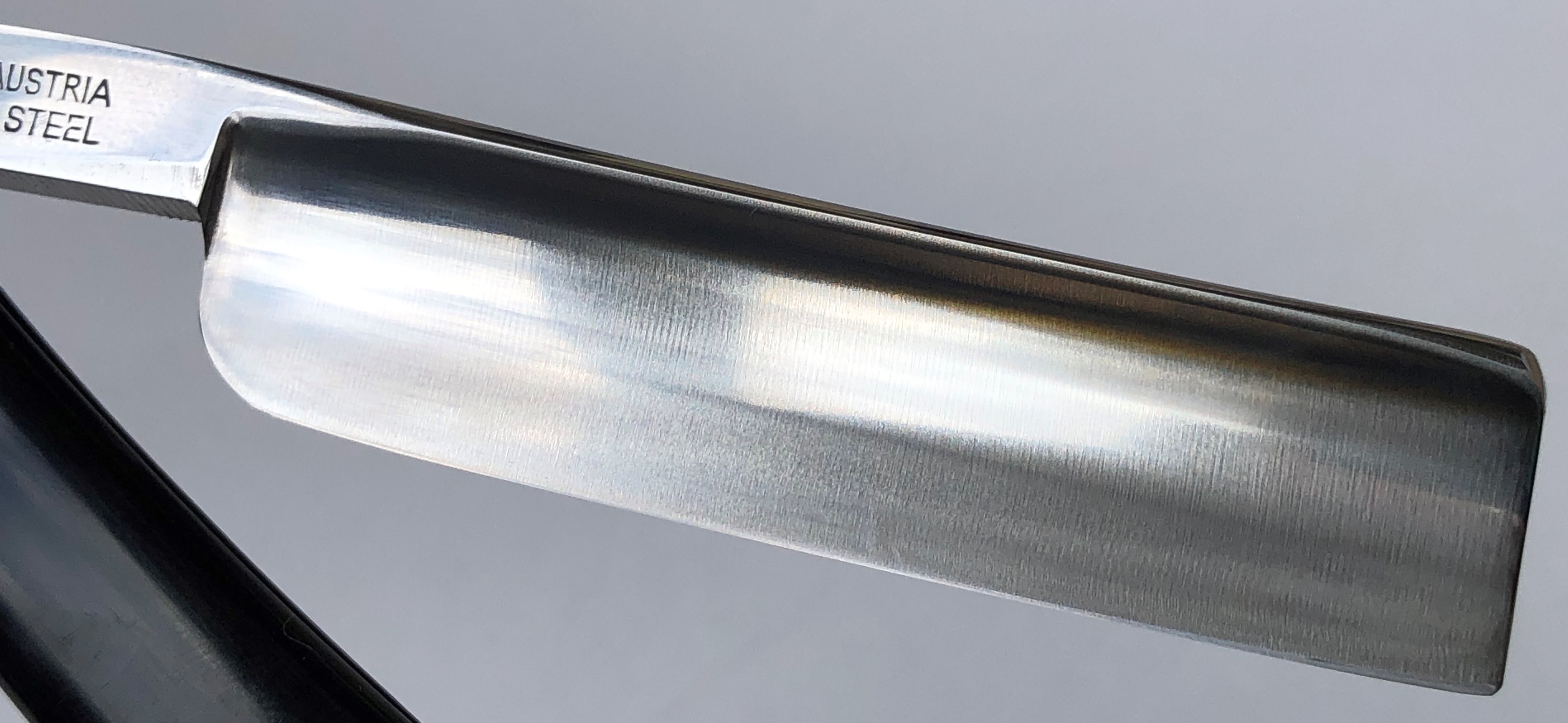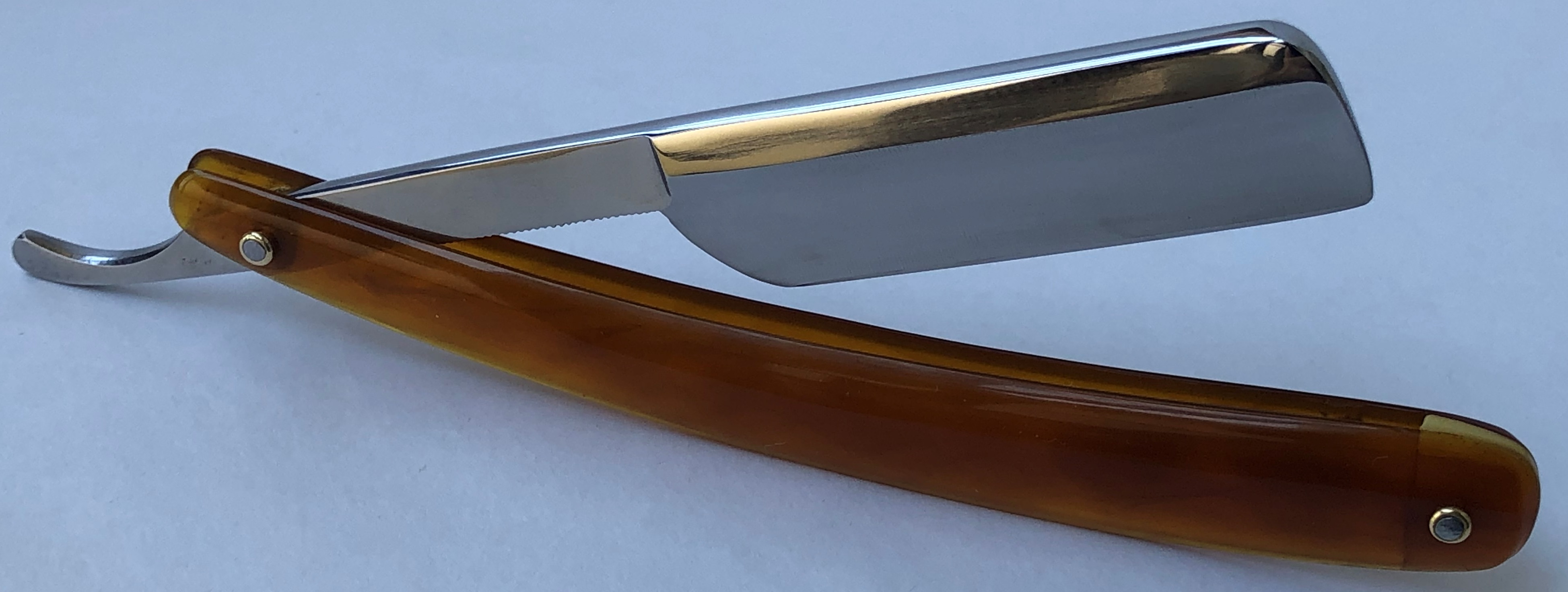 Бритва в очень хорошем состоянии, без активных и еле заметных следов пользования. Ничего не разбиралось и не ремонтировалось. Все в оригинале.Идеальная геометрия полотна.Кромочка чистая от дефектов. Несколько незначительных "точек времени" не стал трогать за ненужностью.Удобная форма клинка. Достаточно тяжелая.Эффектный, ажурный обушок.Очень неплохой вариант для коллекции и для бритья. Исходя из своего опыта могу сказать, что именно нержавеющие стали Фриодур были наиболее подходящие для бритв.