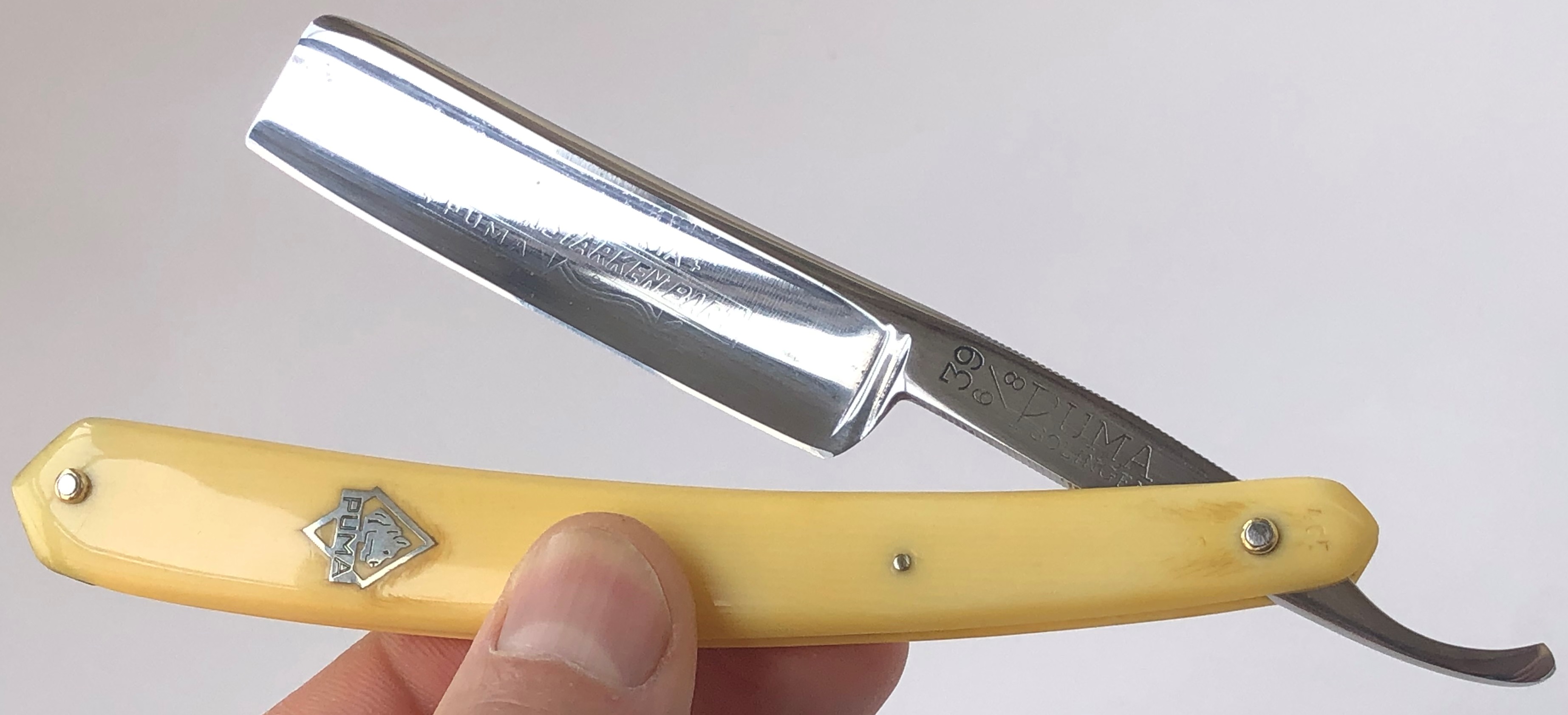 Бритва видавшая виды,но вполне живая , с допустимой шириной полотна.Утрата всего около 2-2.5 мм.Была разобрана, почищена и снова собрана, с заменой внутренних шайб и пинов.Лицевую сторону не трогал, так что немного "следов времени" имеет место быть.Кромочка равномерна по всей длине.Сталь чистая.Родная трёх-пиновая оправа в идеальном состоянии.Сам по себе бренд Пума довольно дорогой, так что не каждому по карману приобрести коллекционную вещь.В связи с этим покупка именно такого совершенно недорогого образца будет очень хорошим компромиссом,без потери качества стали и бритья.Бритва заточена и готова к бритью. Не пропустите!