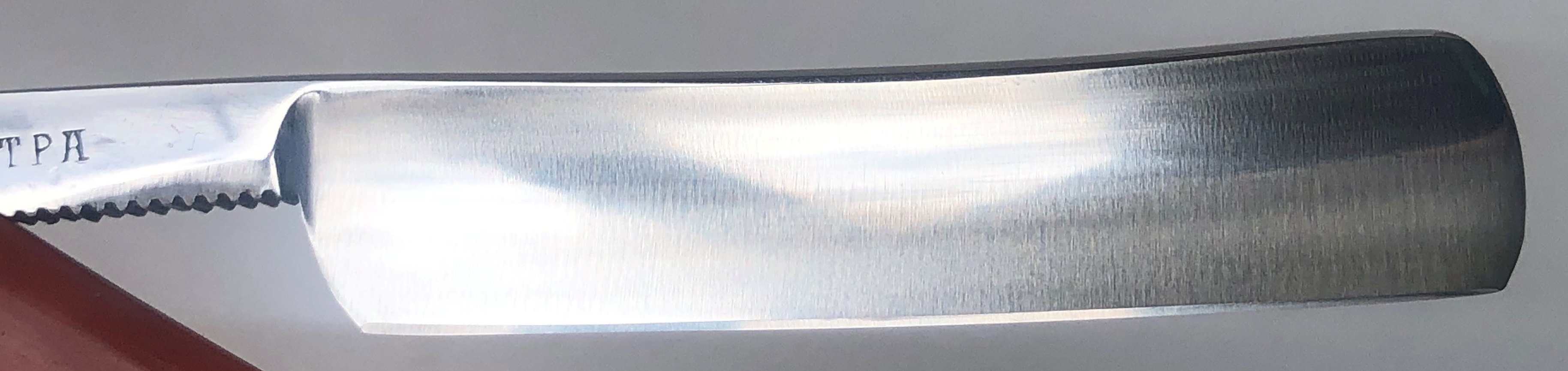Бритва в пользовании не была, но требовала минимальных, косметических работ, в виде чистки и полировки района осевого пина, а также освежения самого полотна.Пины заменил на двух-цветные втулки.Сталь чистая, без видимых дефектов.Идеальная геометрия клинка:кромочка идеально ровная и еле заметна.Красивая и удобная форма лезвия, не только для обучения новичков, но и для постоянного пользования. Тут шикарная "звонкая" сталь, способная выдавать качественное и мягкое бритьё.На мой взгляд, ну лучше по качеству уже не может ничего быть, если не смотреть на известные имена и дорогущие бренды. Можно сказать, что бритва может быть одной единственной и на все времена. Заточена и готова к бритью. Не пропустите профессиональный ,парикмахерский инструмент в свою коллекцию!
