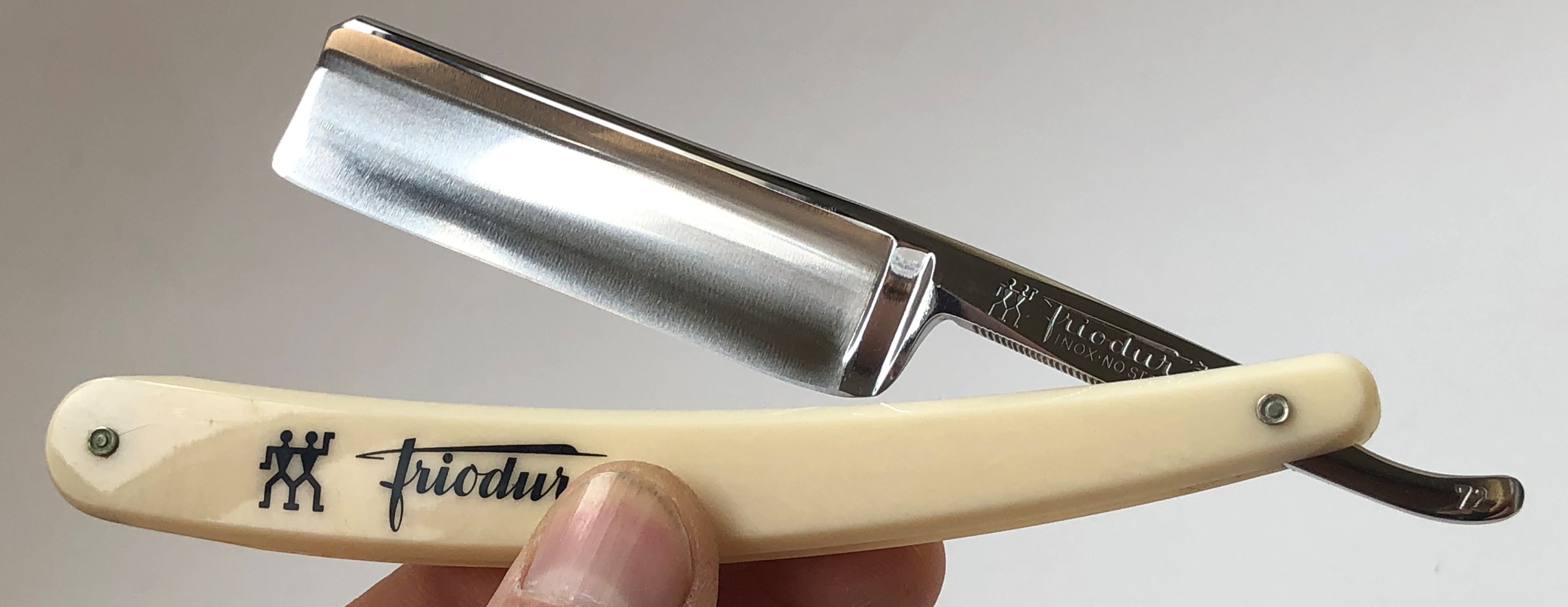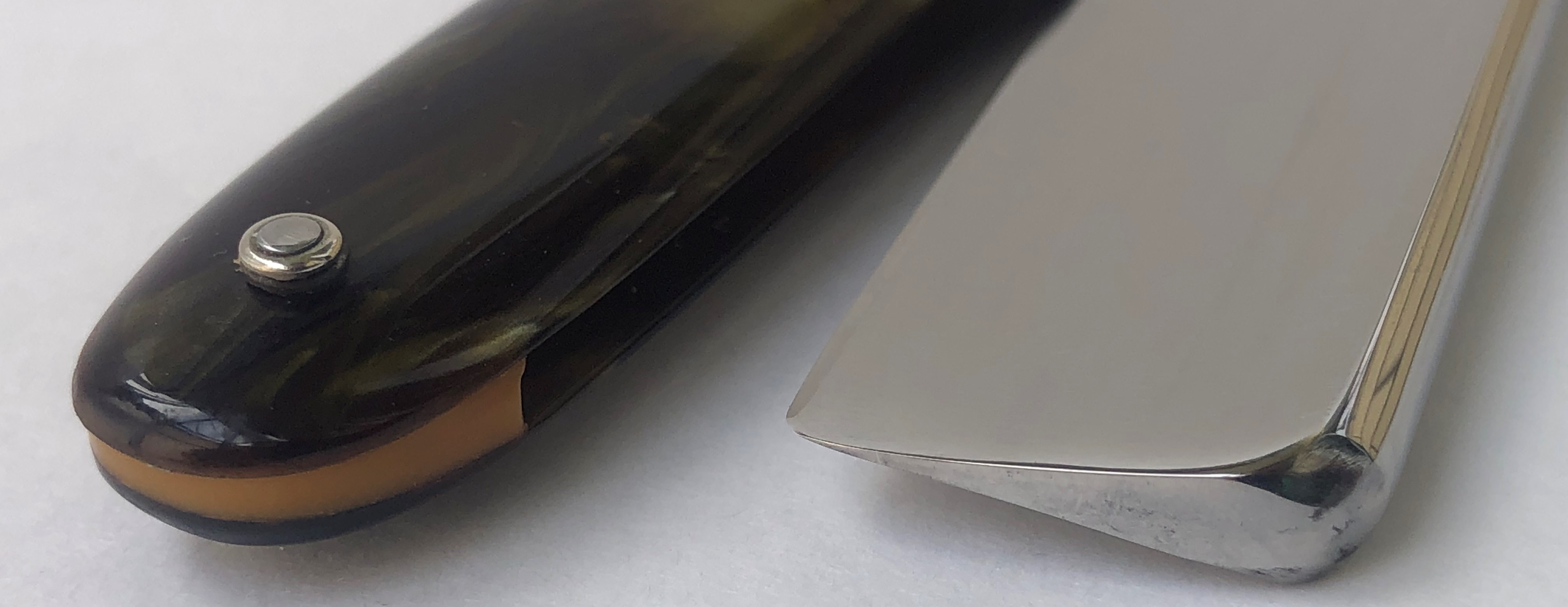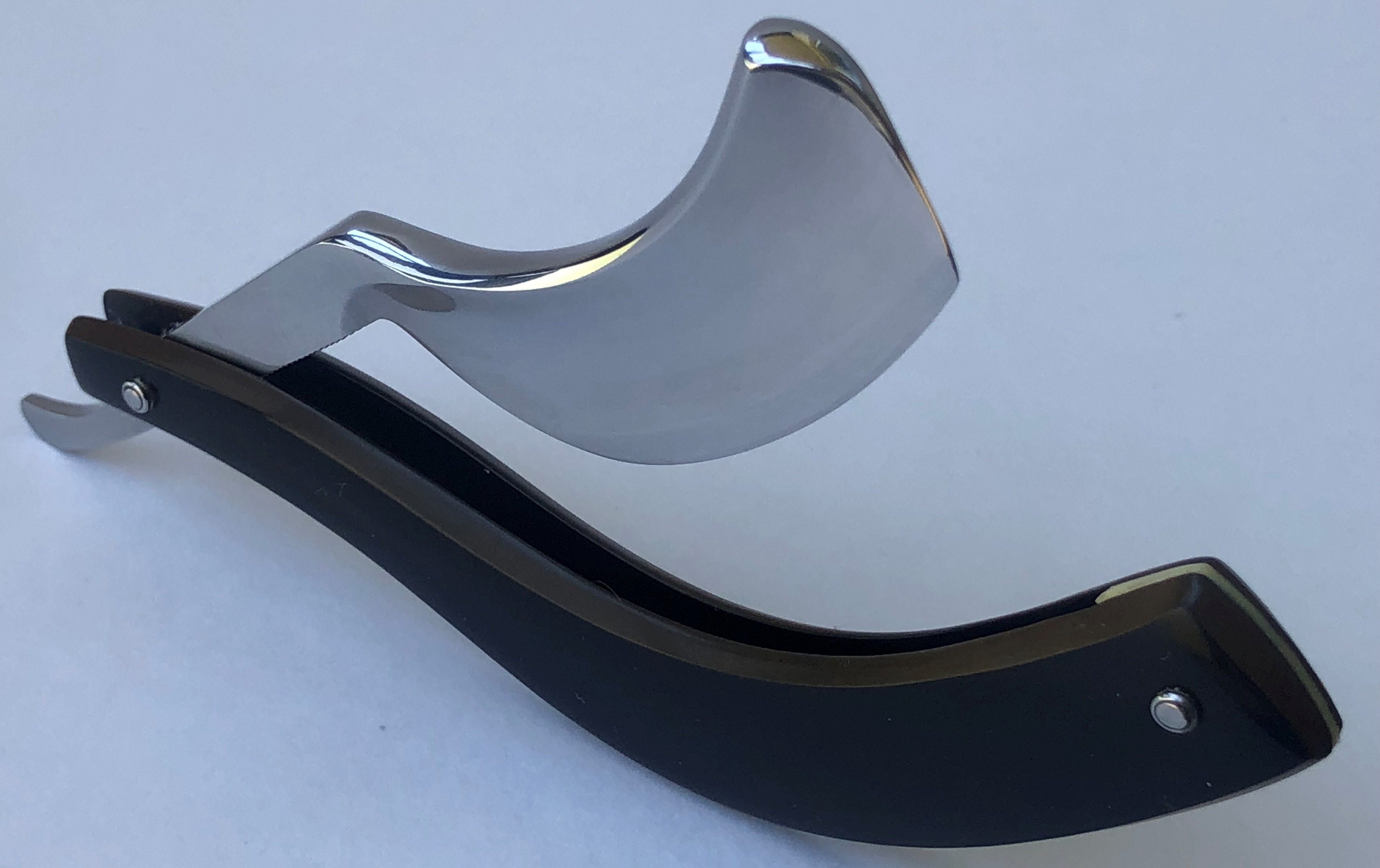 Очень интересная вещь. Никогда ничего подобного мне не попадалось.Тут имеет место быть некое сочетание традиционных, чисто японских форм,как у камисори, но с равномерный строем клинка, как у фреймов.Тем товарищам, которым не совсем удобно пользовать односторонние камисори,именно такая бритва может подойти в самый раз.По желанию,в будущем, можно будет установить накладки на ручку, из какого нибудь эффектного и красивого материала и будет еще более удобно пользоваться инструментом.Сам клинок без следов пользования. Полотно имеет идеальную геометрию:кромочка равномерна по всей длине.Тут, как и на всех бритвах этого ординарного бренда, очень хорошая и способна выдавать чистое и мягкое бритьё.