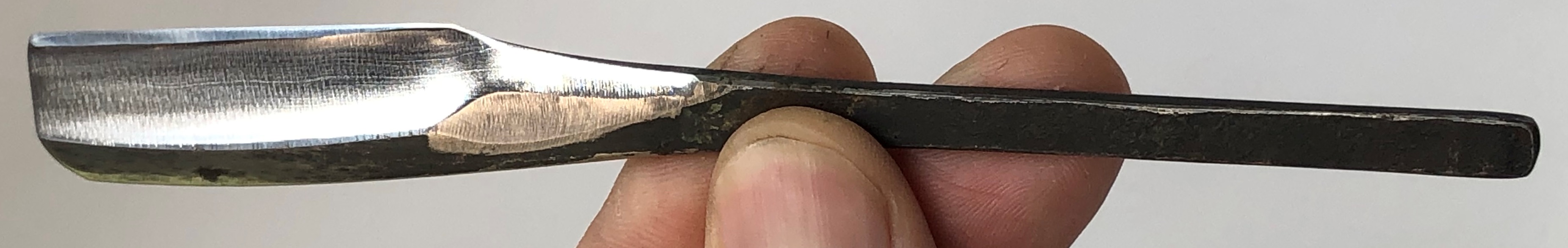 Бритва в хорошем состоянии. Клинок был приведен в порядок:шлифовка и умеренная полировка полотна.Кромка равномерна по всей длине. Оправа от другой бритвы японского происхождения.