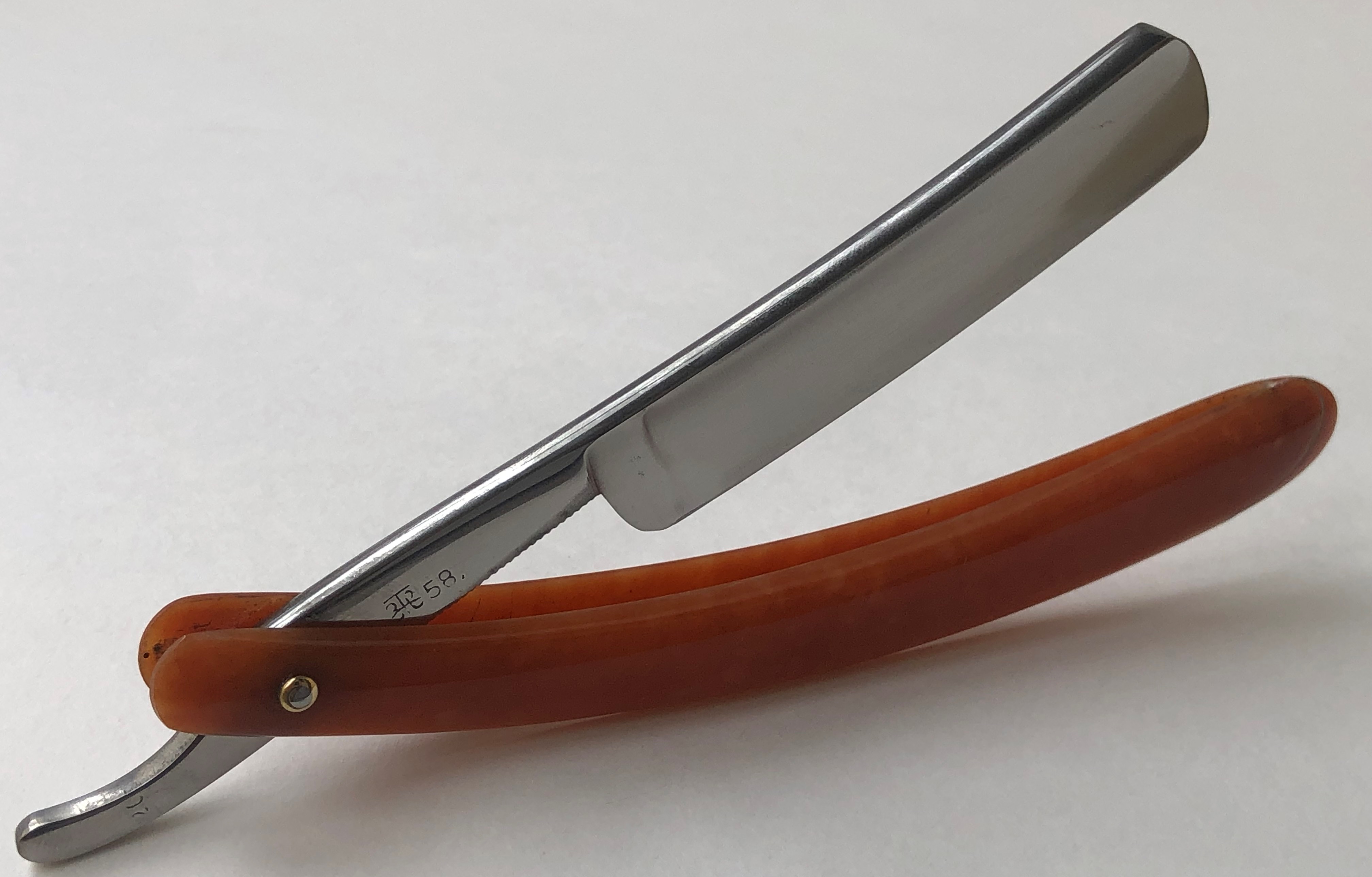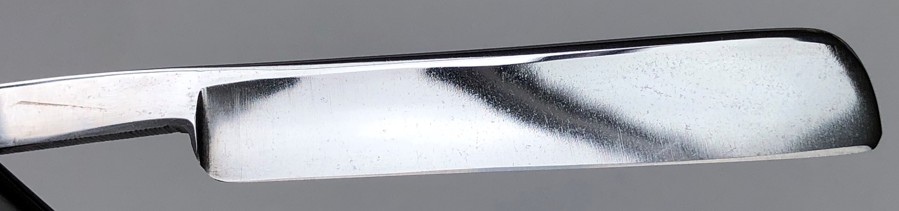 Интересная модель, при котором клинок совершенно никак не проштампован. Были эти бритвы и ранее, именно в таком виде.Ничего тут не разбиралось и не ремонтировалось. Только немного освежил полиролью былой блеск металла. Родные пины.Внизу оправы имеет место быть несколько трещинок,которые никак не повлияют на процесс брития в будущем.Кромочка равномерна по всей длине.Очень хорошая сталь, способна выдавать мягкое и чистое бритьё.