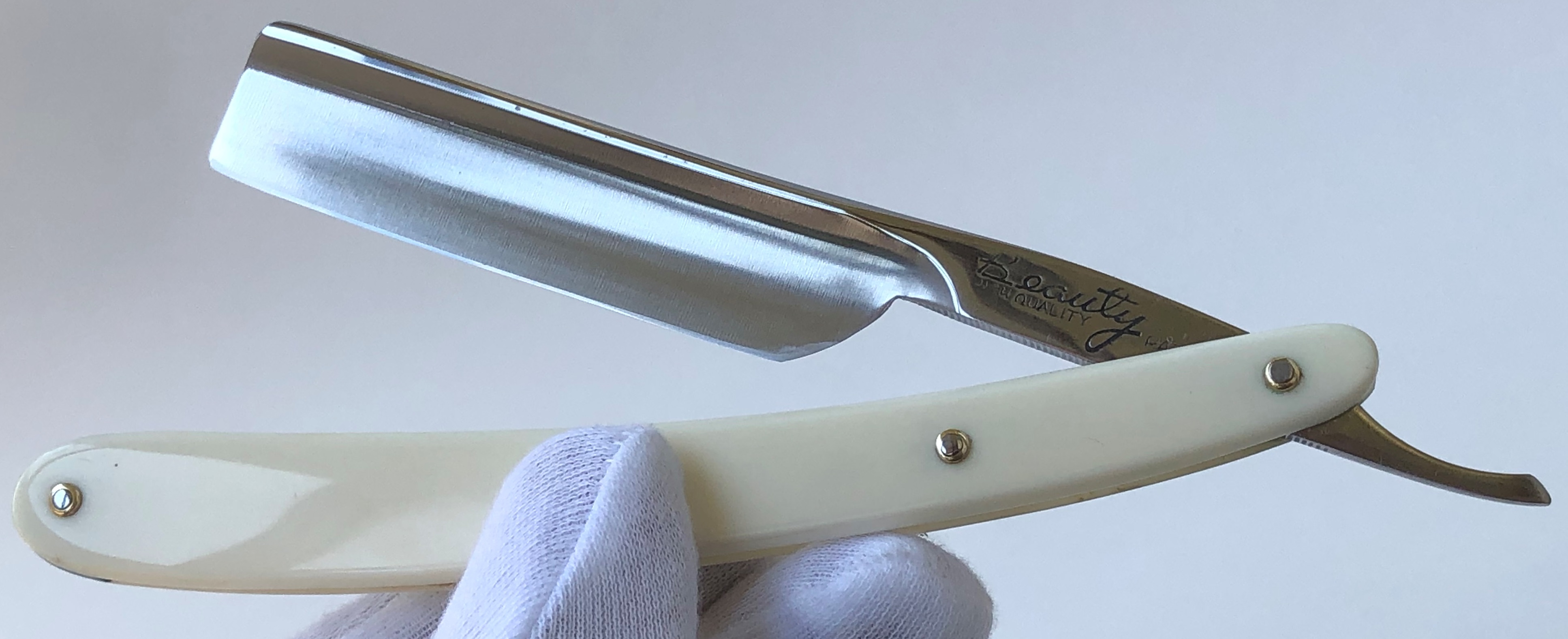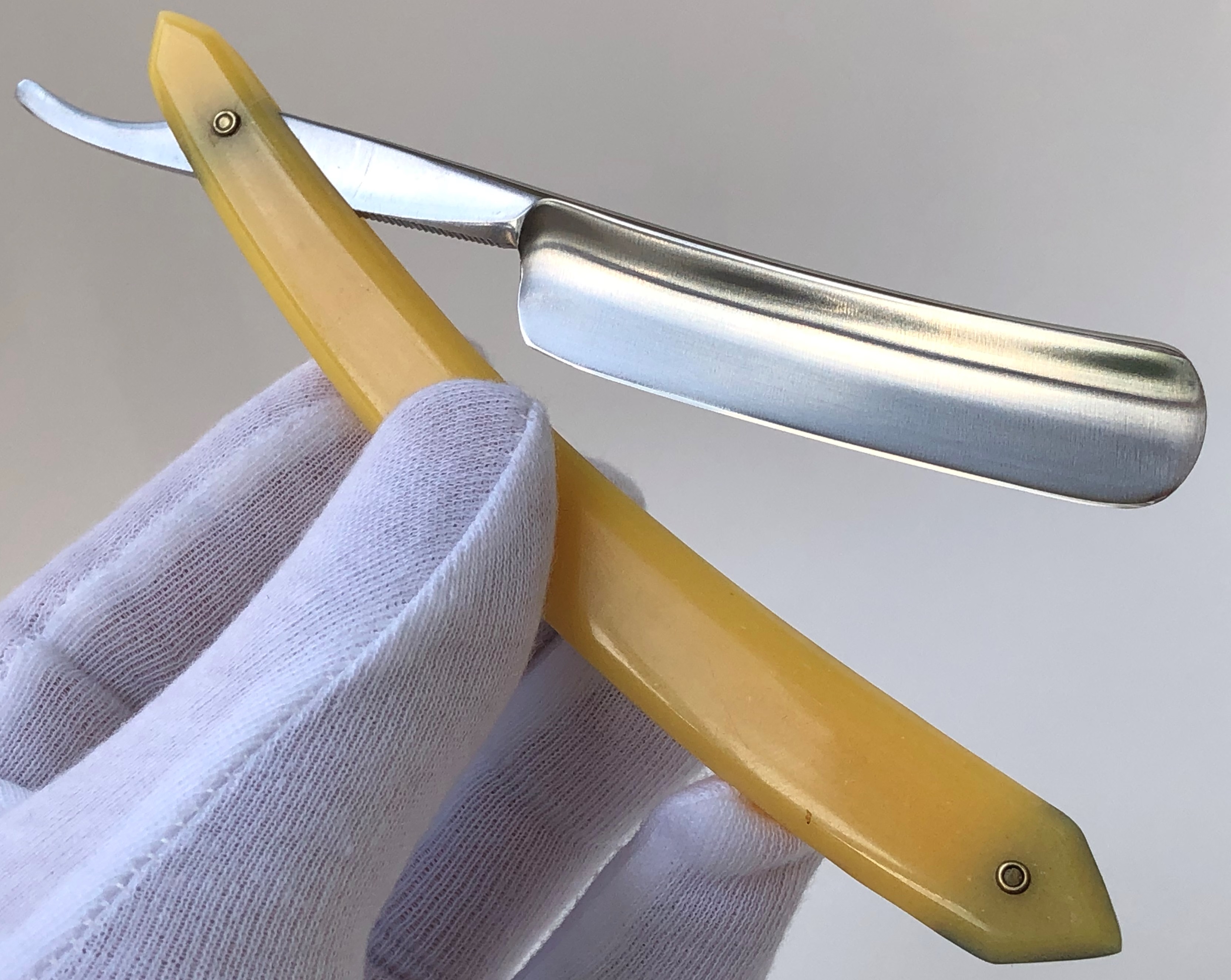 Бритва коллекционного состояния.Ничего не разбиралось и не ремонтировалось.Только оттер от остатков масла с консервации.Заводская шлифовка и полировка.Идеальная геометрия полотна:кромочка равномерна по всей длине.Заводская заточка была переделана под нормальное и комфортное бритье.
