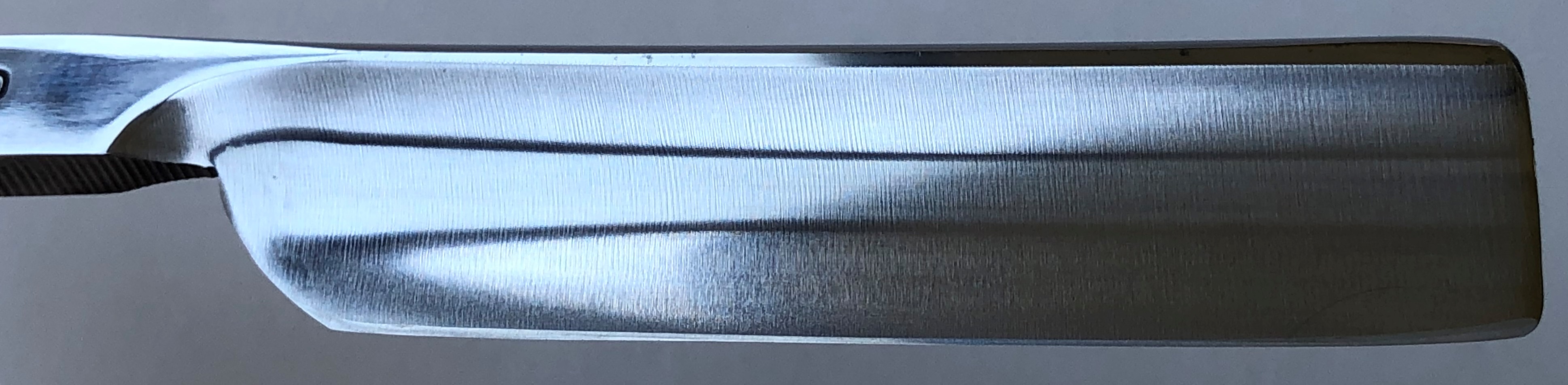 Была разобрана.Следов от заточных камней на обушке не замечено.Никакого регринда!Само полотно изначально было отшлифовано вручную на камнях 600, а далее поперечный механический гринд-800 грит.Получились минимальные и почти незаметные косметические работы, приближенные к заводским.Не устоял и все таки оставил элемент патины на эрле, чтобы придать некий налет старины на этой красоте.Идеальная геометрия клинка:кромочка ровная по всей длине и еле заметна. Родная ручка отполирована, а заводские пины были заново переустановлены.Внутренние шайбы поменял на более толстые, чтобы оправа не терлась от клинок и не оставляла радиальные риски.В общем и целом бритва находится в идеальном и непользованном состоянии.Умеренная полировка.Как известно, данные бритвы калили на достаточно большую величину-63-67 по Роквеллу. Писали, что после заточки бритье получается достаточно агрессивным. Сам ожидал жесткого бритья, но получил шикарное,мягкое и комфортное бритье.Настоящее удовольствие от процесса!