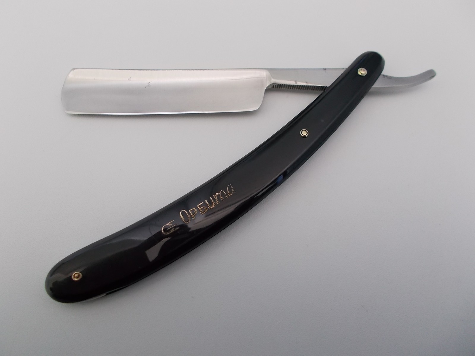 Продам опасную бритву Завода Стальных Изделий "Орбита" 1970-е. Бритва после реставрации, в очень хорошем состоянии. Ширина полотна - заводские 5/8 (15,8 мм), оптимальный размер. Красивая трехосевая рукоять, насечки на эрле. Бритва разбиралась, прошла легкую очистку. Остались небольшие следы времени в виде неглубоких каверн на полотне. После сборки клинок в оправе сидит плотно, по-центру, не болтается. Установлены осевые шайбы. Заточена, готова к бритью. Почта по России входит в стоимость.