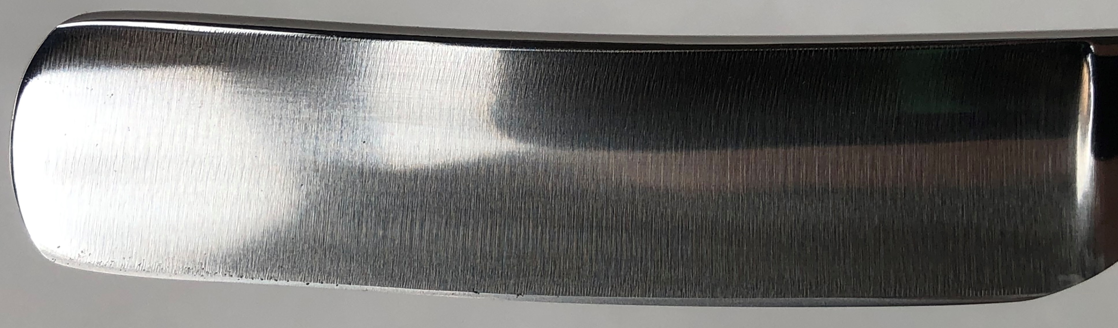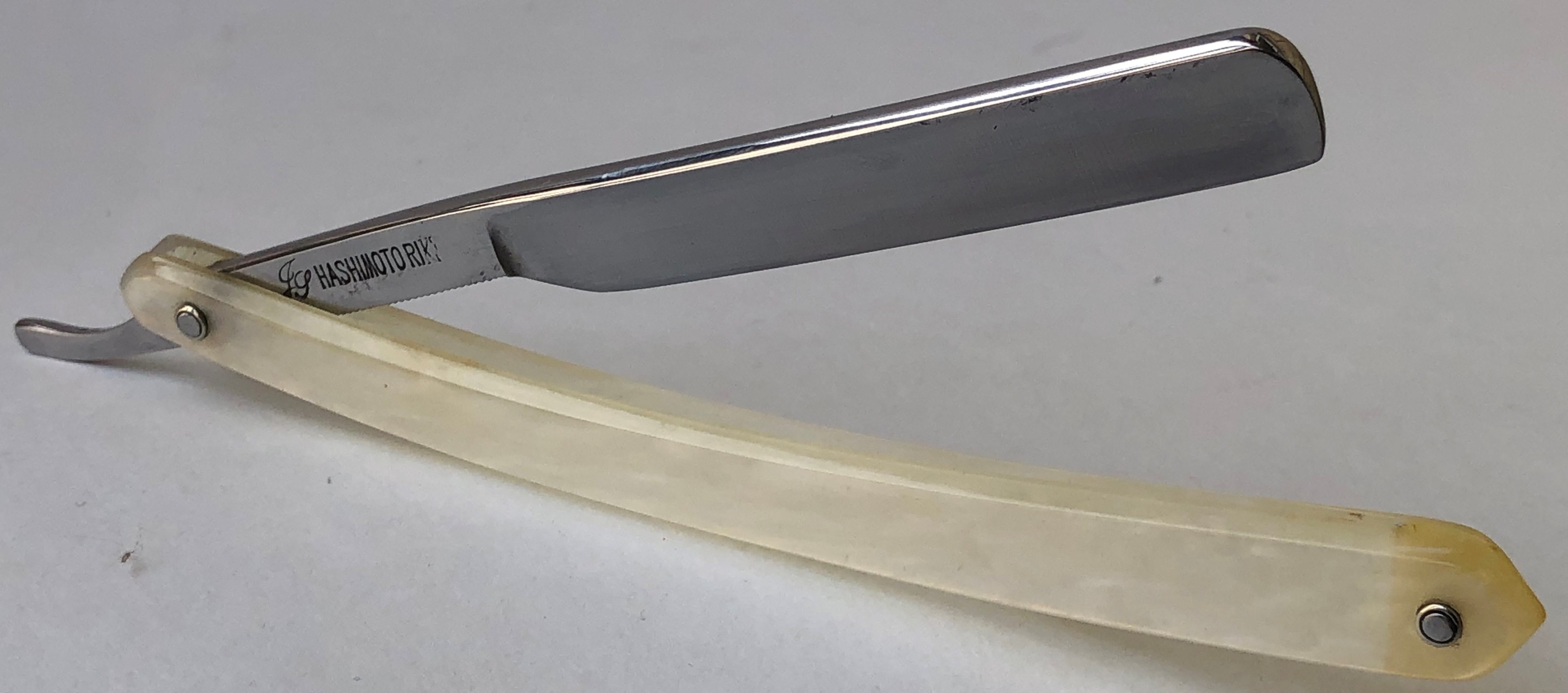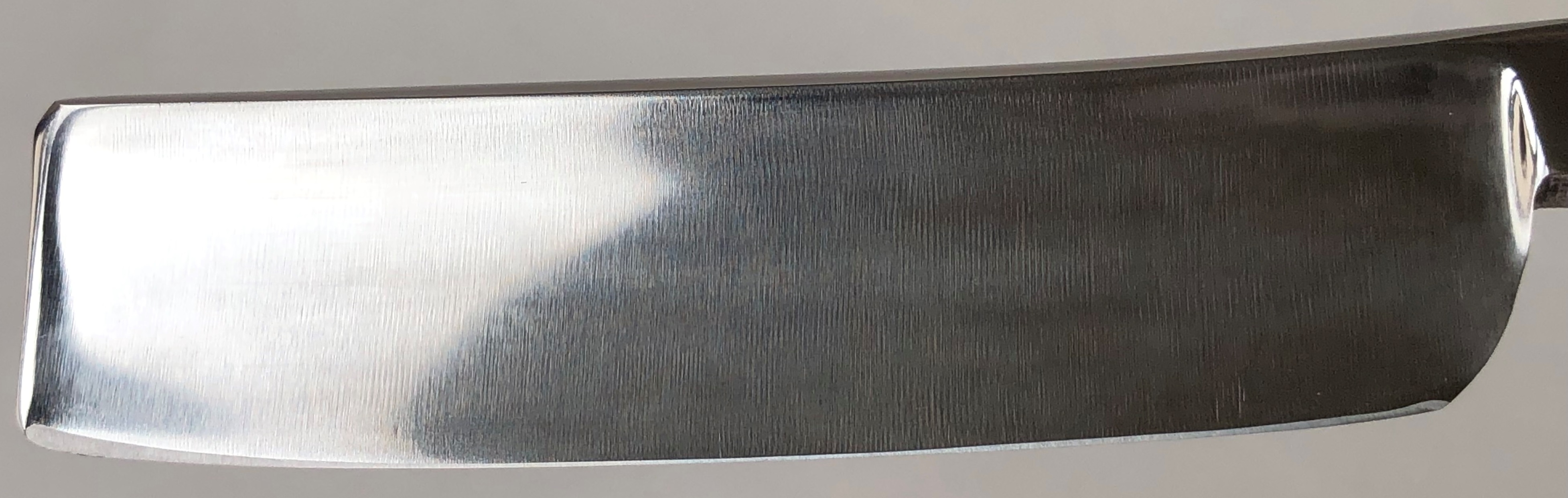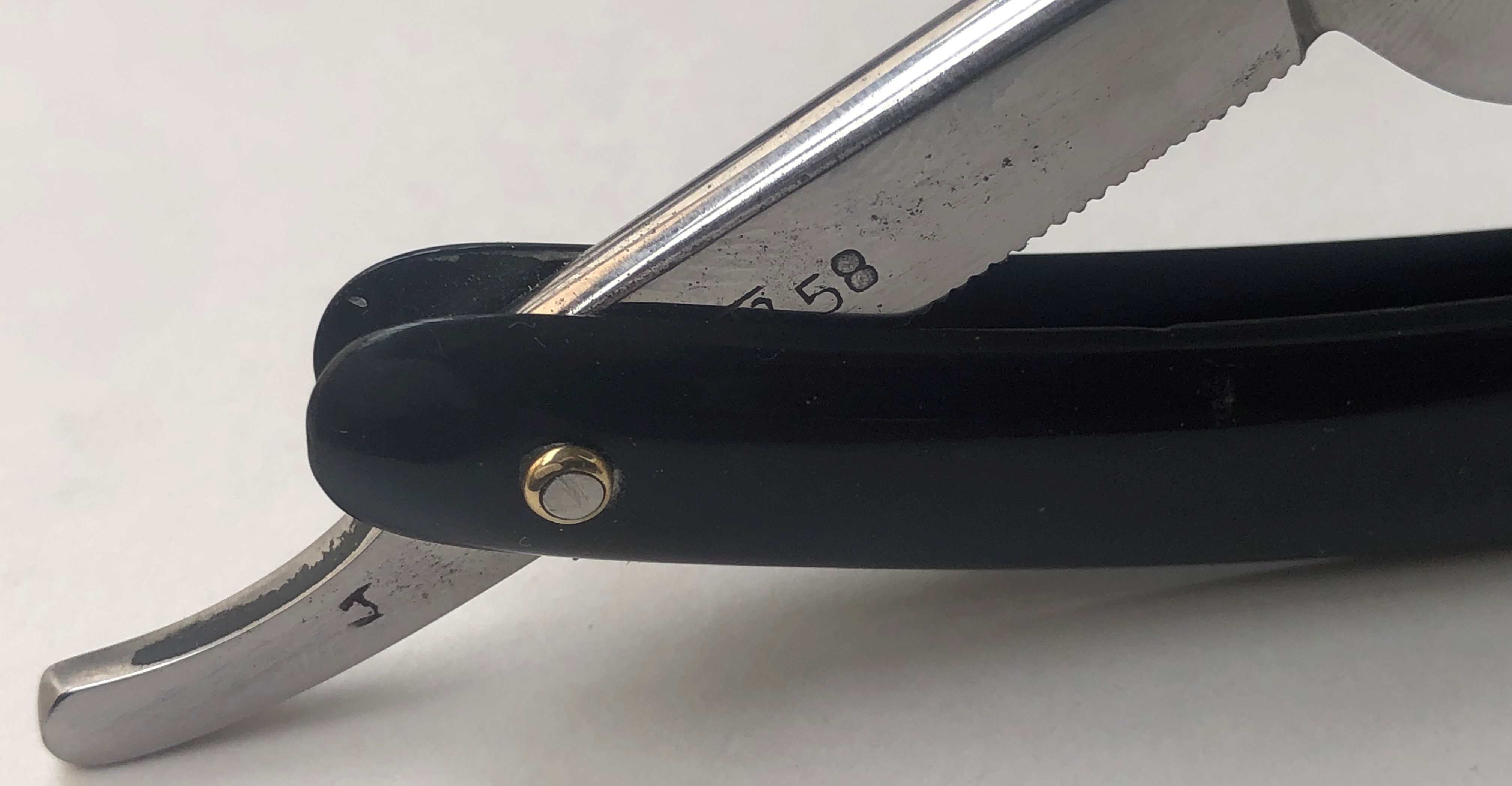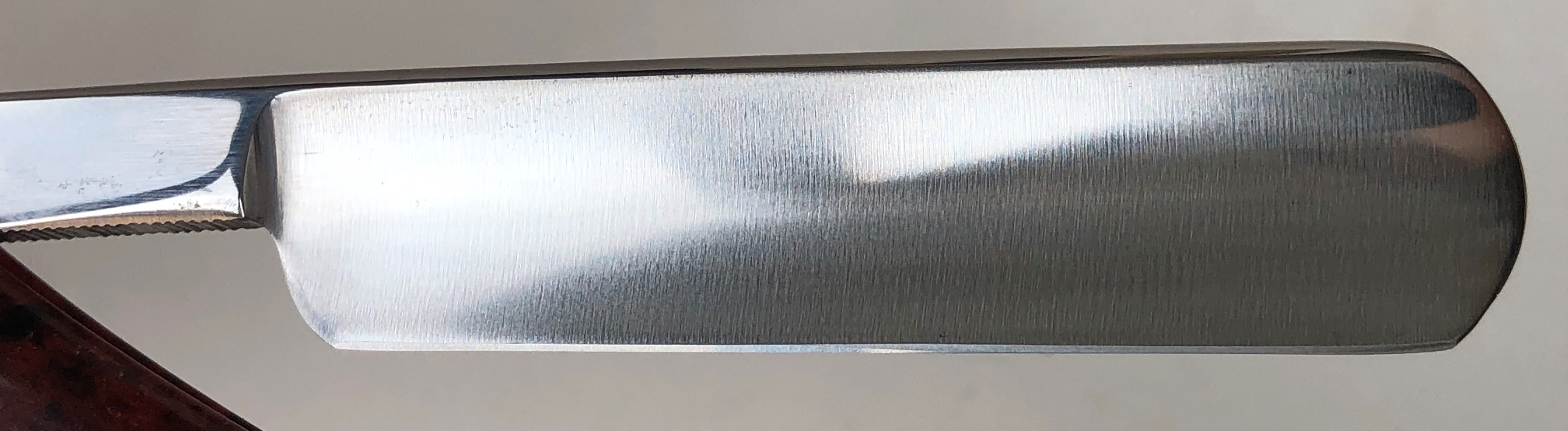 Бритва в пользовании не была, но требовала минимальных, косметических работ.Была разобрана-собрана,с освежением клинка до былого блеска и добавлением внутренних шайб.Попробовал повторить "заводской" гринд полотна.Кромочка равномерна по всей длине.