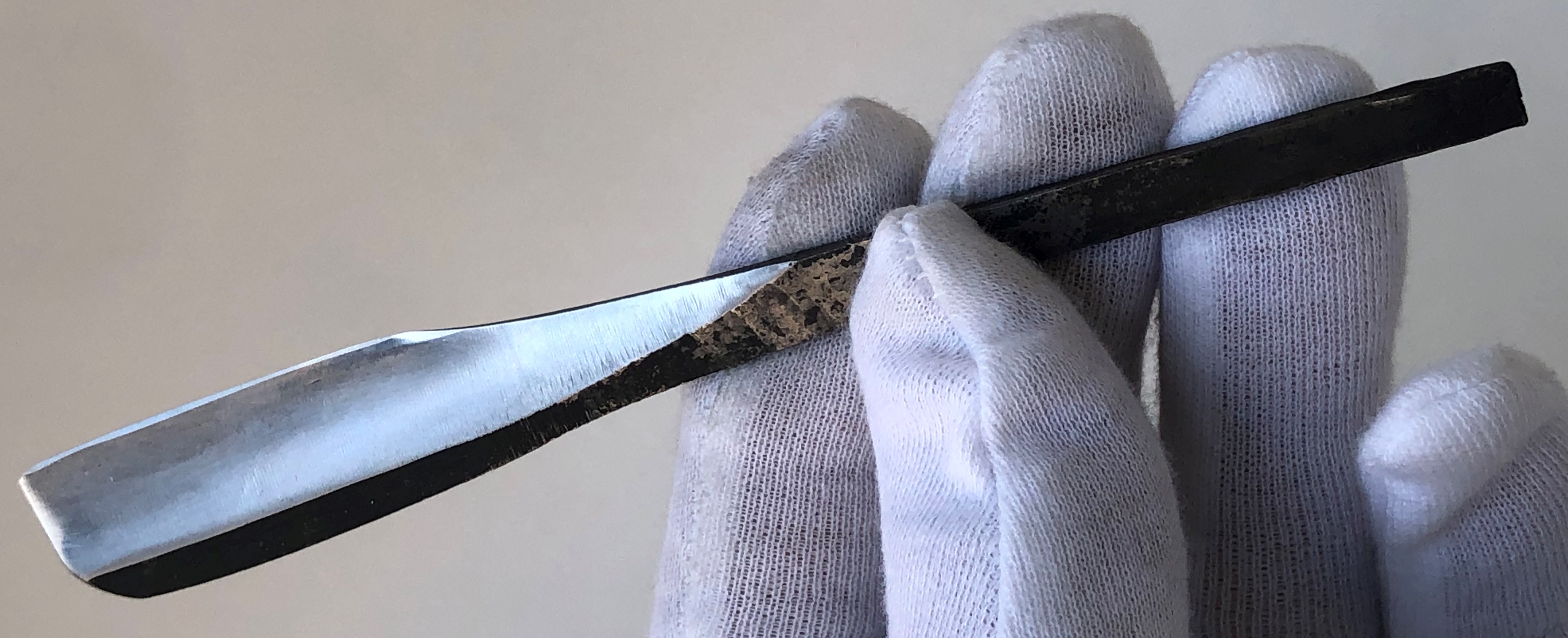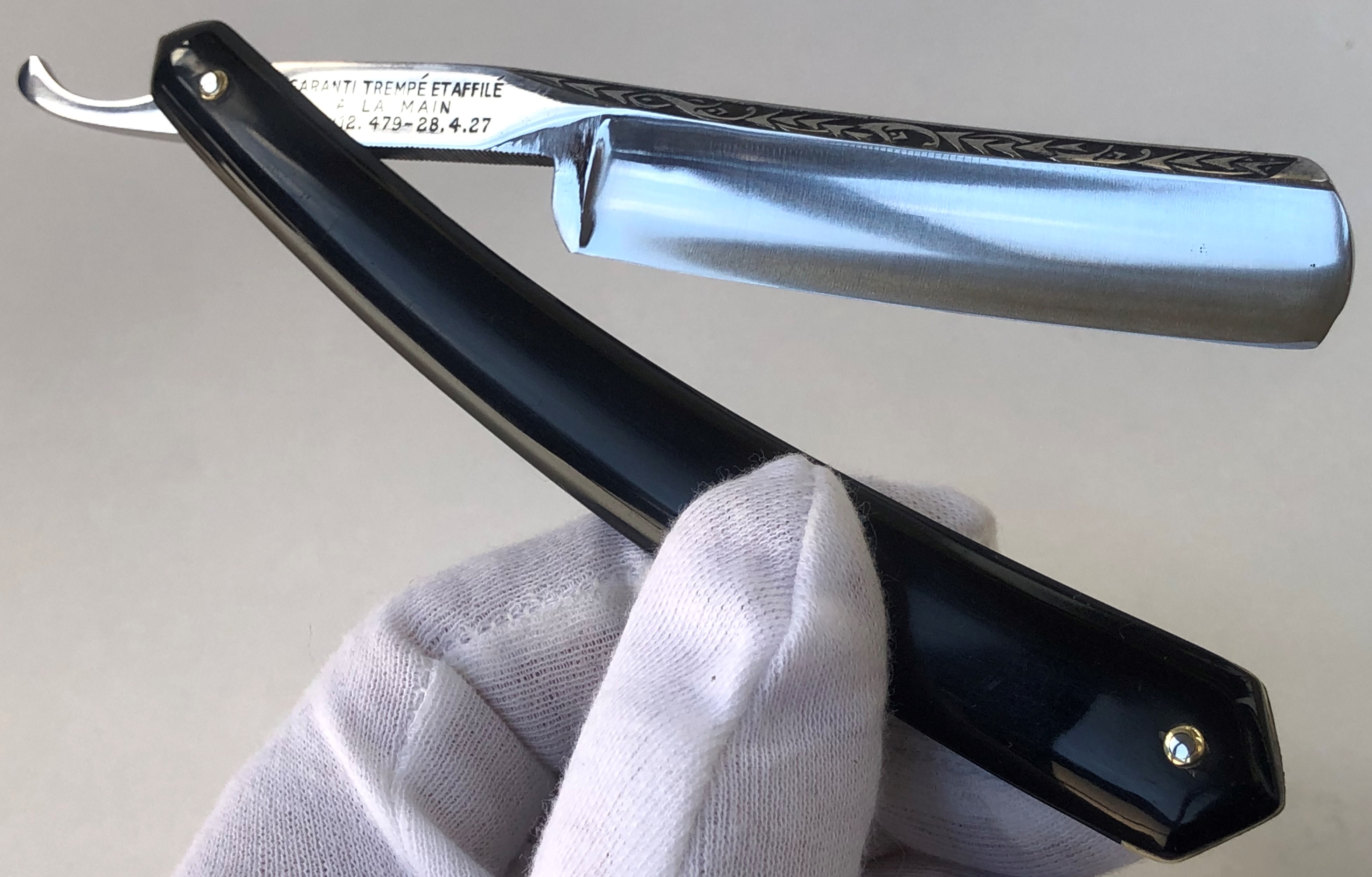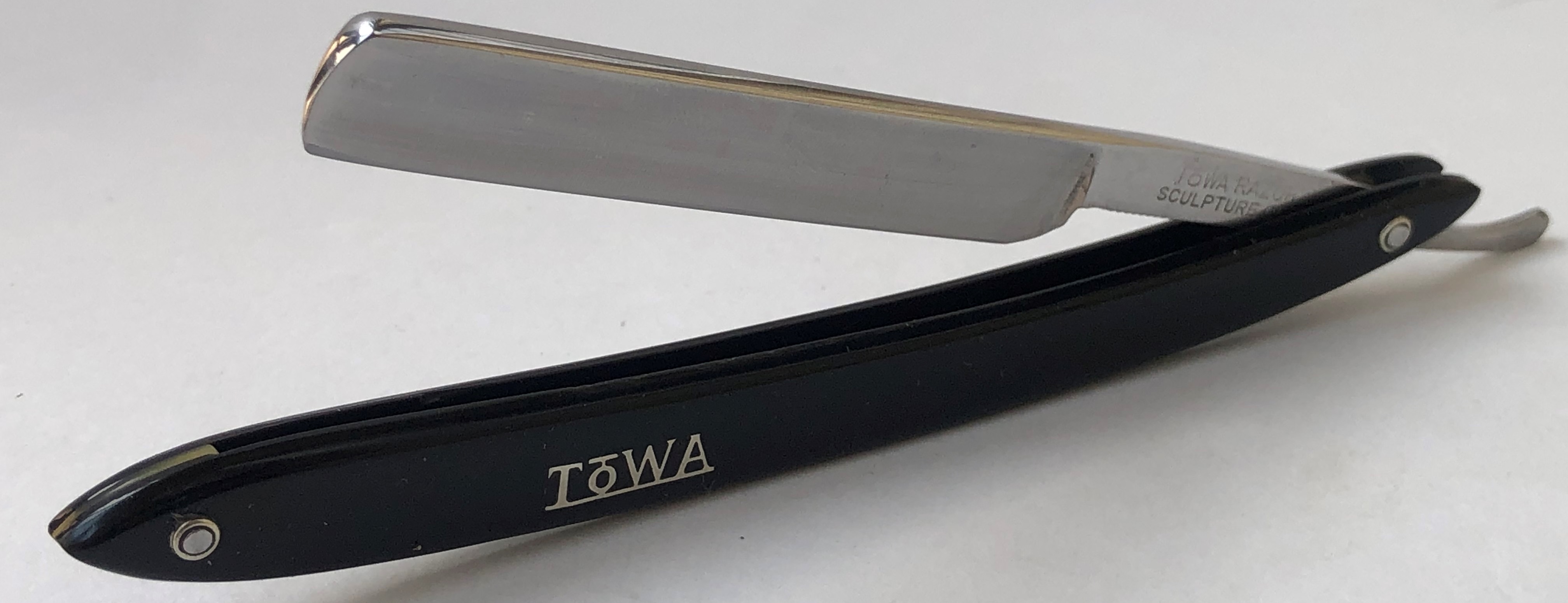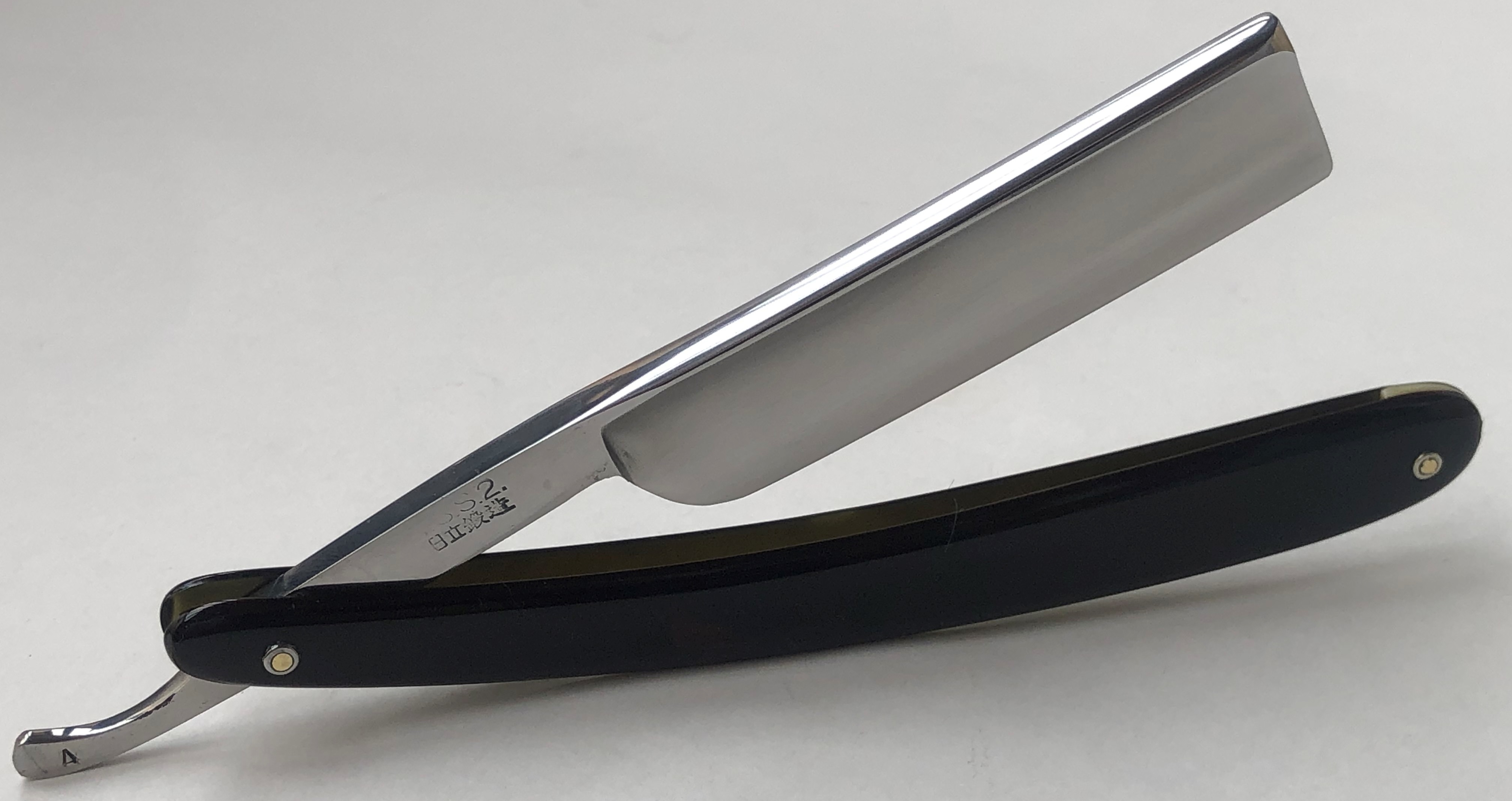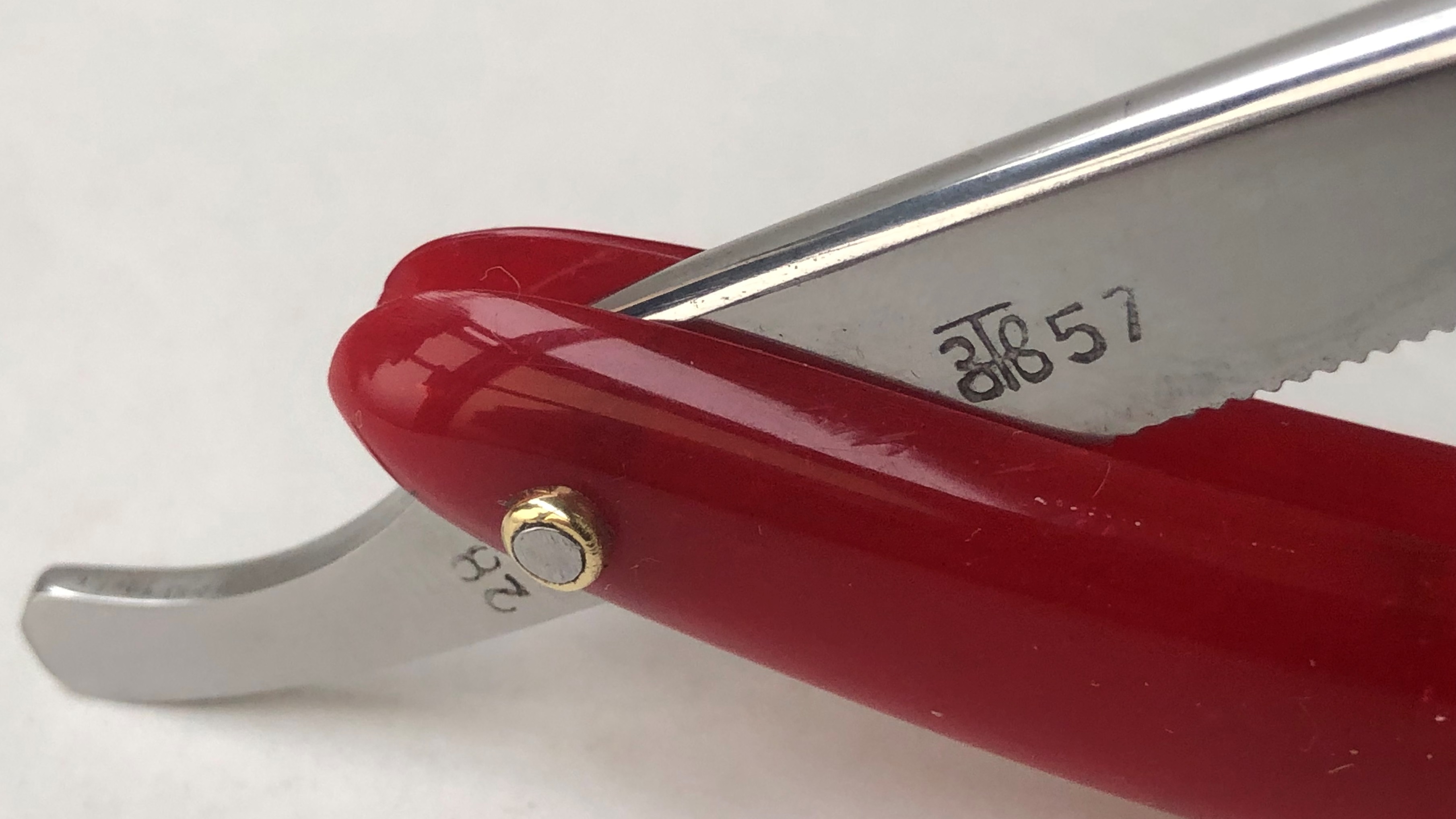 Бритва в пользовании не была, но требовала минимальных, косметических работ.Была разобрана-собрана,с освежением клинка до былого блеска и добавлением внутренних шайб.Попробовал повторить "заводской" гринд полотна.Кромочка равномерна по всей длине.