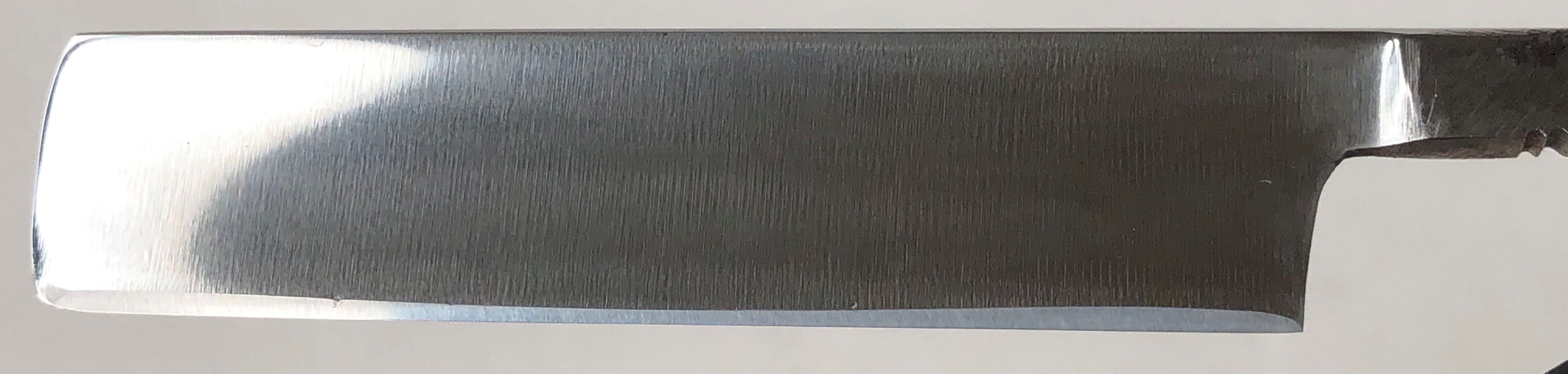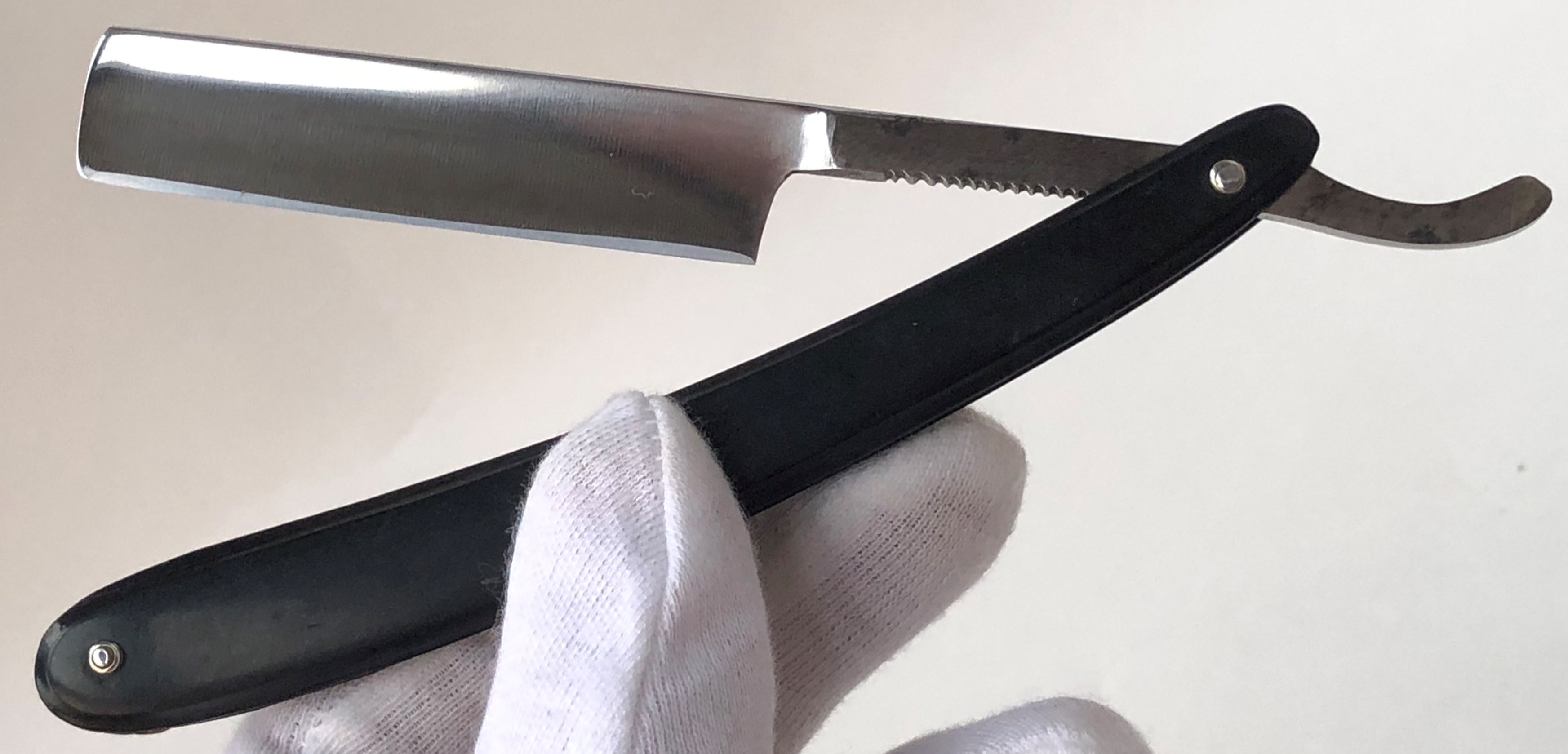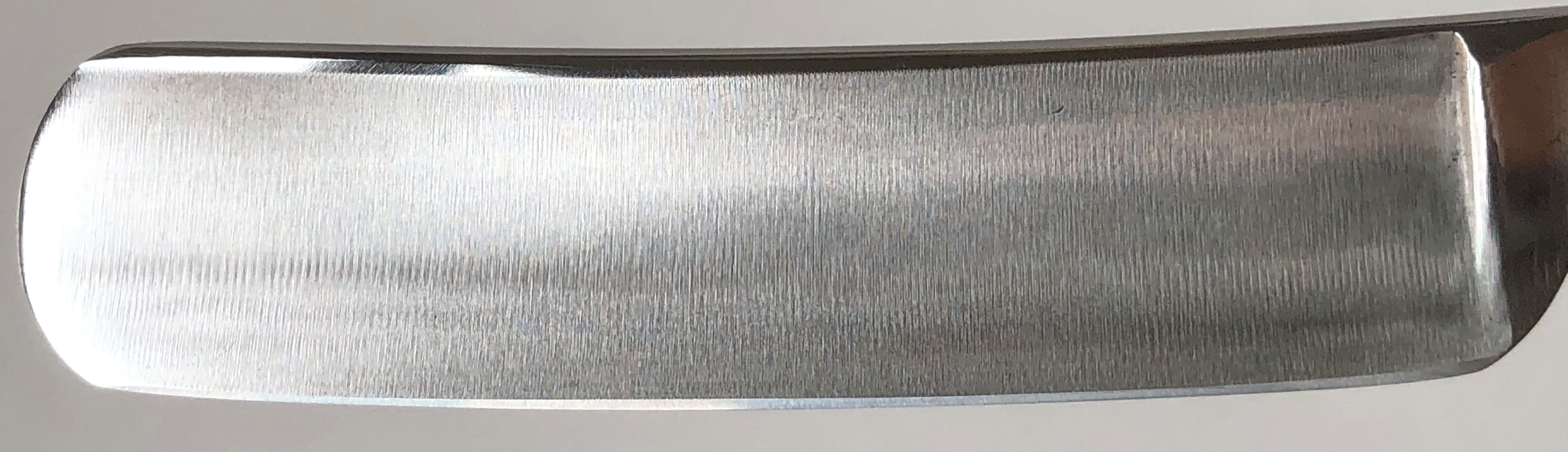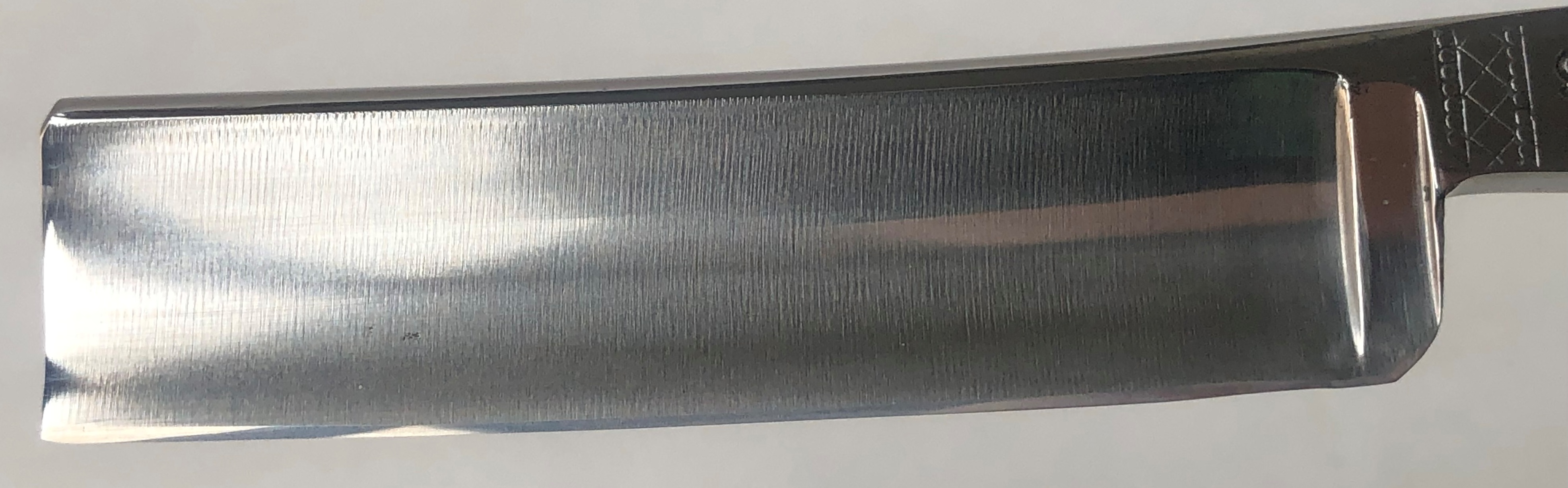 Бритва имеет 6,5 мм толстенный обушок.На таких японках обычно еще писали по западной традиции:-«for barbers use”. Либо разные вариации.Имеется ввиду,что за счет толстого обушка есть возможность бриться,не выставляя угол атаки ,а ставить ее плашмя,как по идее пользуются барберы. Также фирма Кикубоши ориентировалась на производстве именно профессионального парикмахерского инструмента. У меня имеются старинные японские каталоги для парикмахеров ,с рекламой Кикубоши .Поэтому и бритву подобную можно назвать профессиональной .