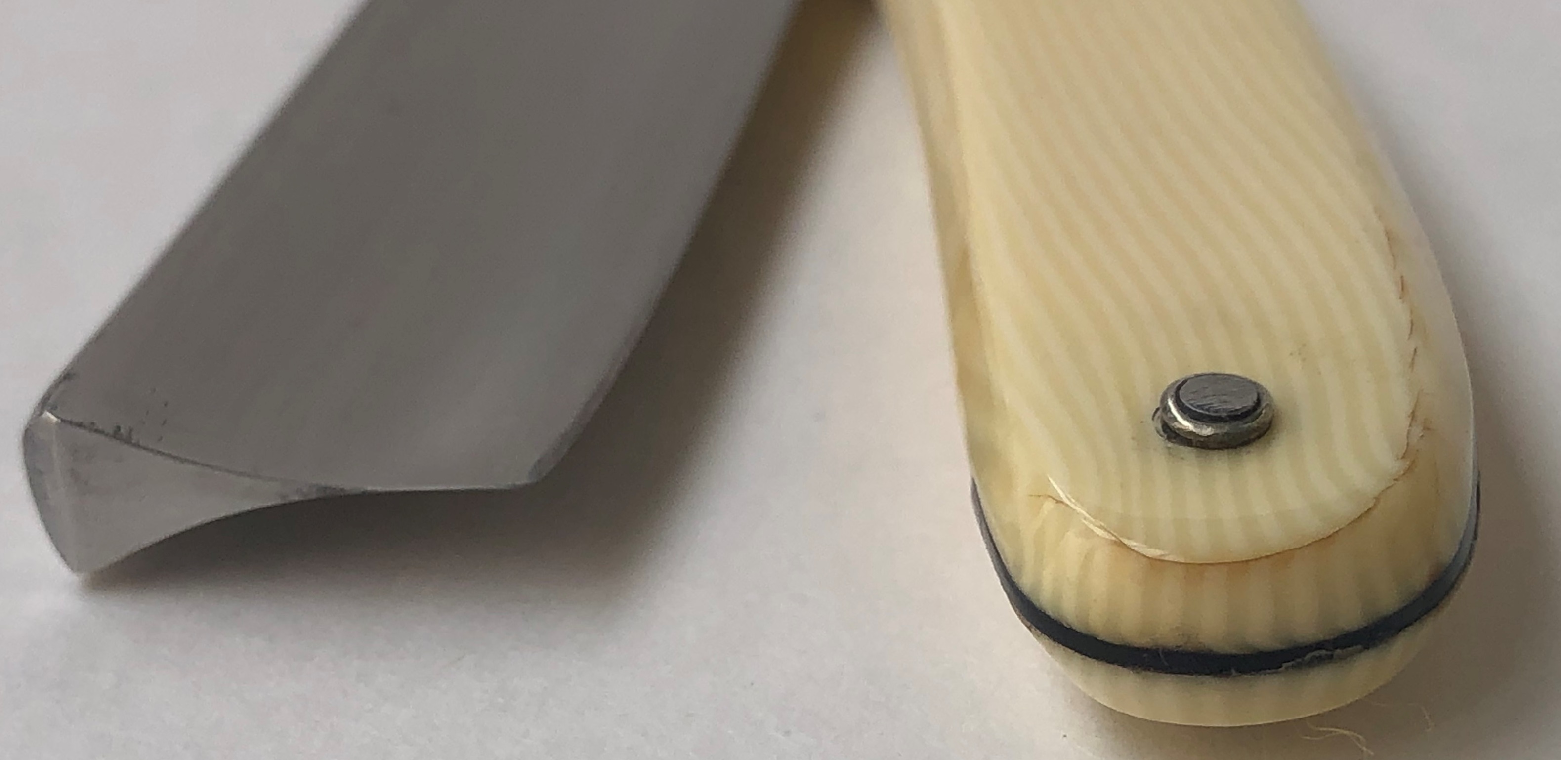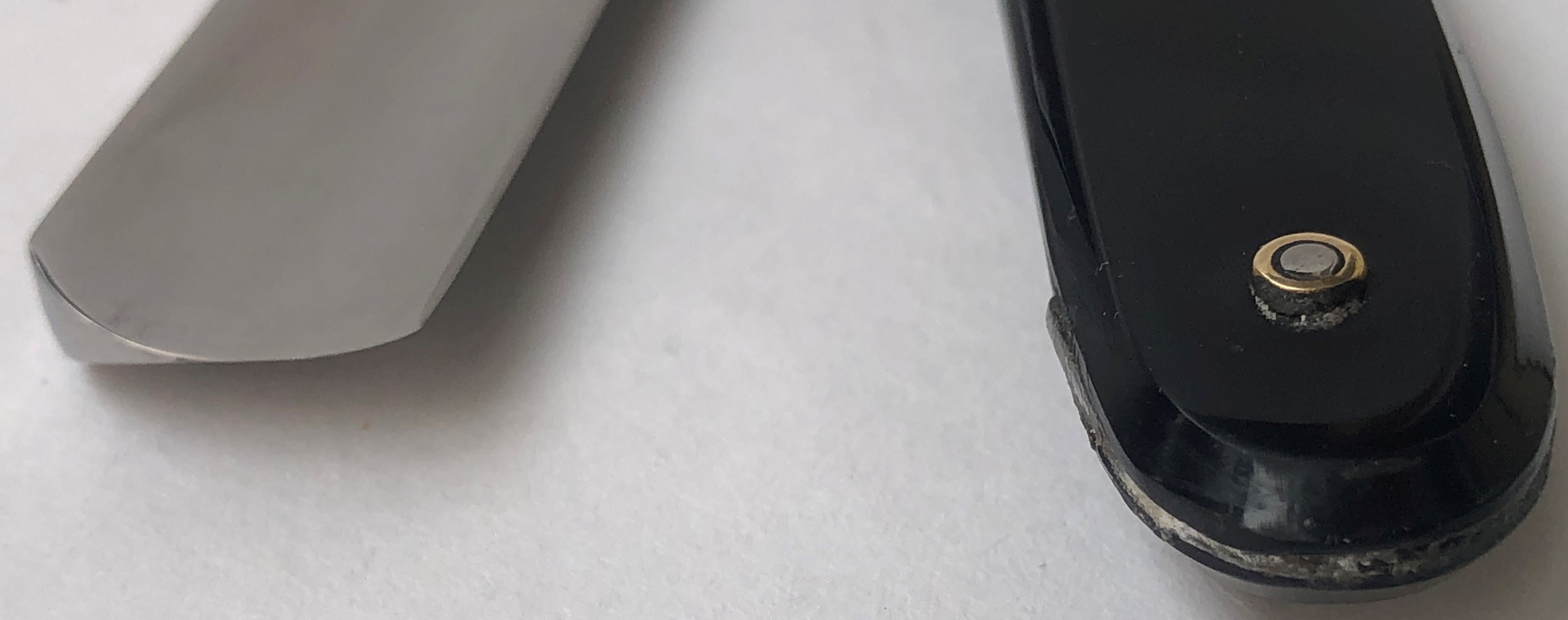 Бритва находится в очень хорошем состоянии, без активных следов пользования. Была разобрана,для минимальной чистки и полировки. Немного старинной патины оставил в районе эрля,для придания естественного вида бритве такого возраста.Добавил внутренние шайбы, а пины заменил на более практичные двух-цветные втулки. Идеальная геометрия полотна:кромочка равномерна по всей длине и еле заметна.Коробочка не от этой модели.