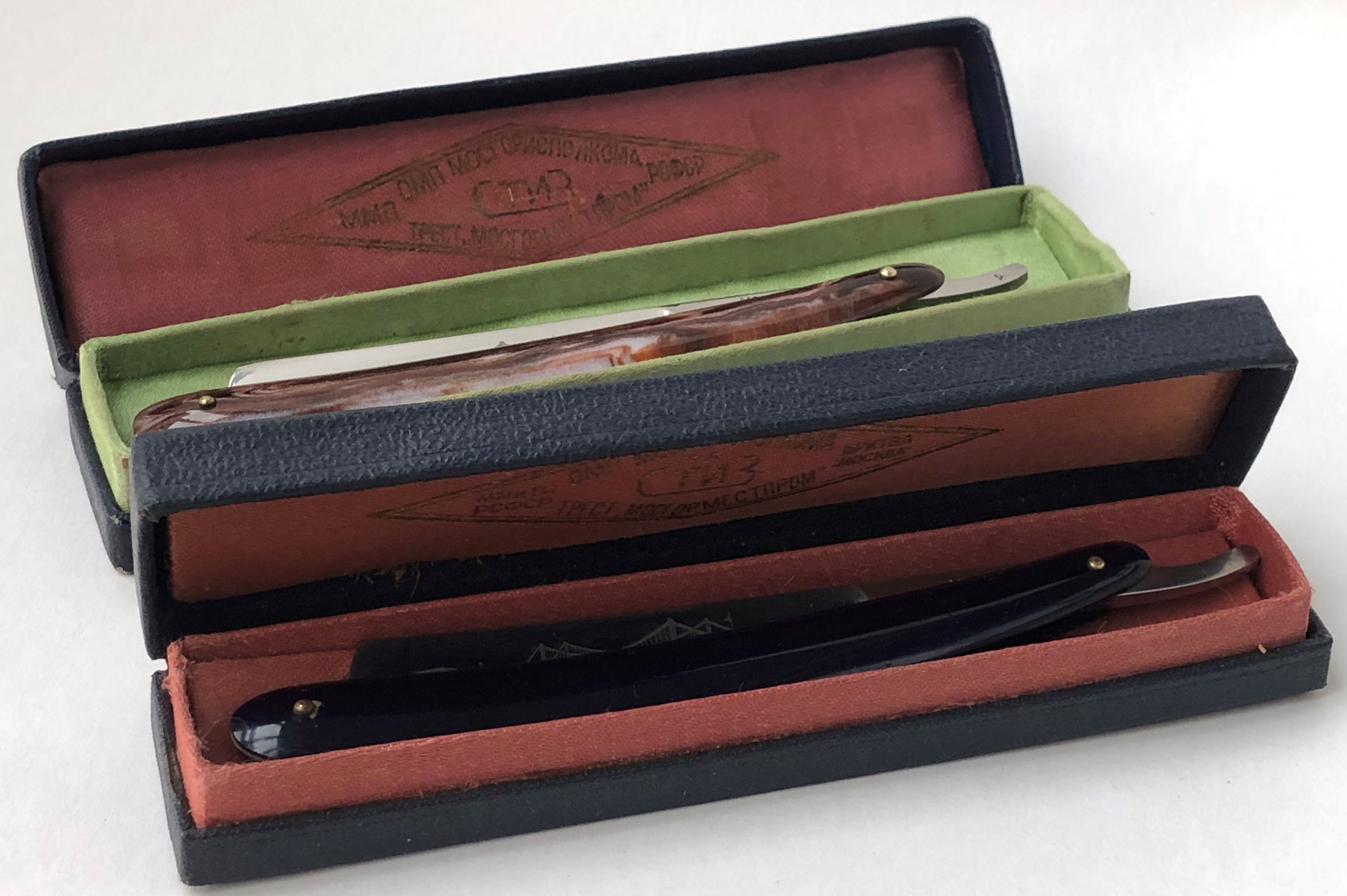 Бритвы совершенно нетронутые и заточены впервые. Ничего не разбиралось и не ремонтировалось. В своё время были оттёрты от остатков масла с консервации.На бритве 1951 года имеется след от электро-химической заводской заточки.Бритвы, как будто вчера с завода.Сталь чистая, без видимых дефектов. Идеальная геометрия полотен:кромочки равномерны по всей длине.Родные коробочки также, в очень хорошем состоянии.
