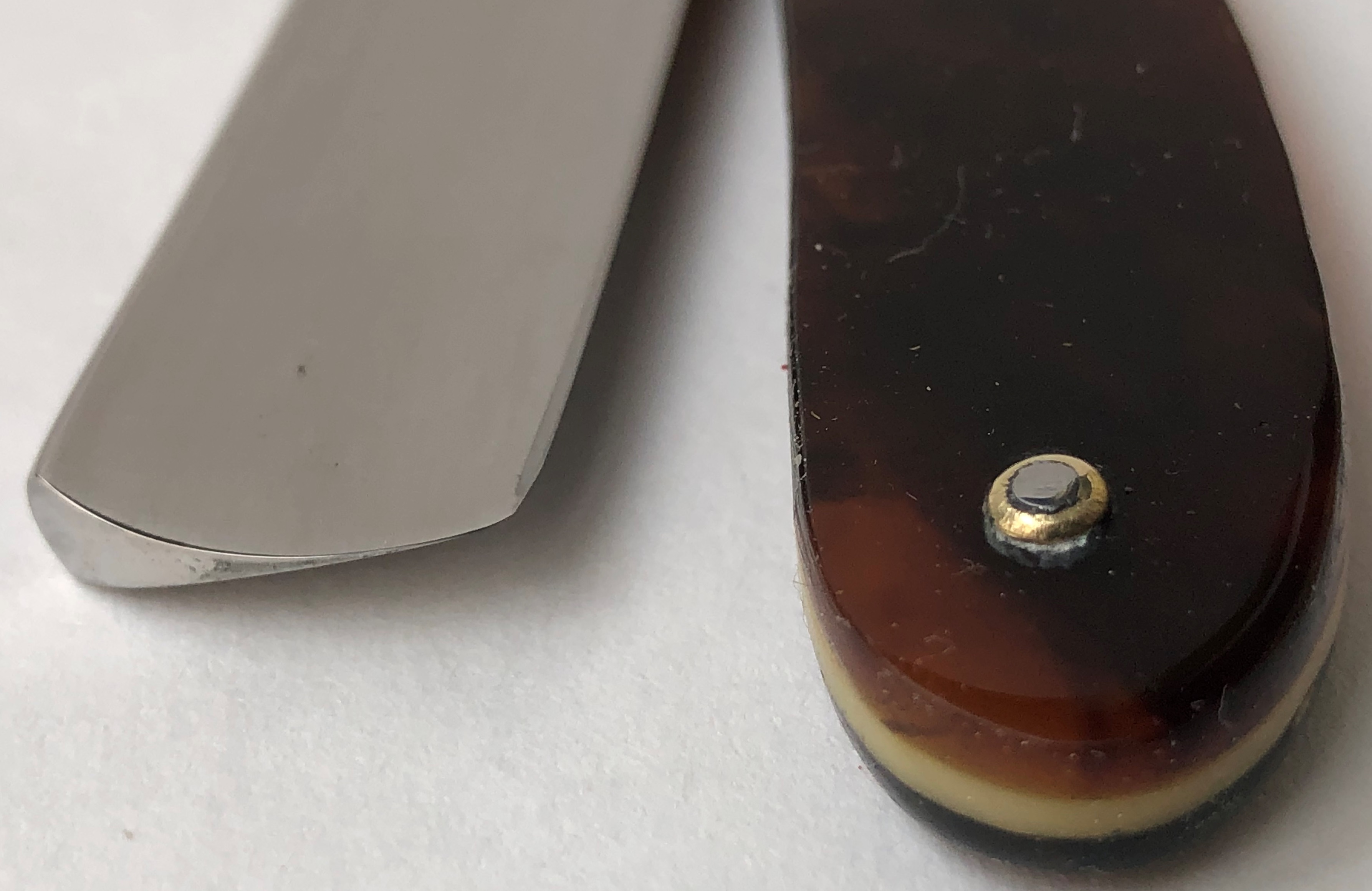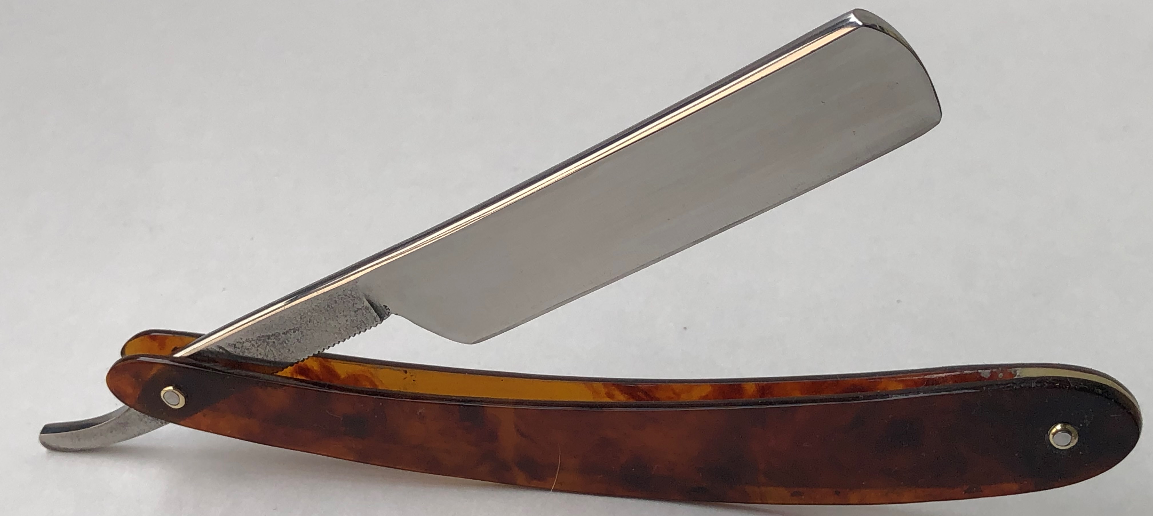 Не часто встречающаяся бритва, особенно в таком,близком к идеальному состоянию. Без следов пользования и с большой долей вероятности в пользовании не была. Разобрал, для удаления патины и окисления в районе осевого пина. Эффектную патину на эрле оставил, для красоты и придания бритве естественного старинного вида.Заодно поставил внутренние шайбы, для улучшения осевого механизма.Идеальная геометрия полотна:кромочка равномерна по всей длине. Красивая родная оправа "под черепаху".Бритва заточена и готова к бритью.