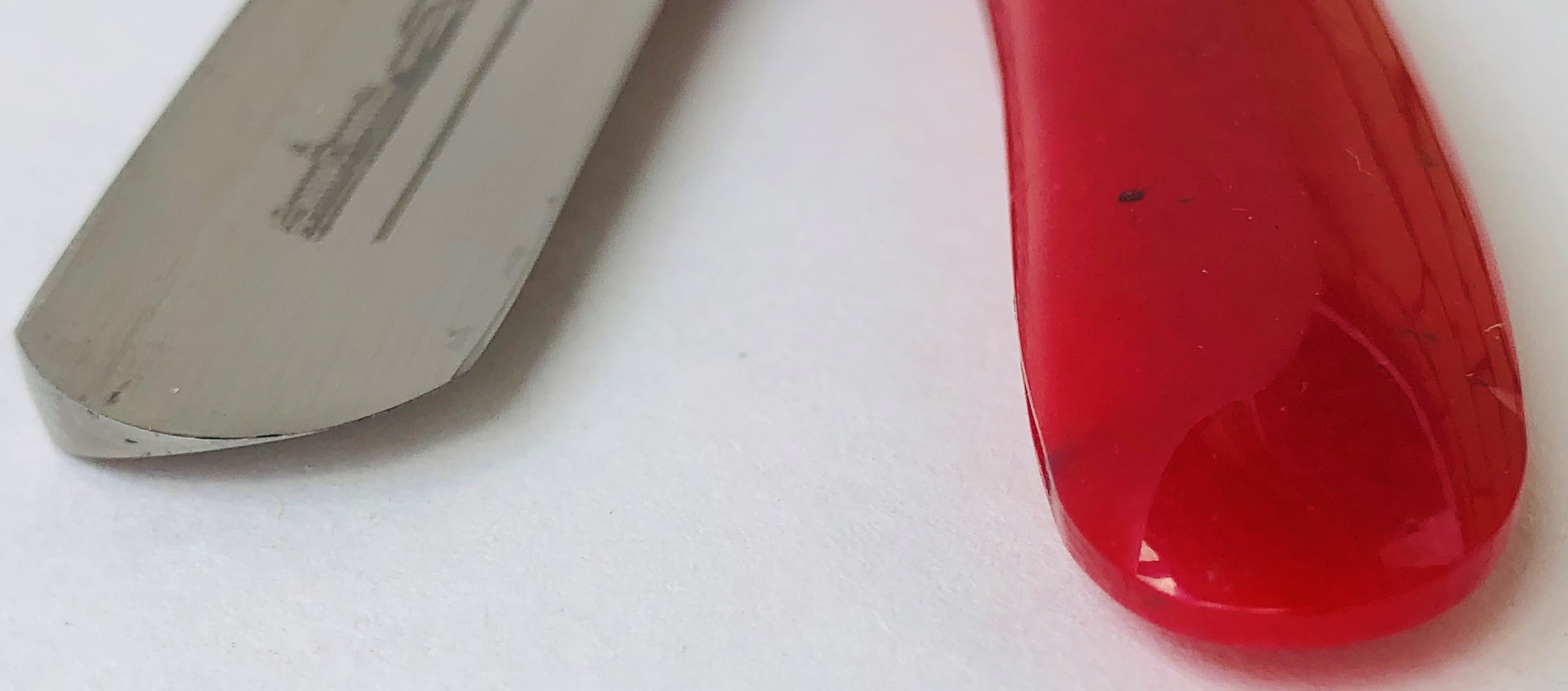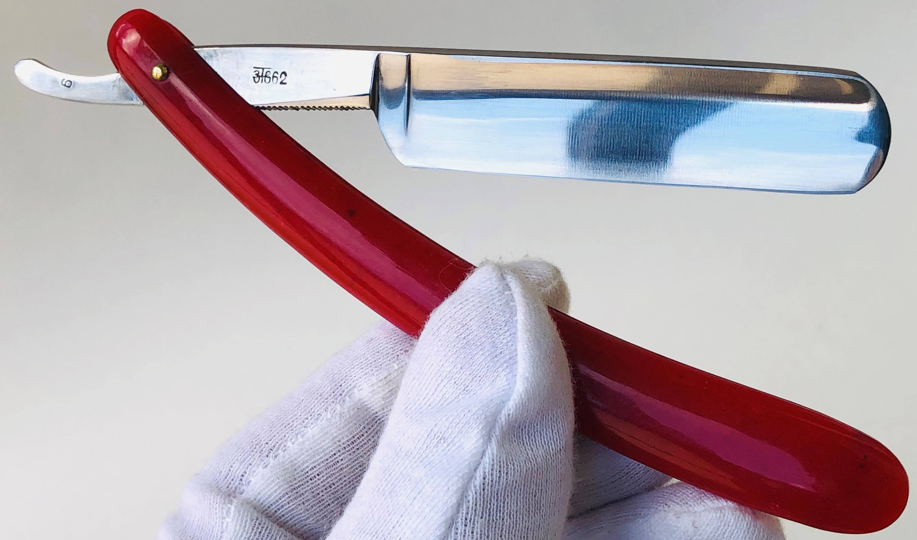 Бритва в пользовании не была. Была заточена впервые. Ничего не разбиралось и не ремонтировалось. Все в оригинальном виде.Идеальная геометрия полотна:кромочка равномерна по всей длине и еле заметна.Нетронутая позолота на травлении. Высококачественная "звонкая" углеродистая сталь.