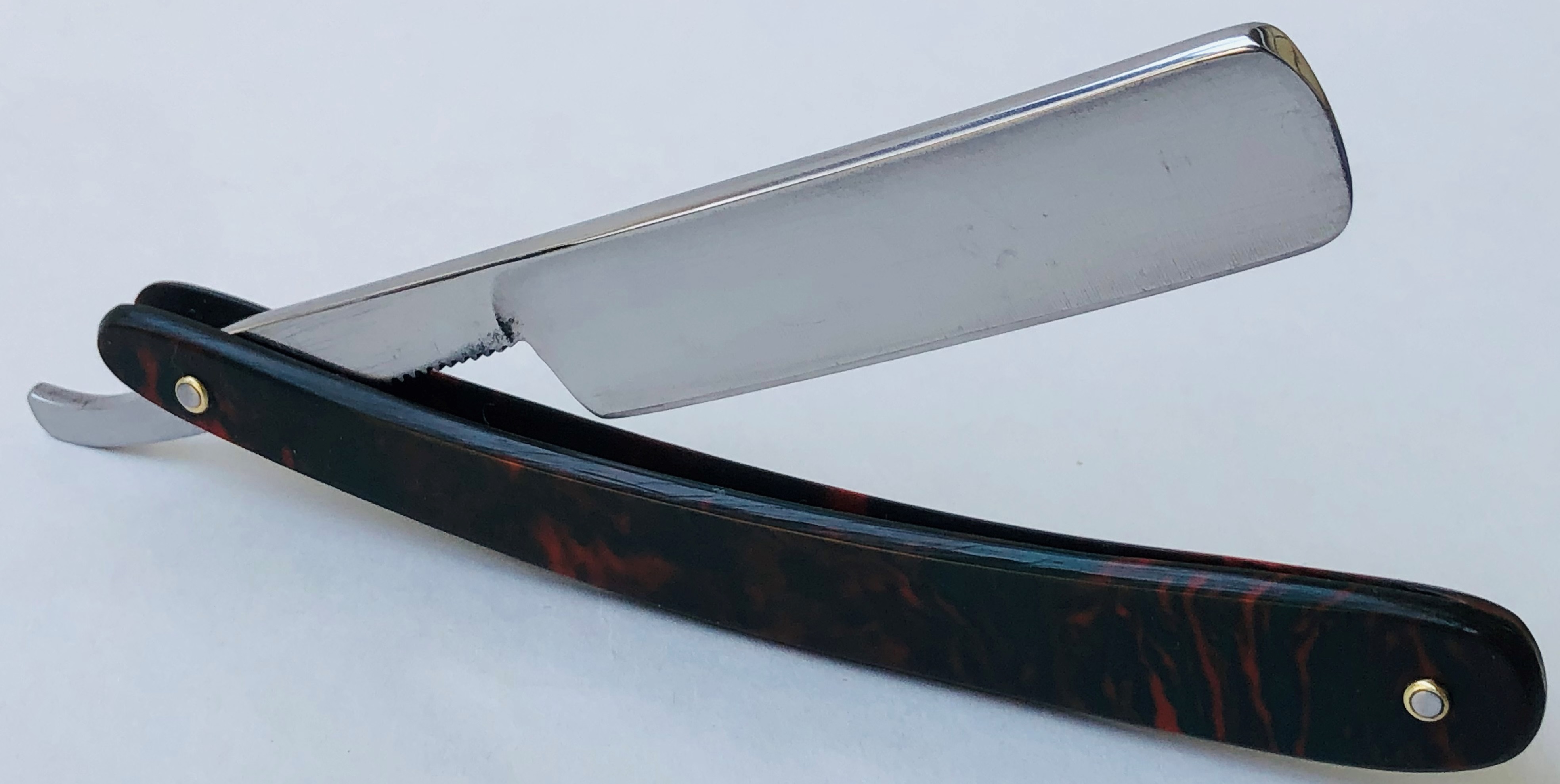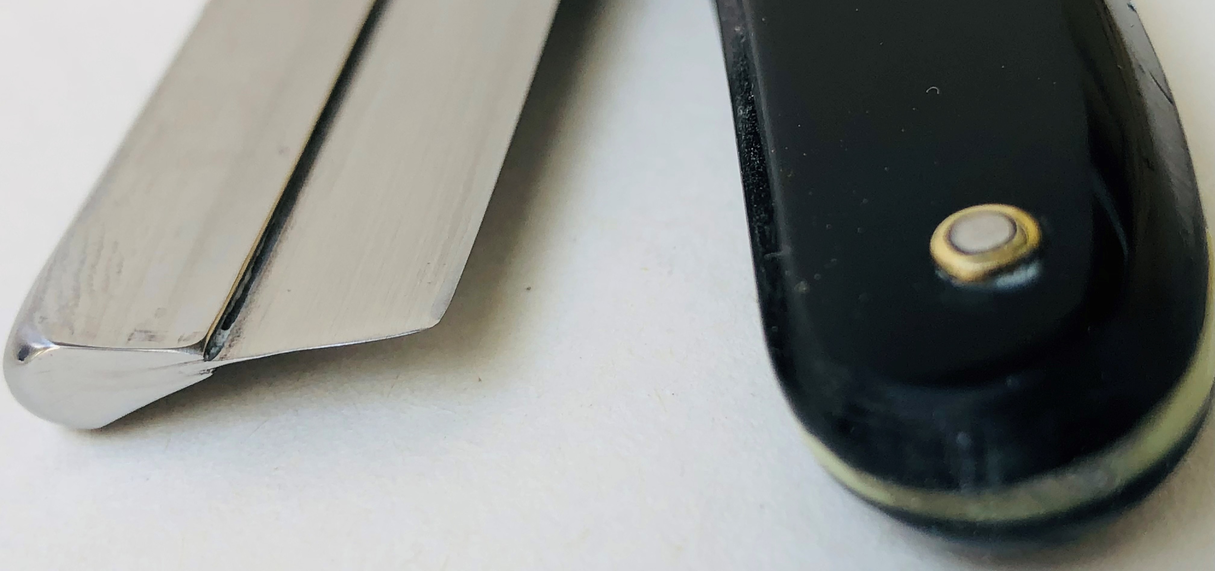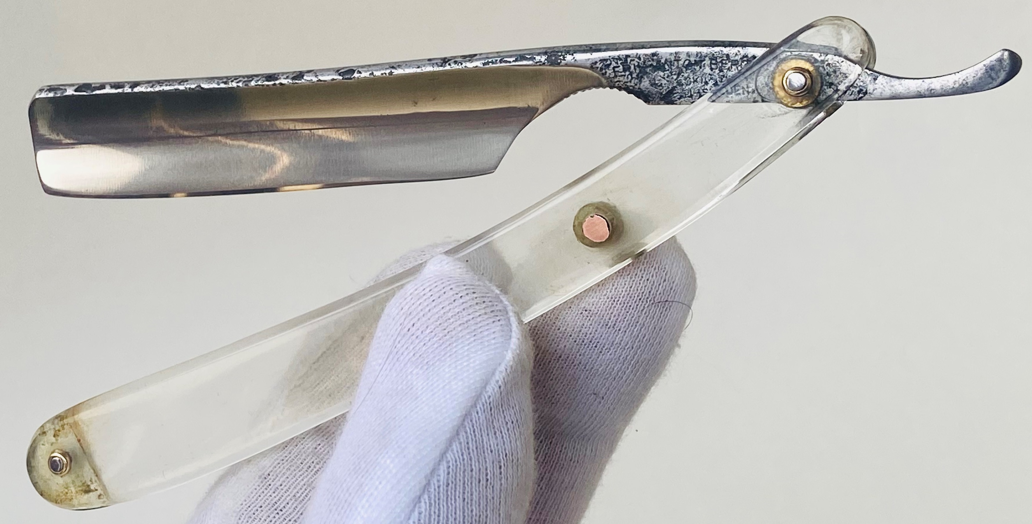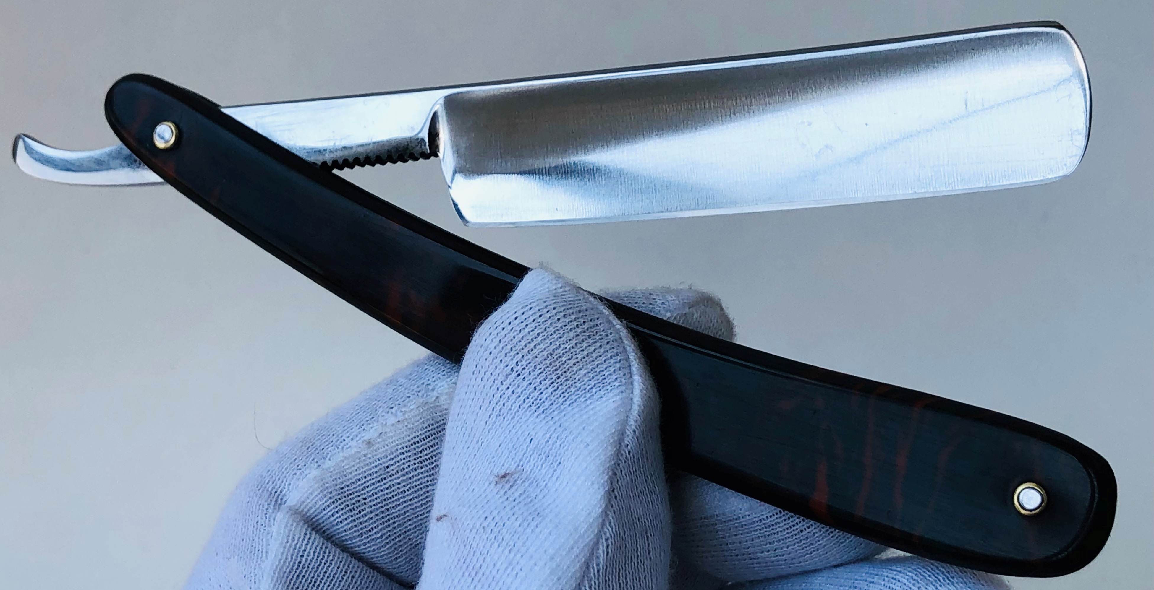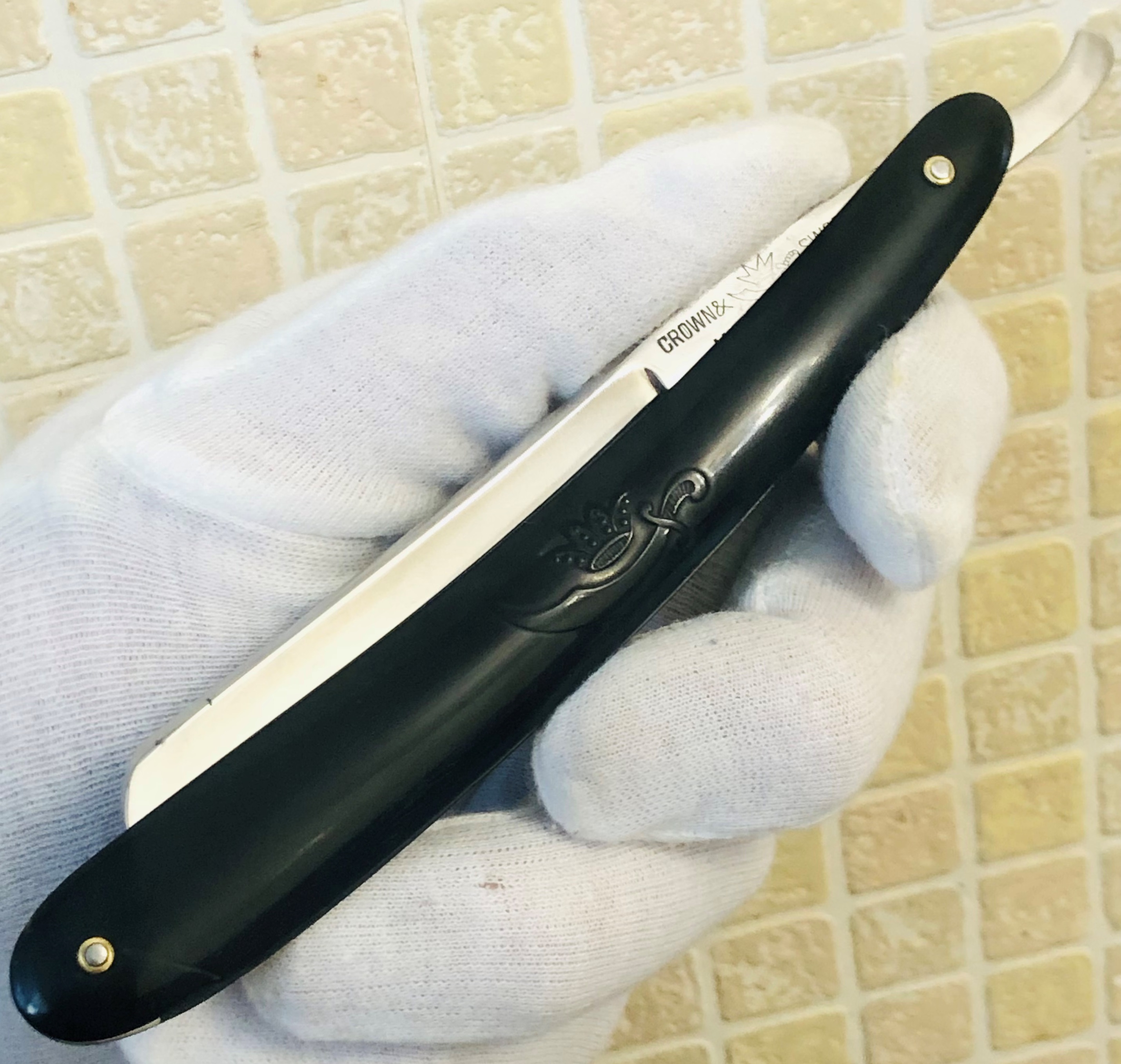 Был у меня старенький клинок,до которого не доходили руки. Древняя бритва, с достаточно значительными "следами времени", в виде патины и каверн. Полотно было по возможности очищено, а на эрле и обушке все оставил как есть, дабы придать бритве естественный, антикварный вид,соответствующий её приличному возрасту.Старую оправу из оргстекла подобрал под размер клинка.Новые втулки и внутренние шайбы. Заточил и лично протестировал. Тут сталь достаточно твердая, так что на первый раз бритьё прошло с элементом агрессии,но все чисто и без раздражения.В общем и целом неплохая и совершенно недорогая бритва,со "следами времени". Заточена и готова к бритью.