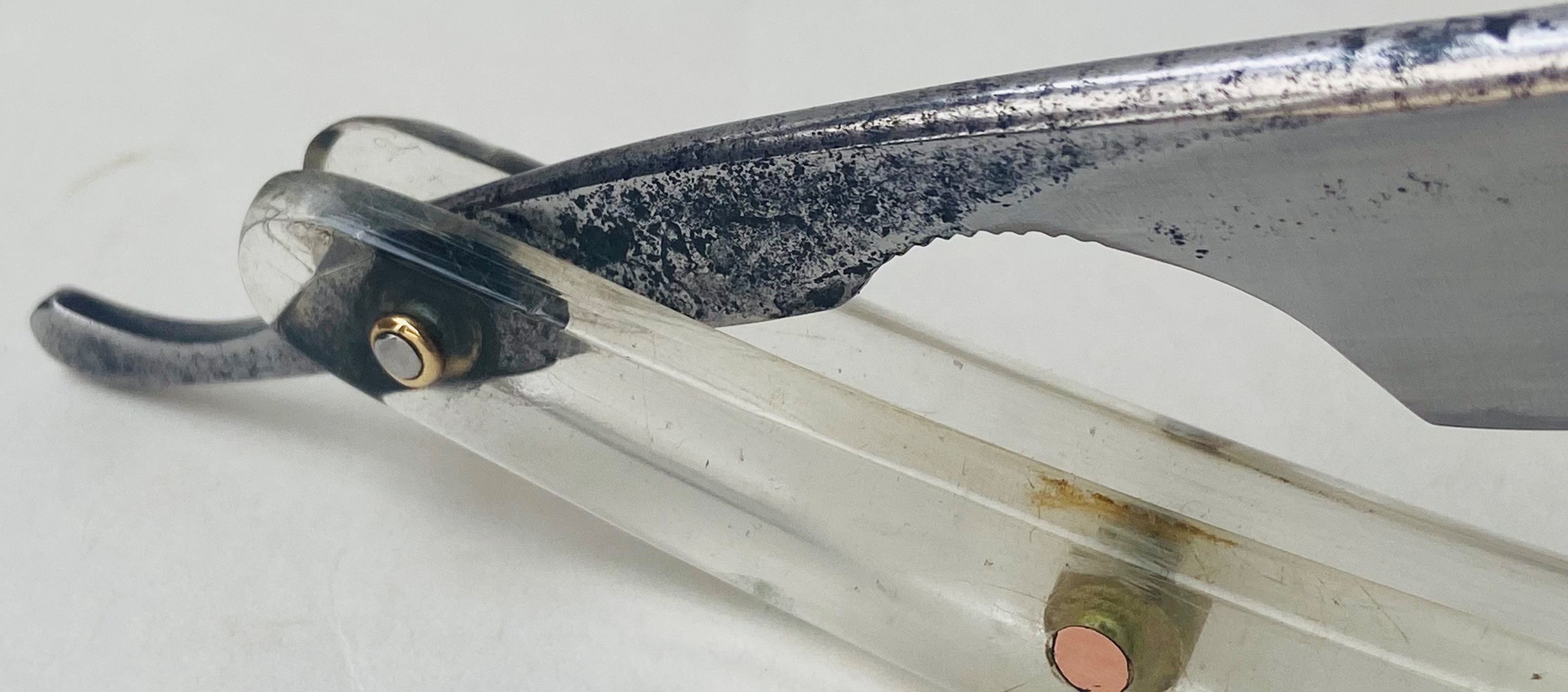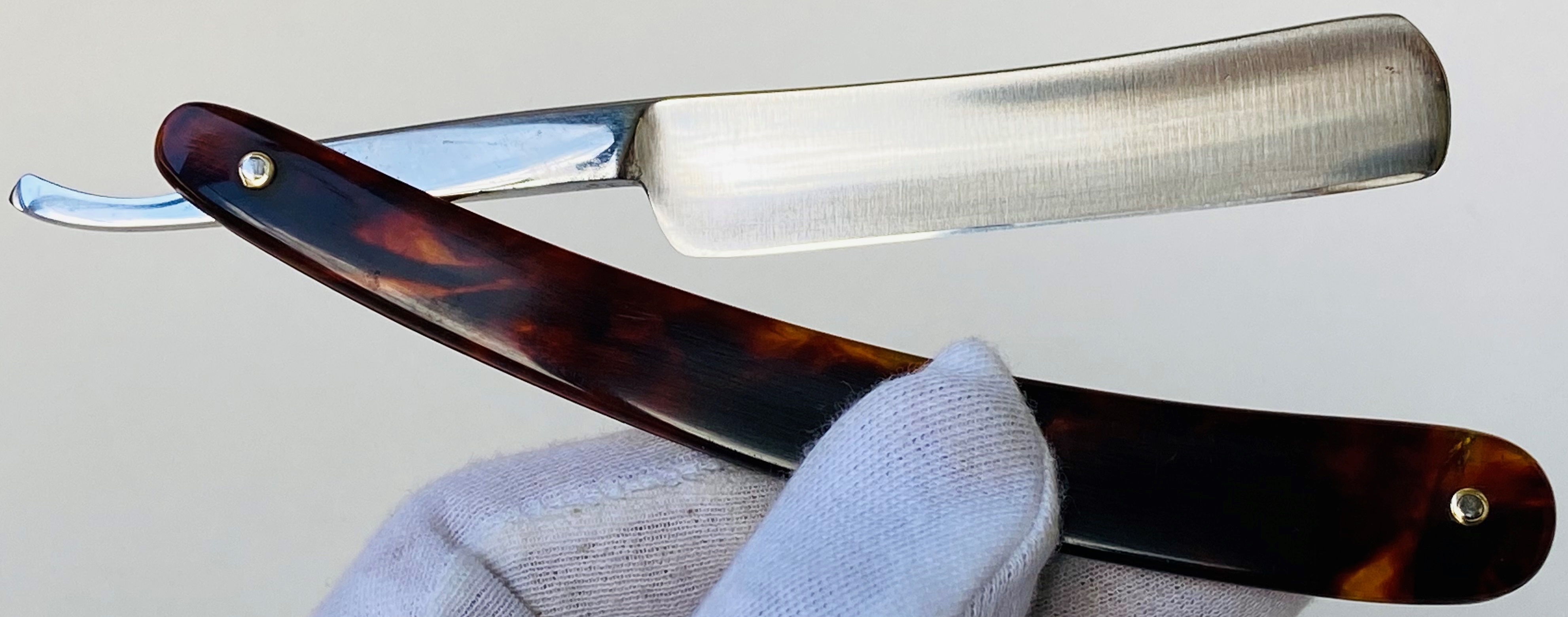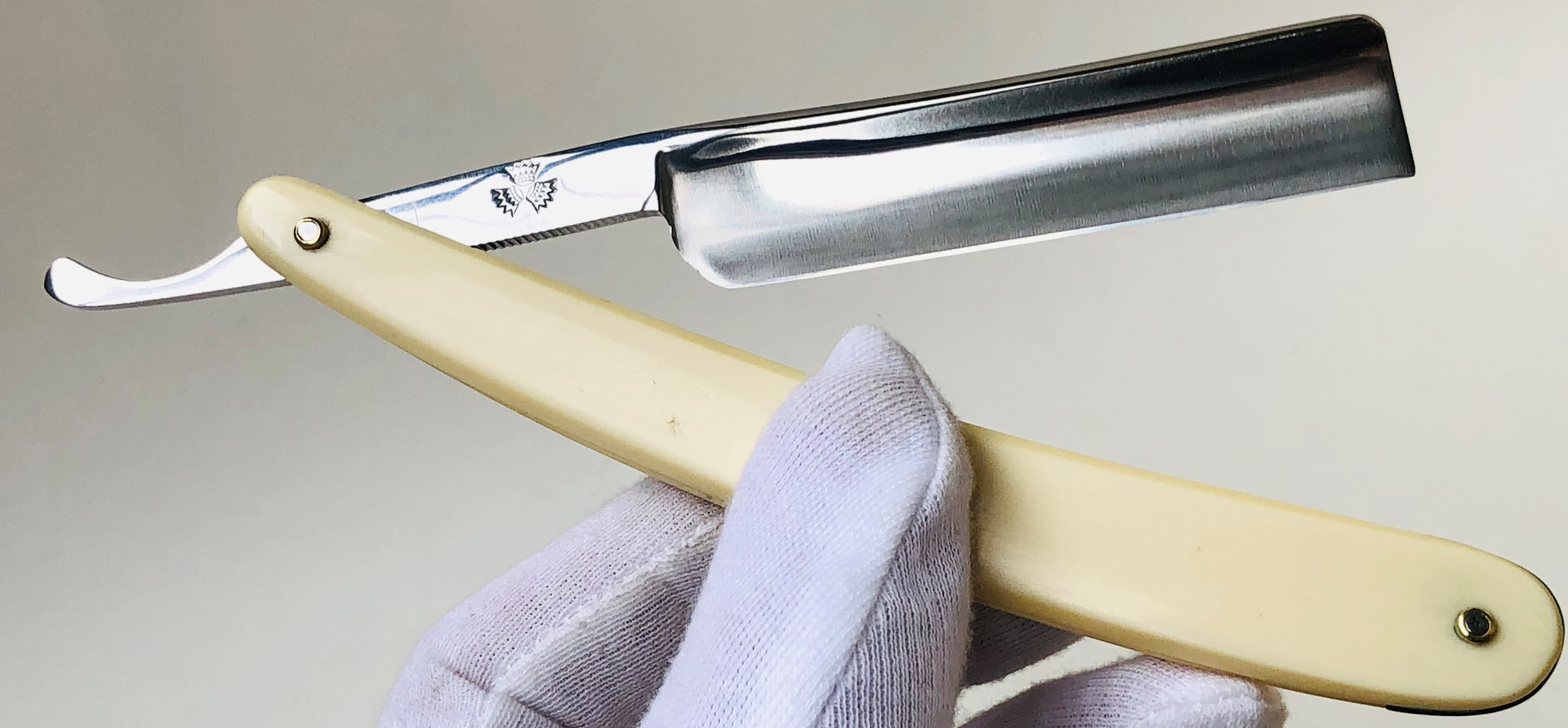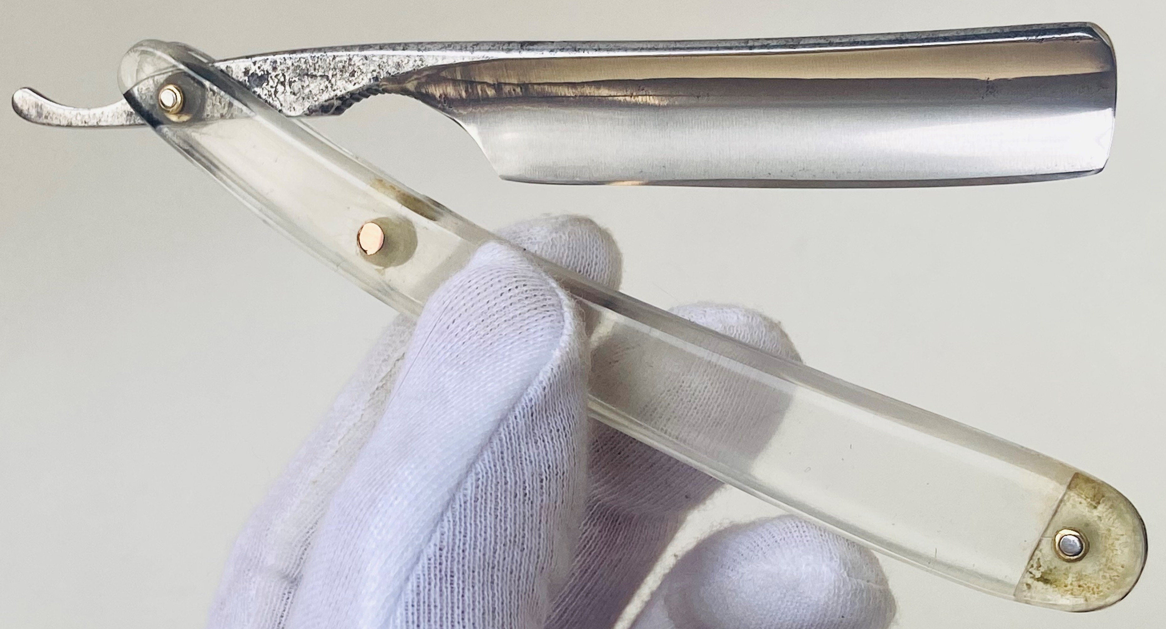Был у меня старенький клинок,до которого не доходили руки. Древняя бритва, с достаточно значительными "следами времени", в виде патины и каверн. Полотно было по возможности очищено, а на эрле и обушке все оставил как есть, дабы придать бритве естественный, антикварный вид,соответствующий её приличному возрасту.Старую оправу из оргстекла подобрал под размер клинка.Новые втулки и внутренние шайбы. Заточил и лично протестировал. Тут сталь достаточно твердая, так что на первый раз бритьё прошло с элементом агрессии,но все чисто и без раздражения.В общем и целом неплохая и совершенно недорогая бритва,со "следами времени". Заточена и готова к бритью.